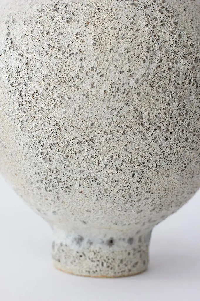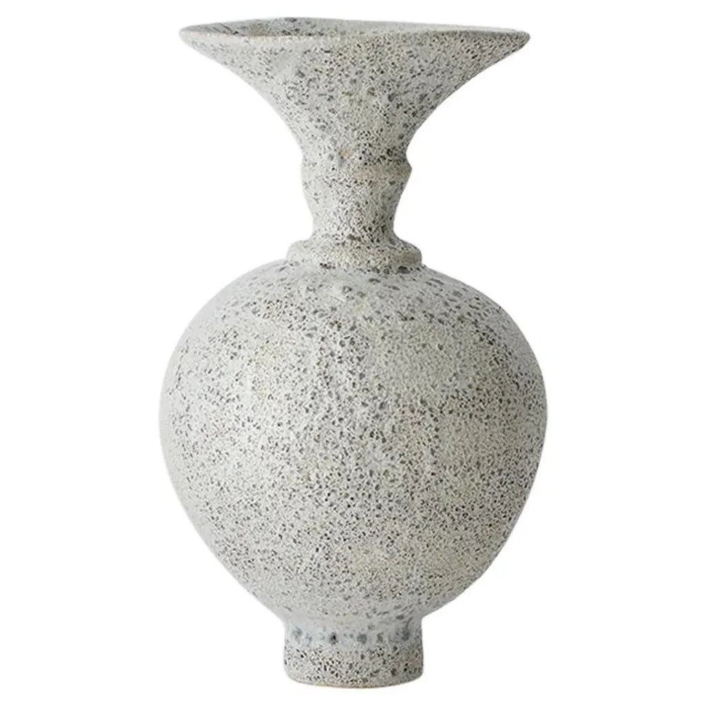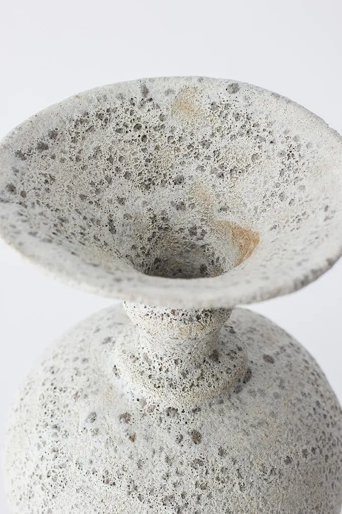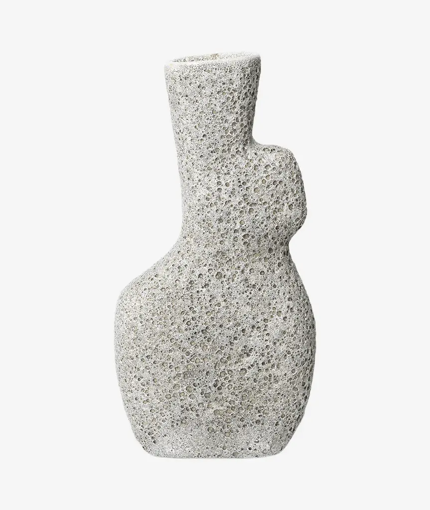 Anfora stoneware vase by Raquel Vidal and Pedro PazGranitoDimensions: 28.5 x 16 cmMaterials: Hand sculpted, glazed pottery?The pieces are handbuilt white stoneware with grog, and brushed with experimental glazes mix and textured surface, resulting in slight variations with each piece. No watertight. Made in Valencia, Spain.Raquel Vidal and Pedro Paz craft pottery and jewelry that seeks to preserve ancient techniques and aesthetics. Their work is defined by a deep respect for materials, metal and clay being the primary raw materials with which they work. Both of these elements have been used since the beginning of humanity to not only make tools and supplies but also for creating objects to contemplate and connect with our bodies and environment. Pottery and jewelry have worked together in each society’s development, mutating and showing the interests, needs and concerns of a given era.Raquel and Pedro believe these ancient arts also help us understand our ancestors, get closer to them and experience how they felt materials and shapes. The material connections between metal and clay are also of interest. Both materials have long and slow production processes and an intimate connection with fire, a somewhat rebel and magic element, that humanity has always craved to control.This belief that materials and the processes applied to them can transform the artist into a restorer of old sensibilities is foundational for Raquel and Pedro. Every piece is crafted slowly and methodically, there is no rushing in the process, and with a respect for the natural worl's own "will" to produce its own results.