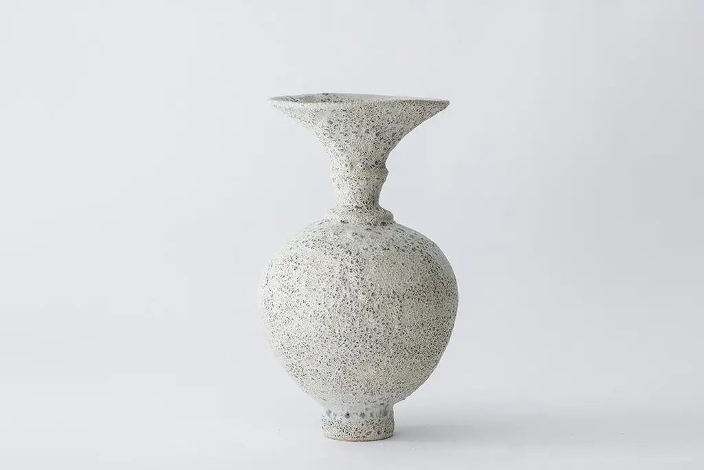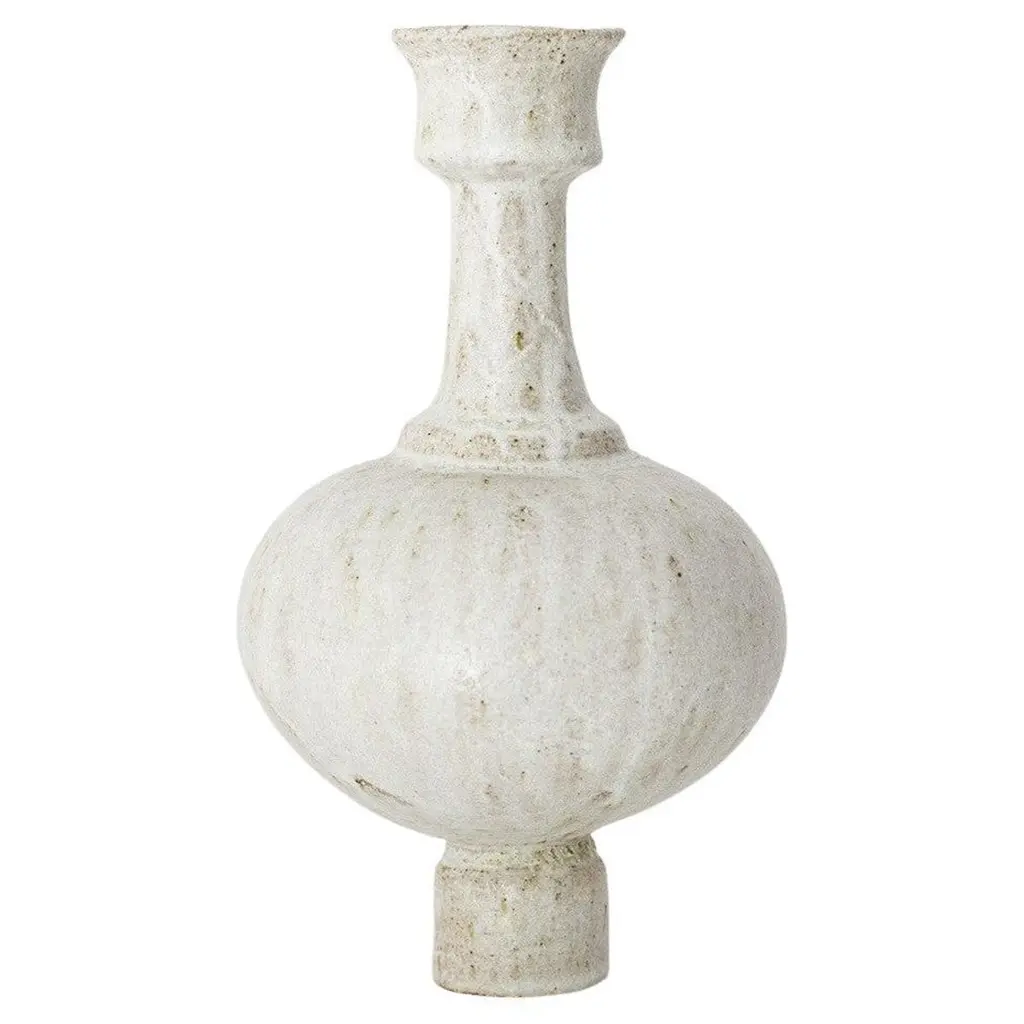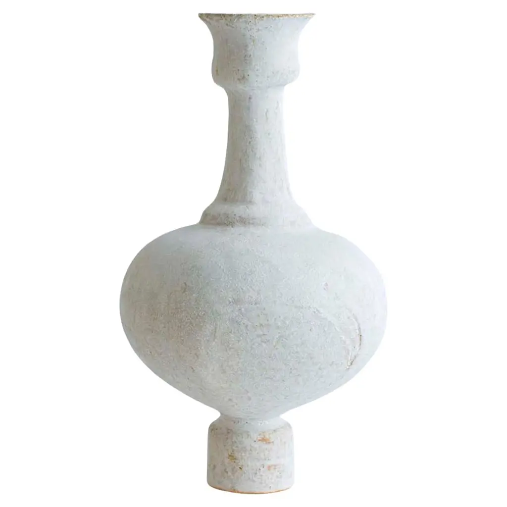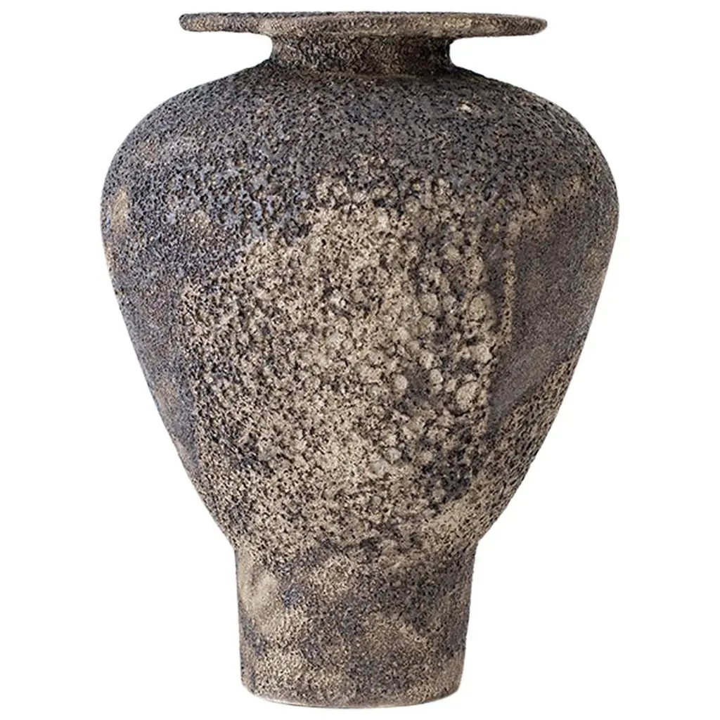 Anfora stoneware vase by Raquel Vidal and Pedro PazGranitoDimensions: 28.5 x 16 cmMaterials: Hand sculpted, glazed pottery?The pieces are handbuilt white stoneware with grog, and brushed with experimental glazes mix and textured surface, resulting in slight variations with each piece. No watertight. Made in Valencia, Spain.Raquel Vidal and Pedro Paz craft pottery and jewelry that seeks to preserve ancient techniques and aesthetics. Their work is defined by a deep respect for materials, metal and clay being the primary raw materials with which they work. Both of these elements have been used since the beginning of humanity to not only make tools and supplies but also for creating objects to contemplate and connect with our bodies and environment. Pottery and jewelry have worked together in each society’s development, mutating and showing the interests, needs and concerns of a given era.Raquel and Pedro believe these ancient arts also help us understand our ancestors, get closer to them and experience how they felt materials and shapes. The material connections between metal and clay are also of interest. Both materials have long and slow production processes and an intimate connection with fire, a somewhat rebel and magic element, that humanity has always craved to control.This belief that materials and the processes applied to them can transform the artist into a restorer of old sensibilities is foundational for Raquel and Pedro. Every piece is crafted slowly and methodically, there is no rushing in the process, and with a respect for the natural worl's own "will" to produce its own results.