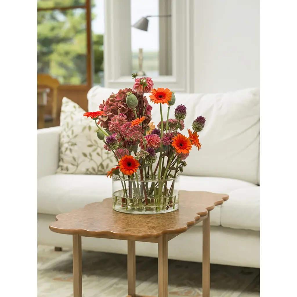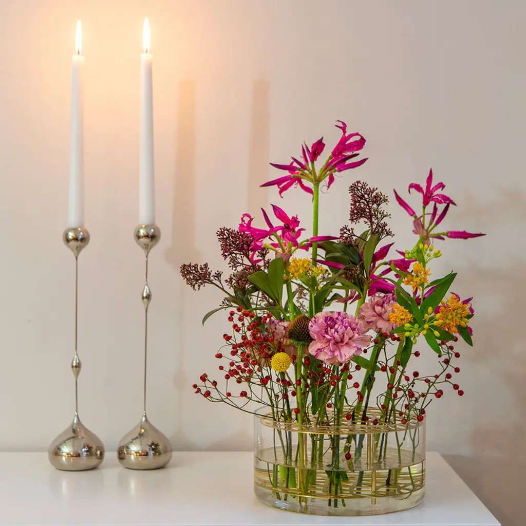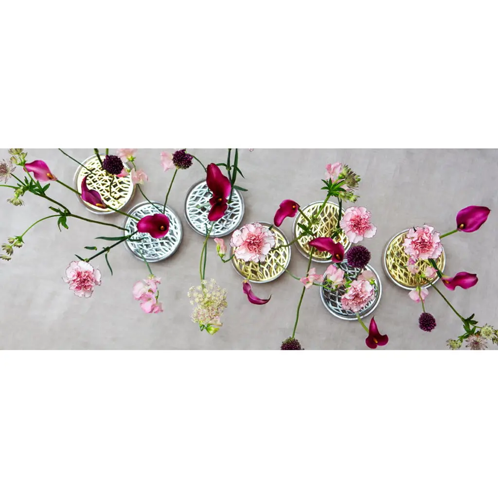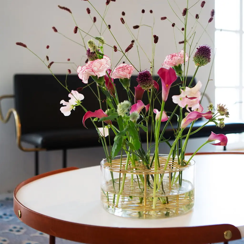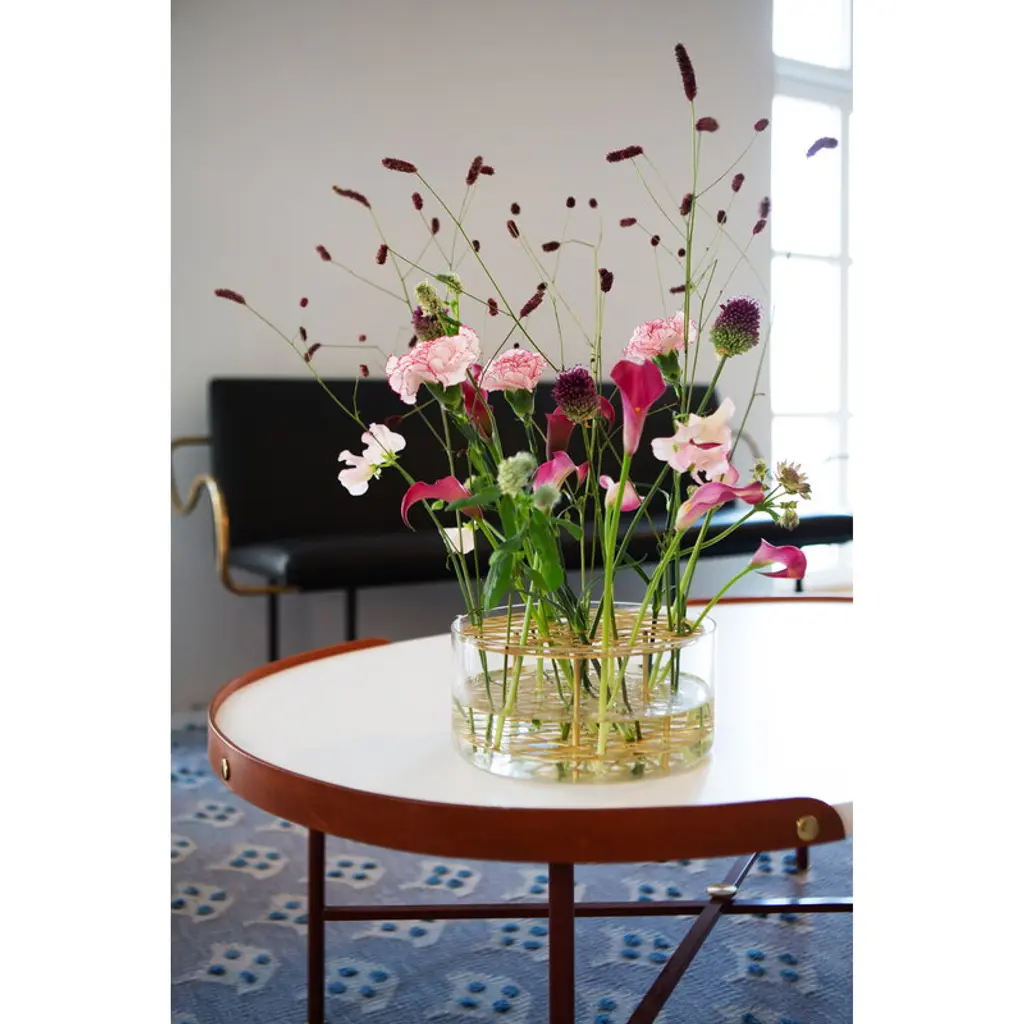 Klong’s Äng, designed by Eva Schildt, is an intriguing vase that makes creating flower arrangements easy. The name Äng, Swedish for meadow, refers to the way flowers stand in the vase: the double-tiered brass frame separates the stems and holds them upright. The beautiful frame rests in a cylinder-shaped bowl that is made of blown glass. Create an urban flower meadow in your home with the delightful Äng vase or have it on display as a sculptural design object.