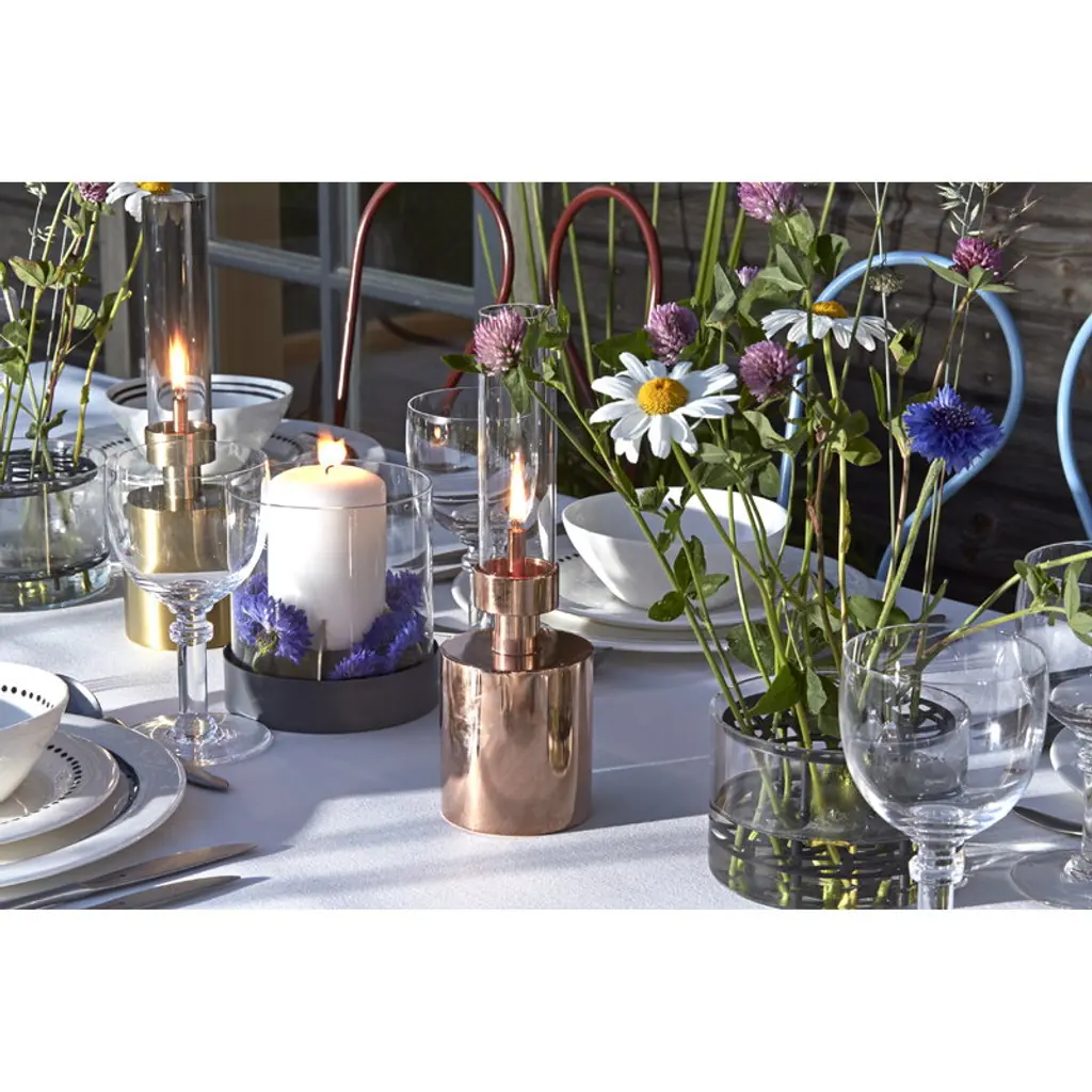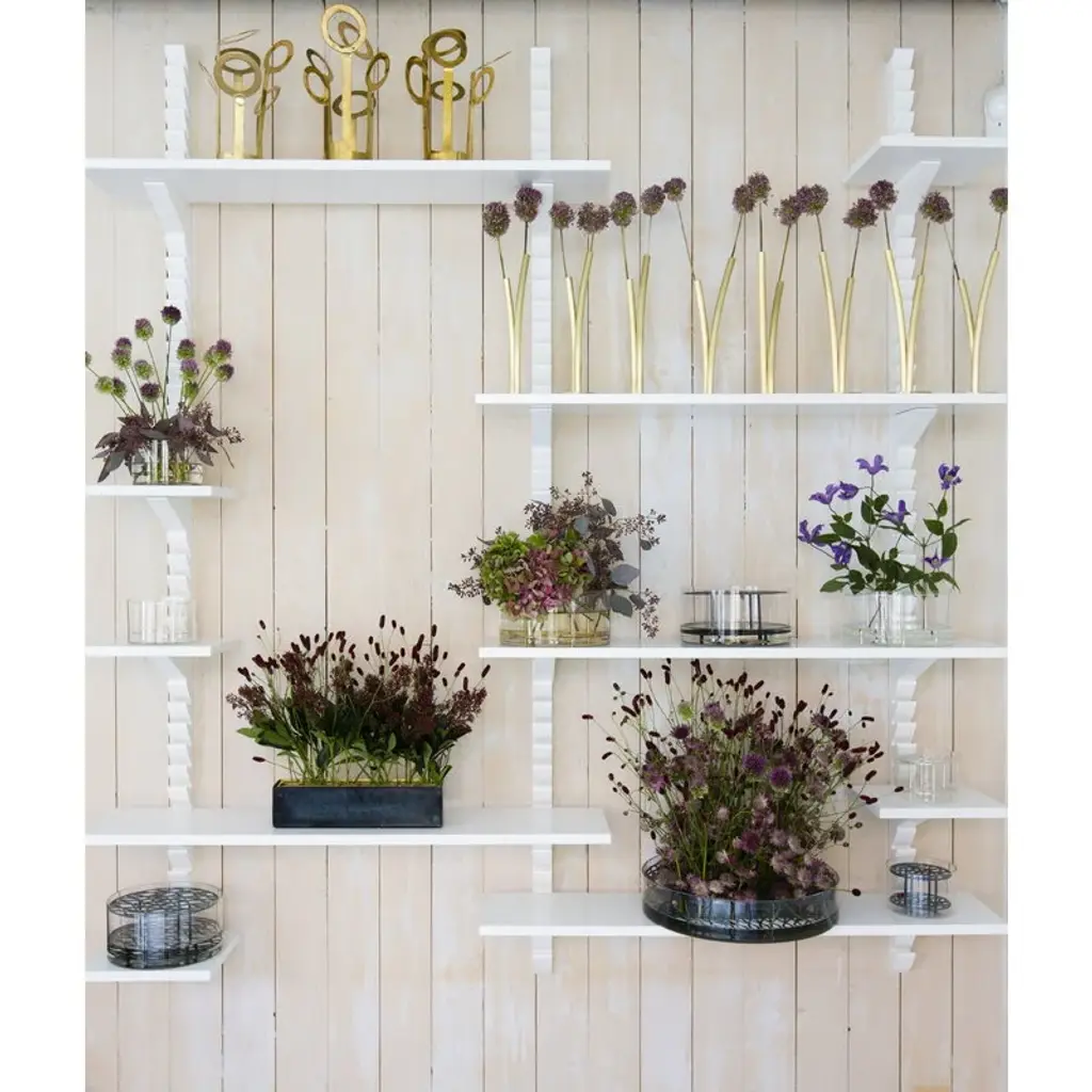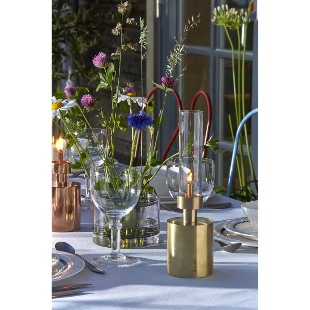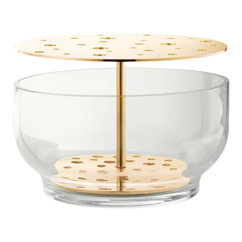 Klong’s Äng, designed by Eva Schildt, is an intriguing vase that makes creating flower arrangements easy. The name Äng, Swedish for meadow, refers to the way flowers stand in the vase: the double-tiered brass frame separates the stems and holds them upright. The beautiful frame rests in a cylinder-shaped bowl that is made of blown glass. Create an urban flower meadow in your home with the delightful Äng vase or have it on display as a sculptural design object.