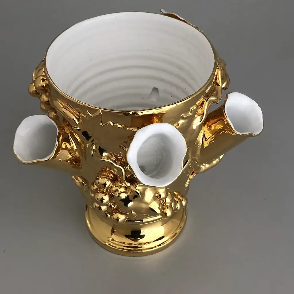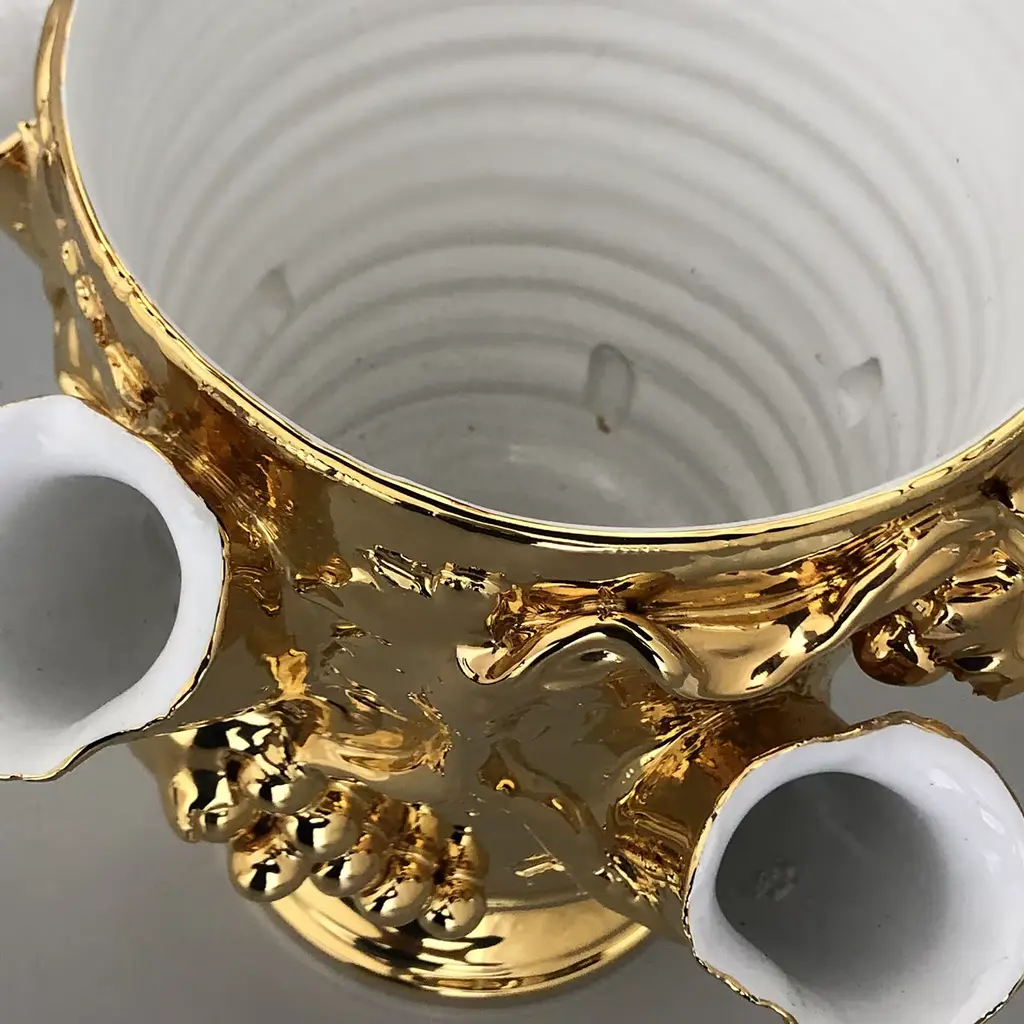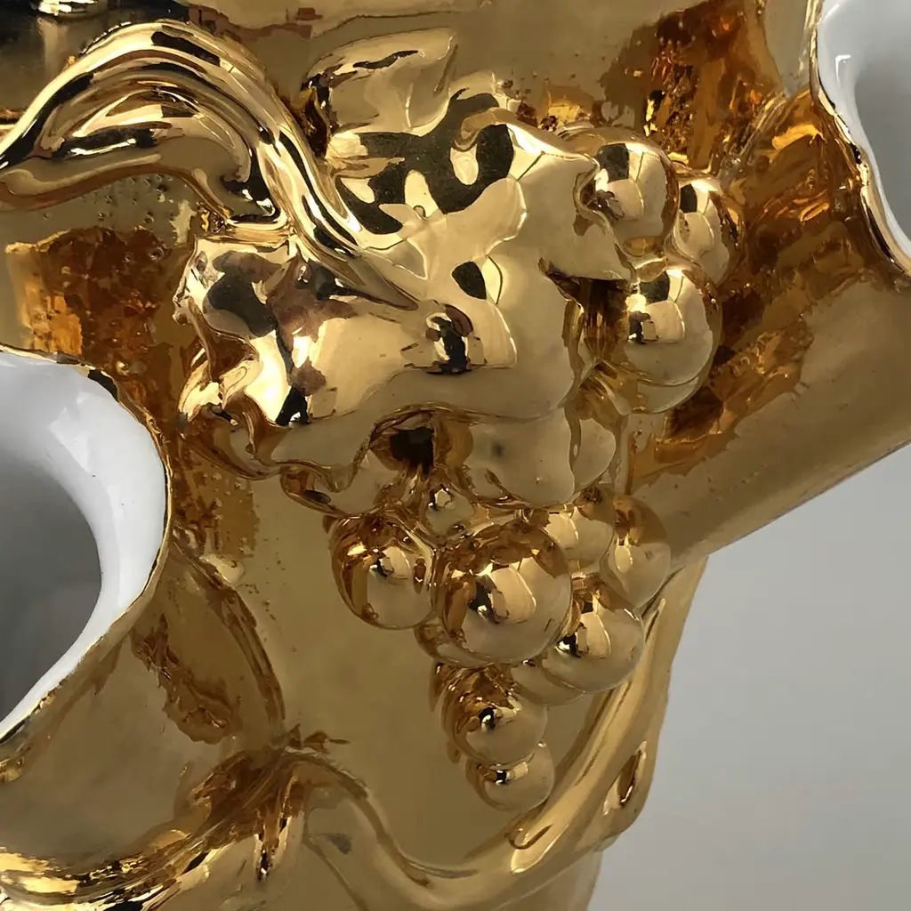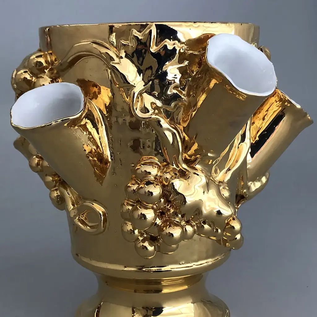 The stunning Anghiari Vase features 5 openings with a large central vase and has been handturned in white terracotta and meticulously shaped by hand. Inspired by an ancient 19th century vase found in the family country home, it is finished in a gold glaze with irregularities in the tendrils and grapes design, attesting to its authenticity.