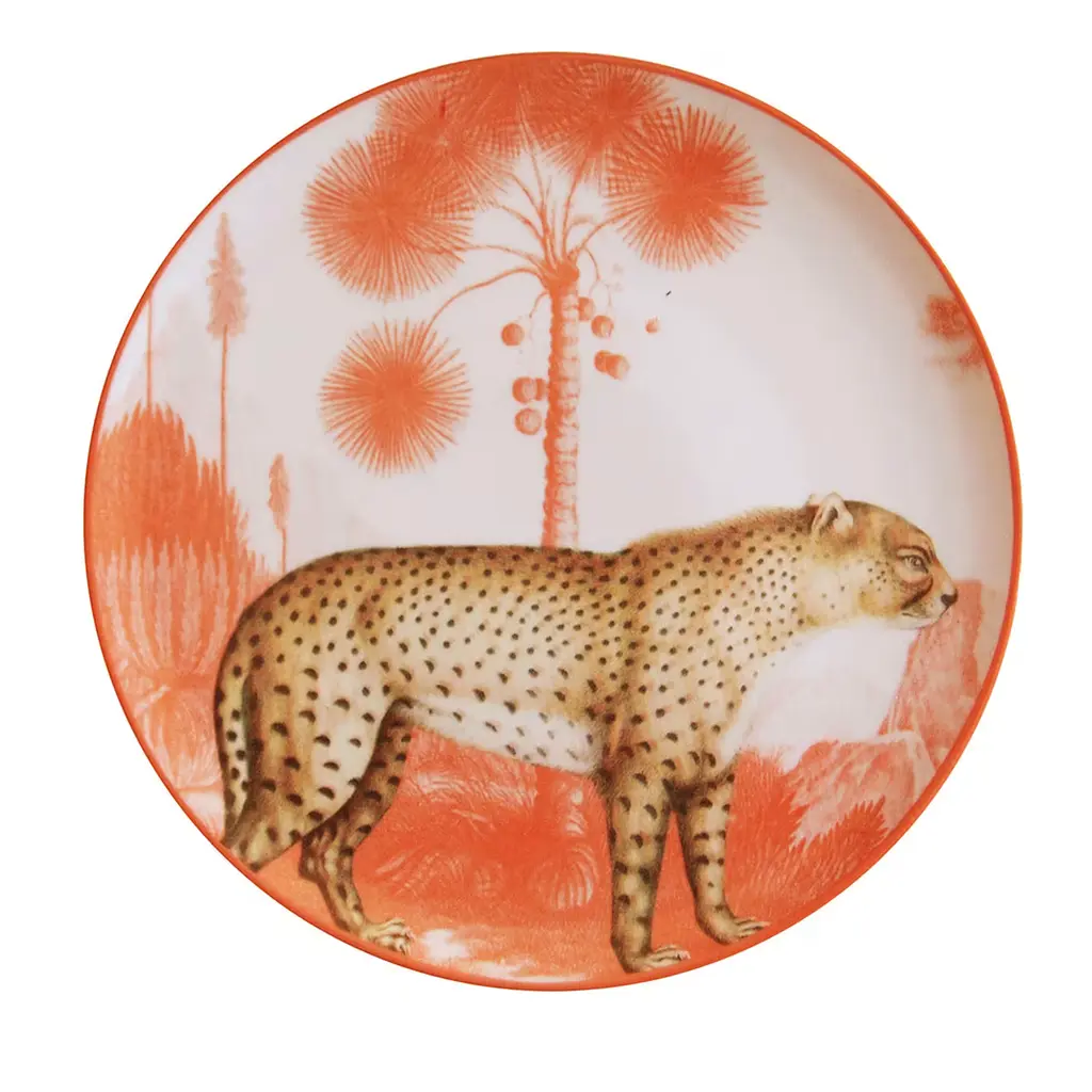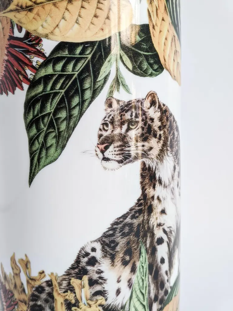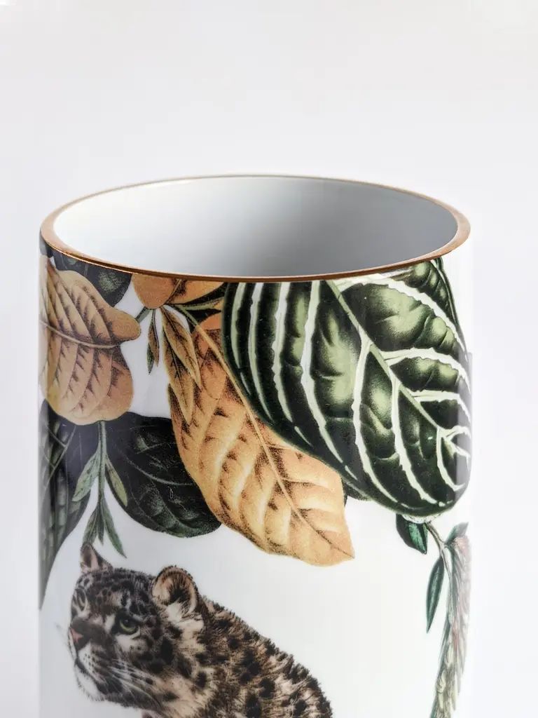 This splendid porcelain vase depicts a majestic leopard in striking realism amidst tropical fauna in burgundy red and dark green. Part of the Animalia series from the Grand Tour Collection by artist Vito Nesta, this piece will superbly adorn any traditional or contemporary home.
