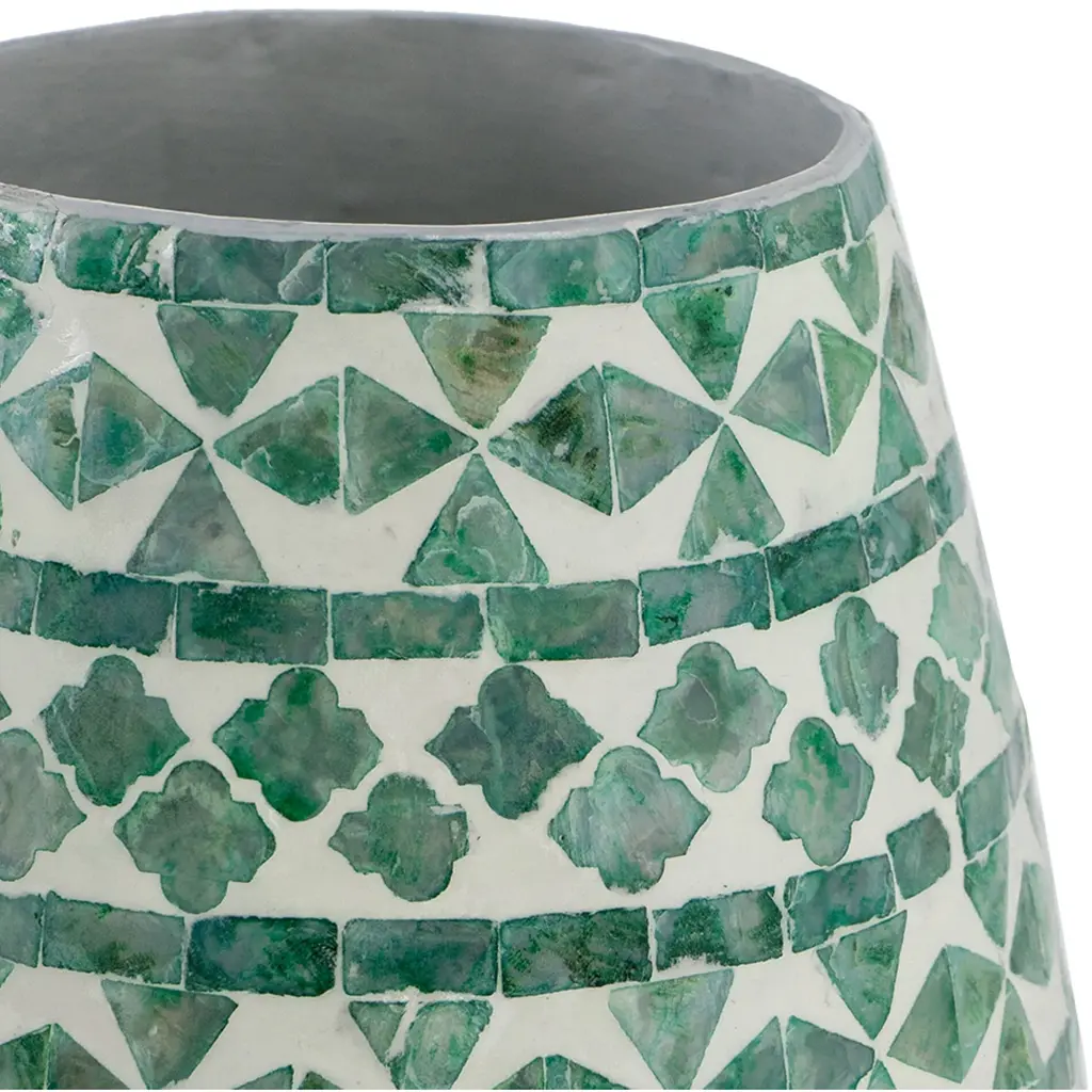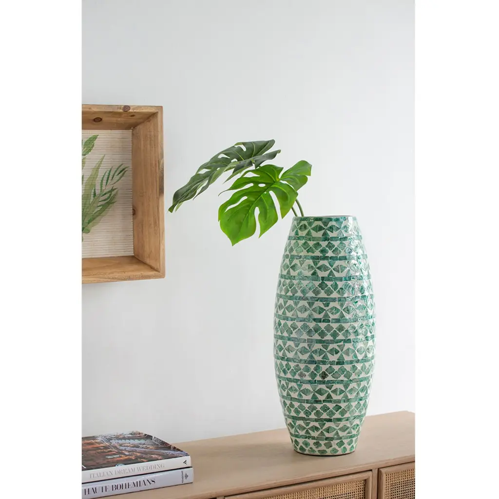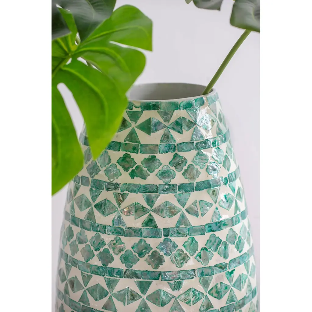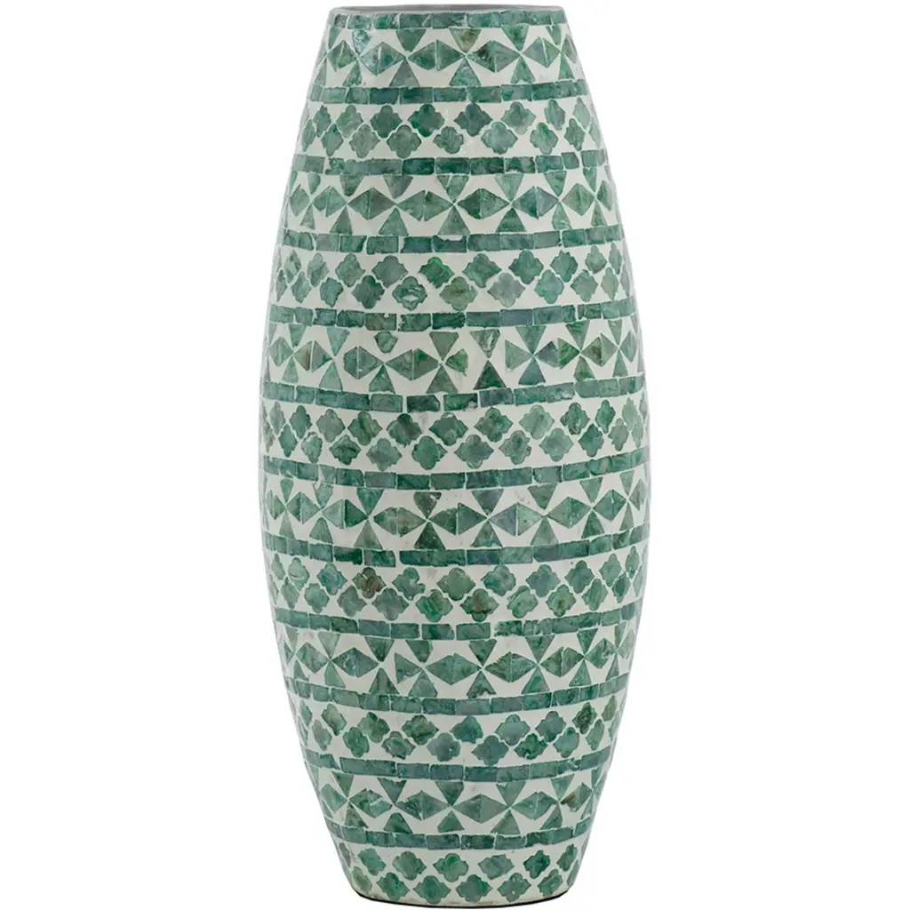 Tall and tempting, this green Capiz vase makes an exquisite bohemian accent for a living room, dining room or entryway. Geometric patterning and the Capiz inlay bring visual texture to the understated frame. The height gives this vase a graceful presence, making it a striking addition to any surface.