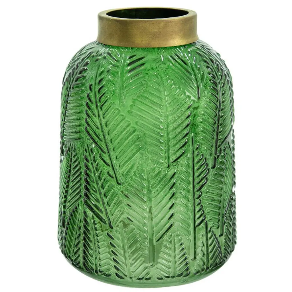 With its unique design, vibrant color, and crisp gold accent, the 6" Green Fern Leaf Glass Vase adds an eye-catching, vintage look to any room. Feature this bold vase on an entryway table, living room mantle, or office shelf for a touch of natural beauty and shine. This vase looks stunning alone or combined with other Green Fern Leaf Glass Vases for a cohesive, dynamic look that fits any space.