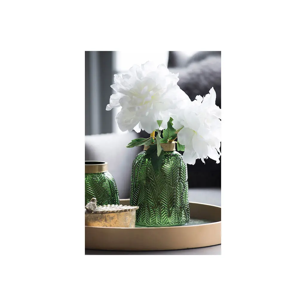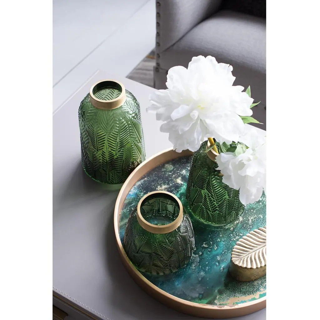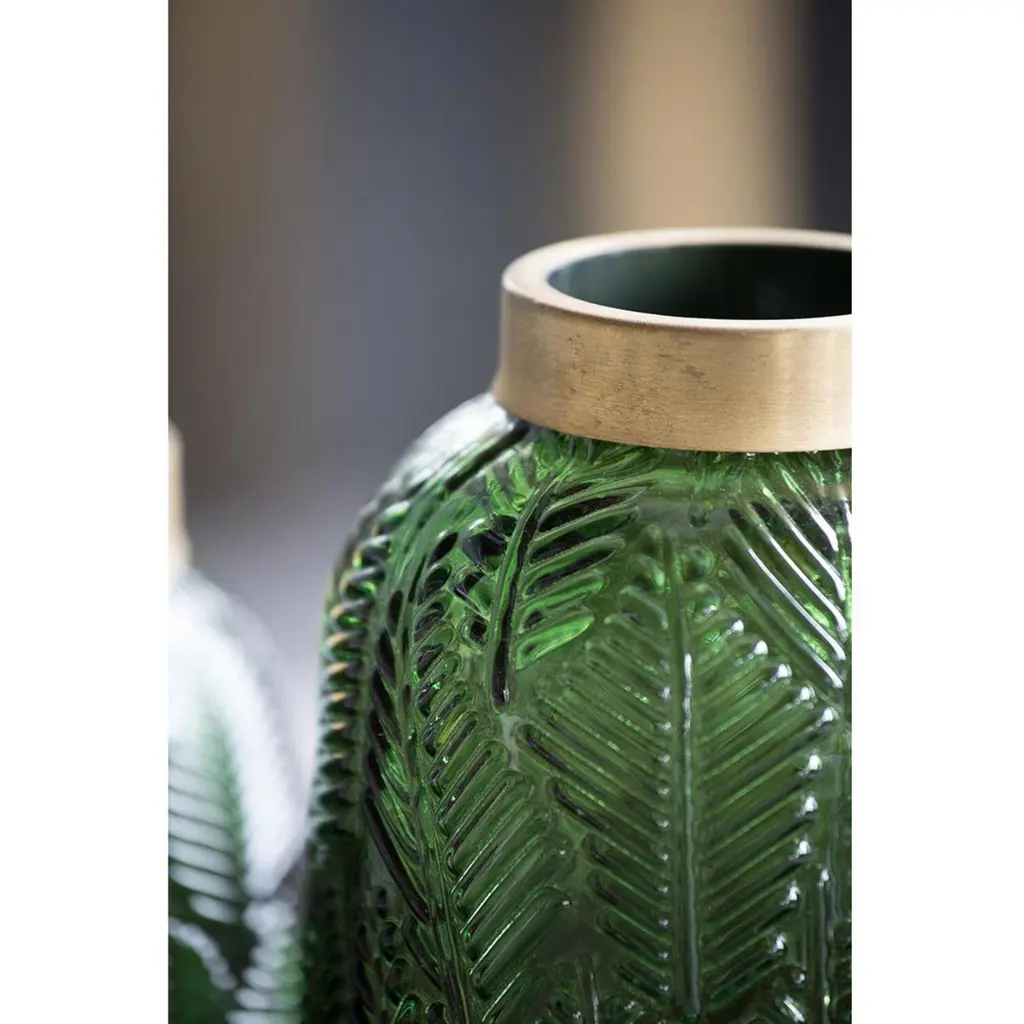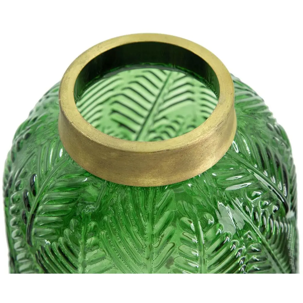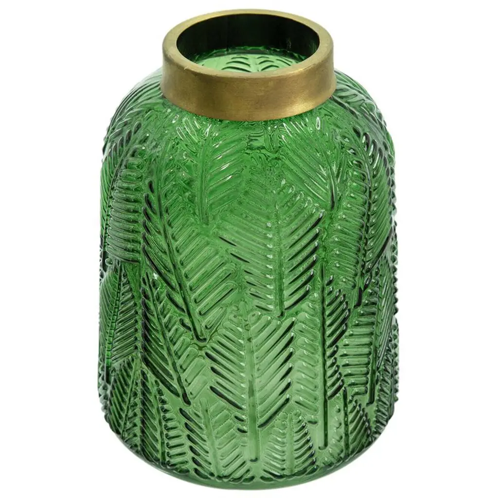 With its unique design, vibrant color, and crisp gold accent, the 8" Green Fern Leaf Glass Vase adds an eye-catching, vintage look to any room. Feature this bold vase on an entryway table, living room mantle, or office shelf for a touch of natural beauty and shine. This vase looks stunning alone or combined with other Green Fern Leaf Glass Vases for a cohesive, dynamic look that fits any space.