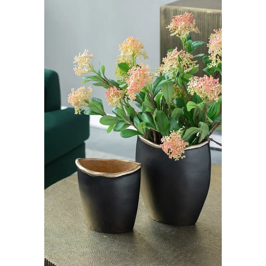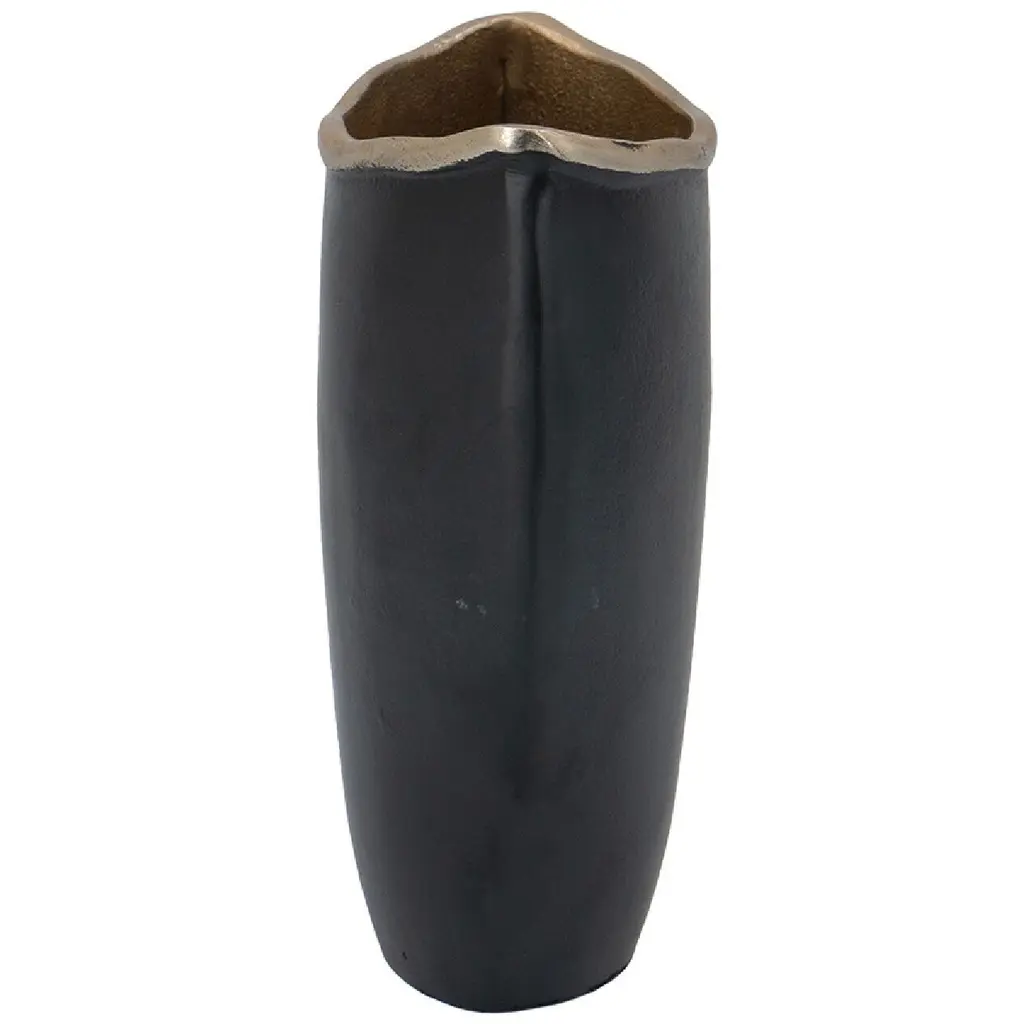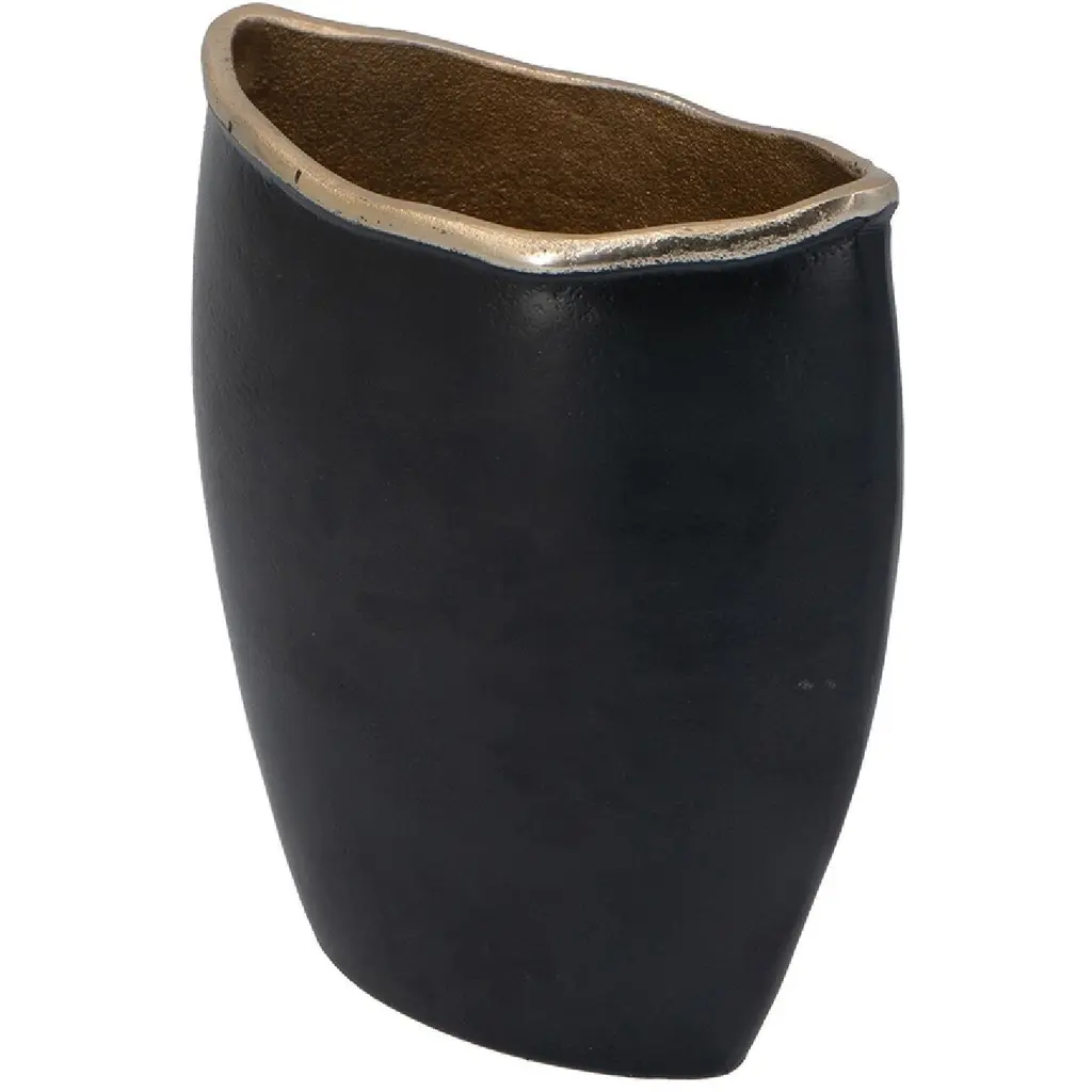Crafted from premium aluminum, this decorative black and gold flower vase showcases a sculptural silhouette and a unique curved rim that simply begs to be admired. An ideal size to thrive on your dining room table, atop your living room mantel, or in your entryway, this piece can be displayed either empty or as a vessel for a colorful flower arrangement.