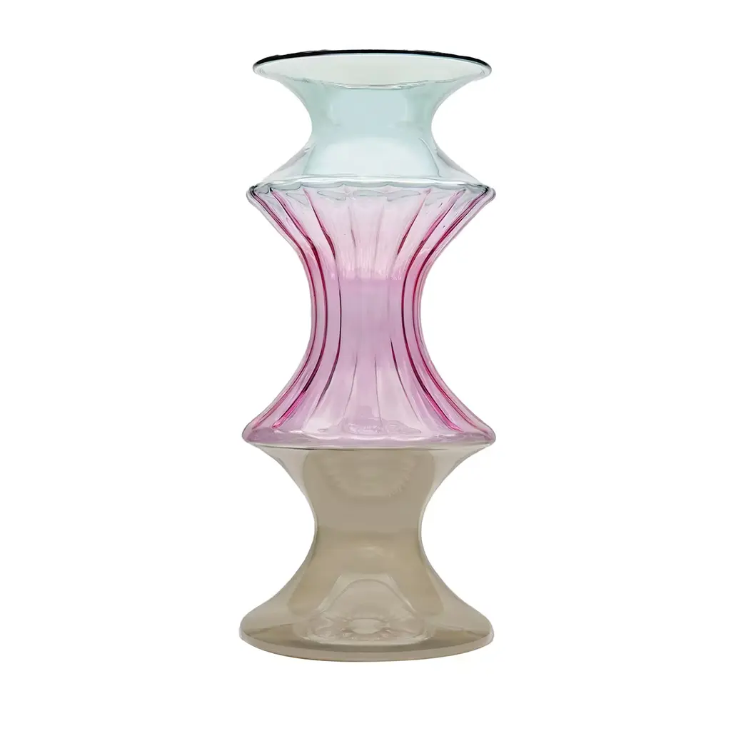 A splendid showcase of craftsmanship, this stunning, luminous vase is reminiscent of the classic silhouette of an amphora. It is composed of a bell-shaped base fashioned of clear glass, and elegantly contrasting the white opaque glass of the round and capacious body. The top with flared rims recalls the bell shape of the base.