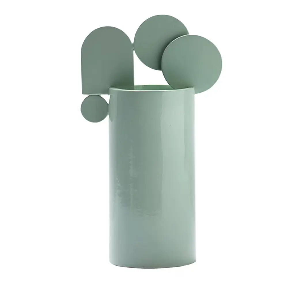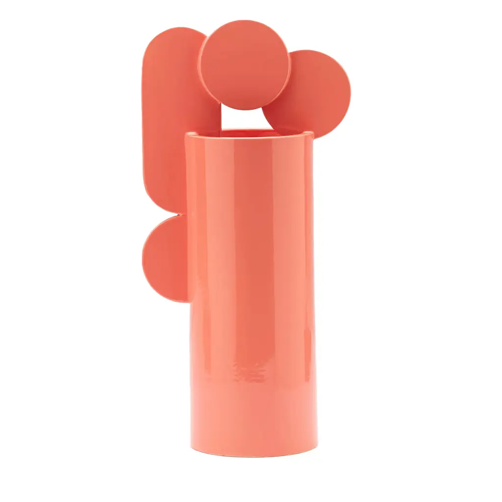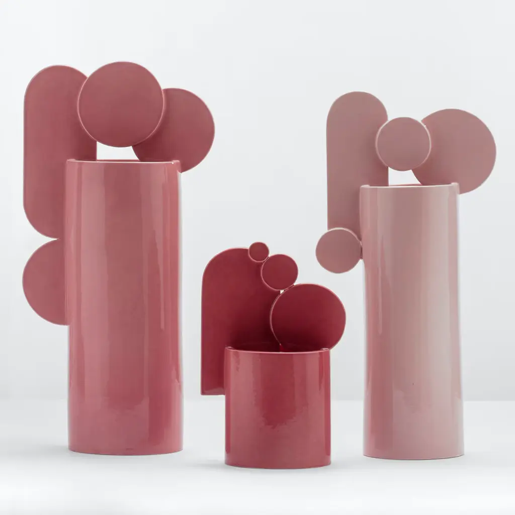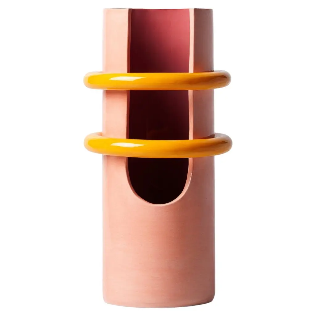 Part of the Bubble Family Collection, this glamorous ceramic vase pays tribute to the eccentric flair of the iconic Memphis Group designed by Ettore Sottsass in 1980. The vase's cylindrical silhouette, enameled in vibrant pink, is enriched with arched and circular elements lending the design a distinctly contemporary charm.