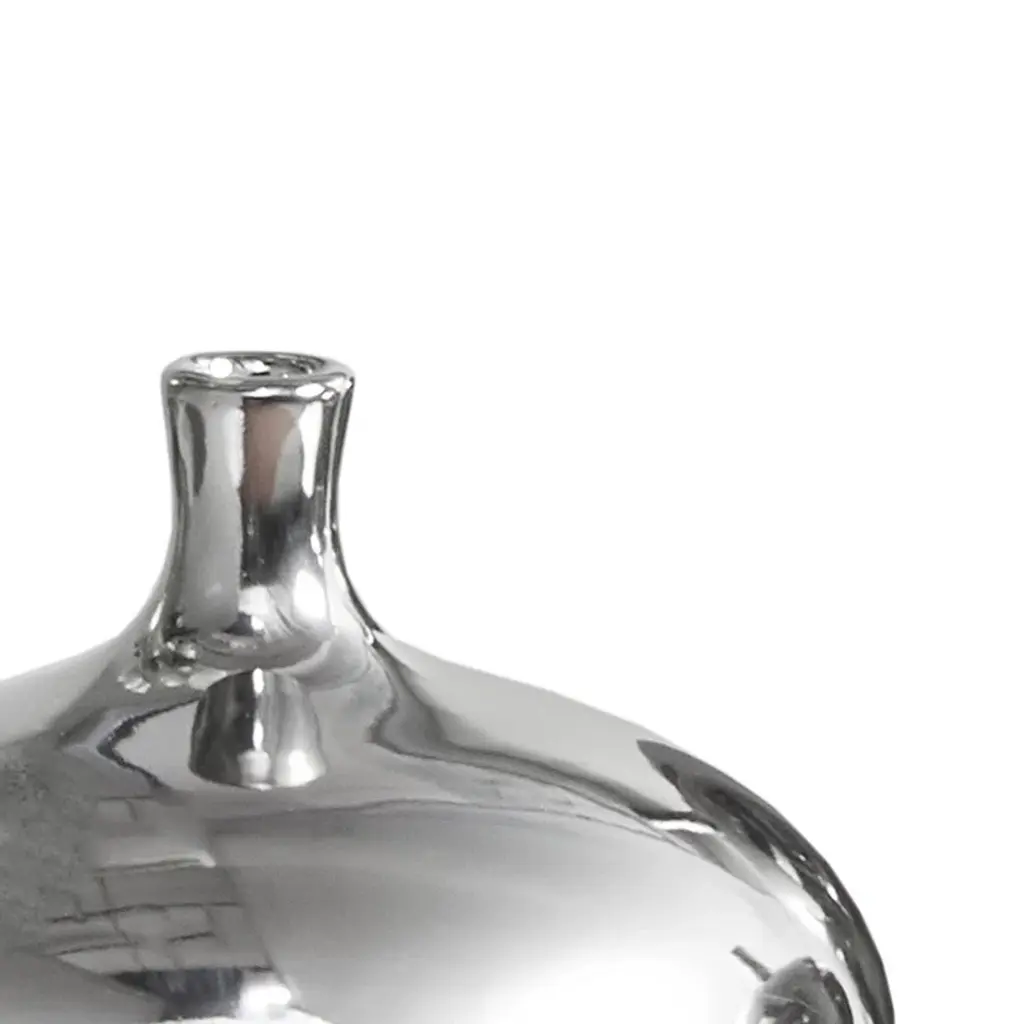 Add an elegant touch to your home with this three-piece set of novelty-shaped ceramic vases. Handcrafted and boasting a lustrous metallic silver finish, these vases effortlessly enhance any table or shelf. The varying shapes and sizes create a coordinated look while offering versatility in display options. Place them together as a focal point or spread them throughout your space for a stylish touch. Since they're handmade, slight variations in color and weight make each piece truly one-of-a-kind. Enjoy the artistry and charm these vases bring to your decor.