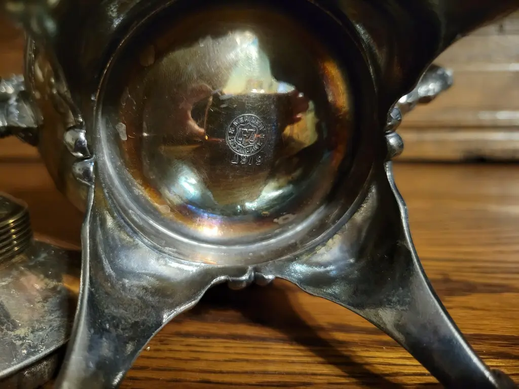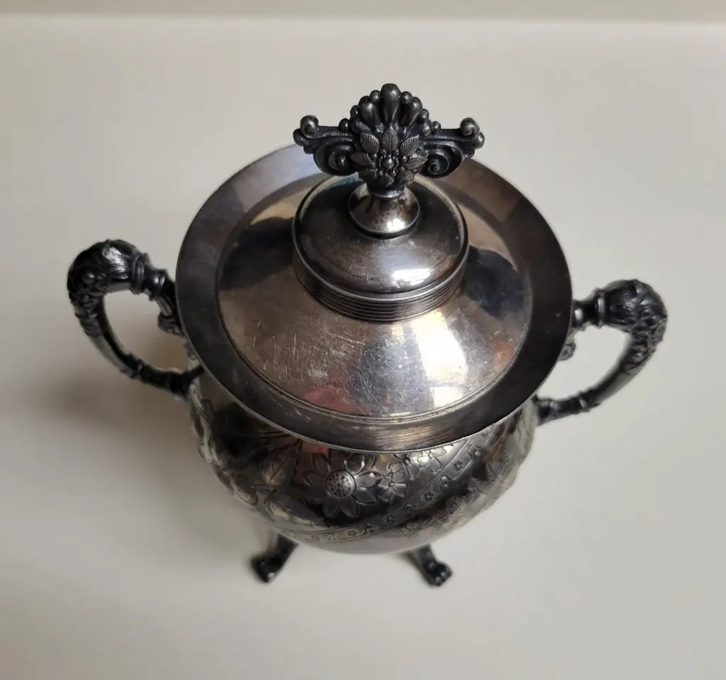 This wonderful piece was made by the Merida Brittania Company in 1919. It measures about 10.5" high and 16" in diameter at the widest part. The piece has no visible damages. The lid fits perfectly.