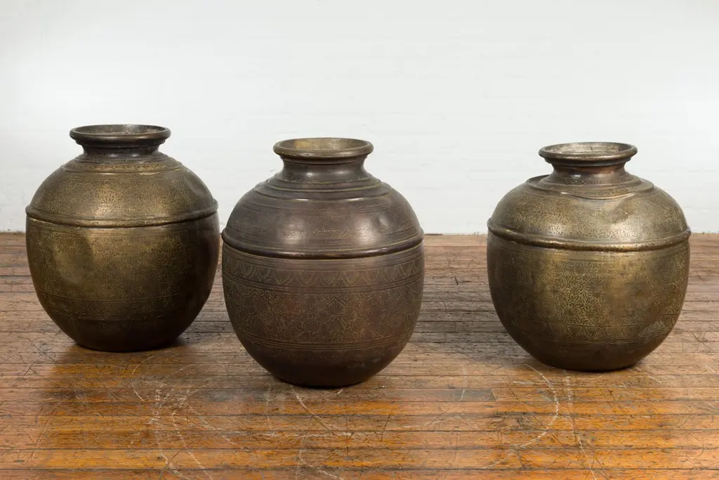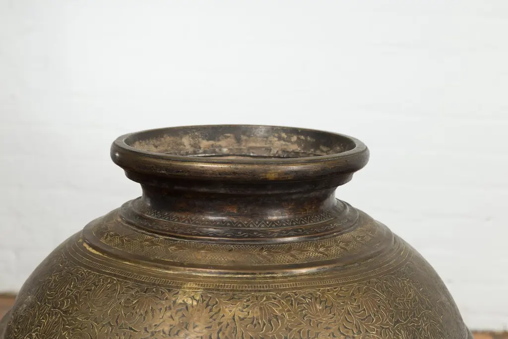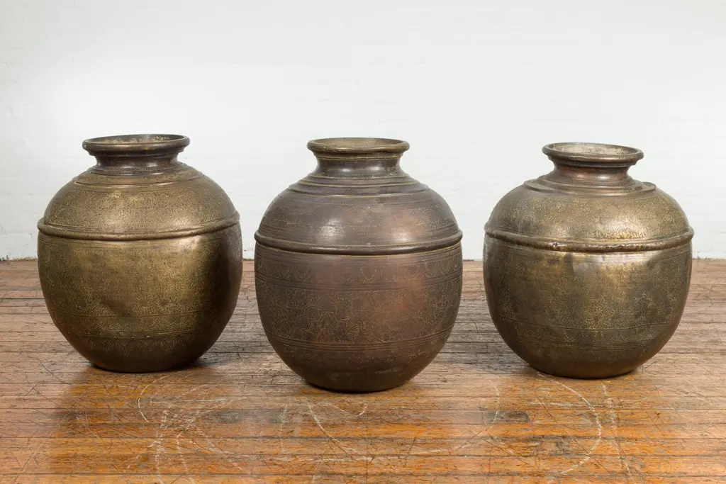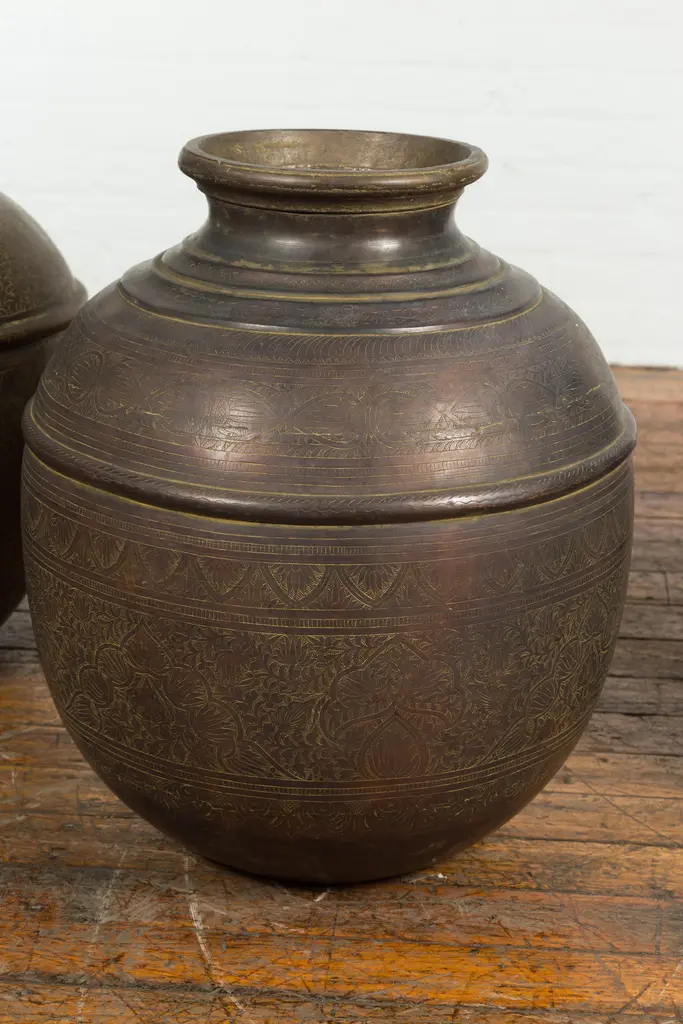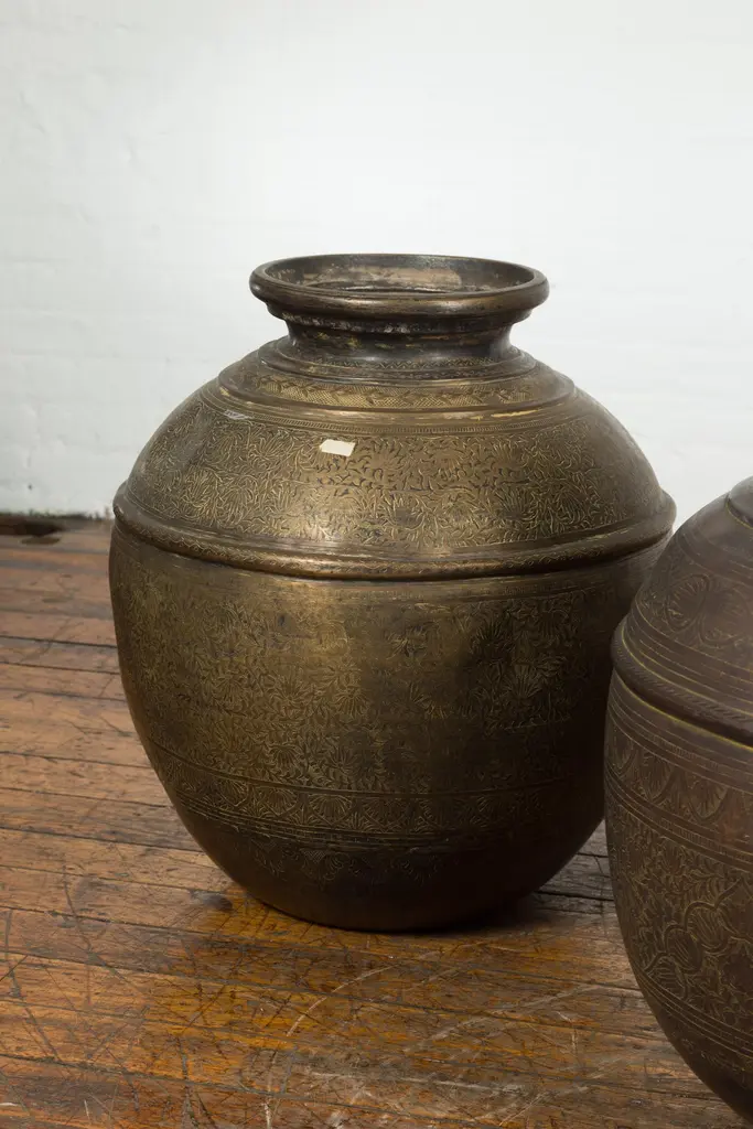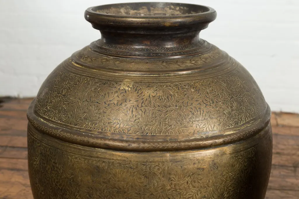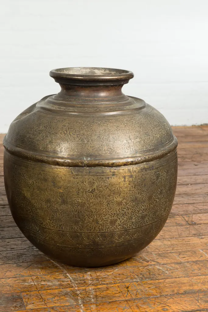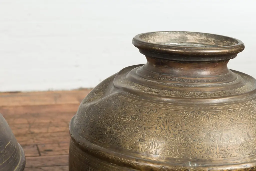 Three antique Indian brass water vessels from the 19th century, with etched floral décor and weathered appearance. We are pricing and selling these individually. Created in India during the 19th century, each of these large brass water vessels would make for an excellent planter or vase. They each feature a circular mouth sitting above a generous body adorned with an abundant etched décor showcasing floral motifs leaving no space empty. Boasting a weathered patina, these antique Indian brass water vessels with etched décor from the 19th century will bring a touch of exotic elegance to any home, perhaps displayed indoors in an entryway or living room, or outdoors under a covered patio!Only One Left In Stock!