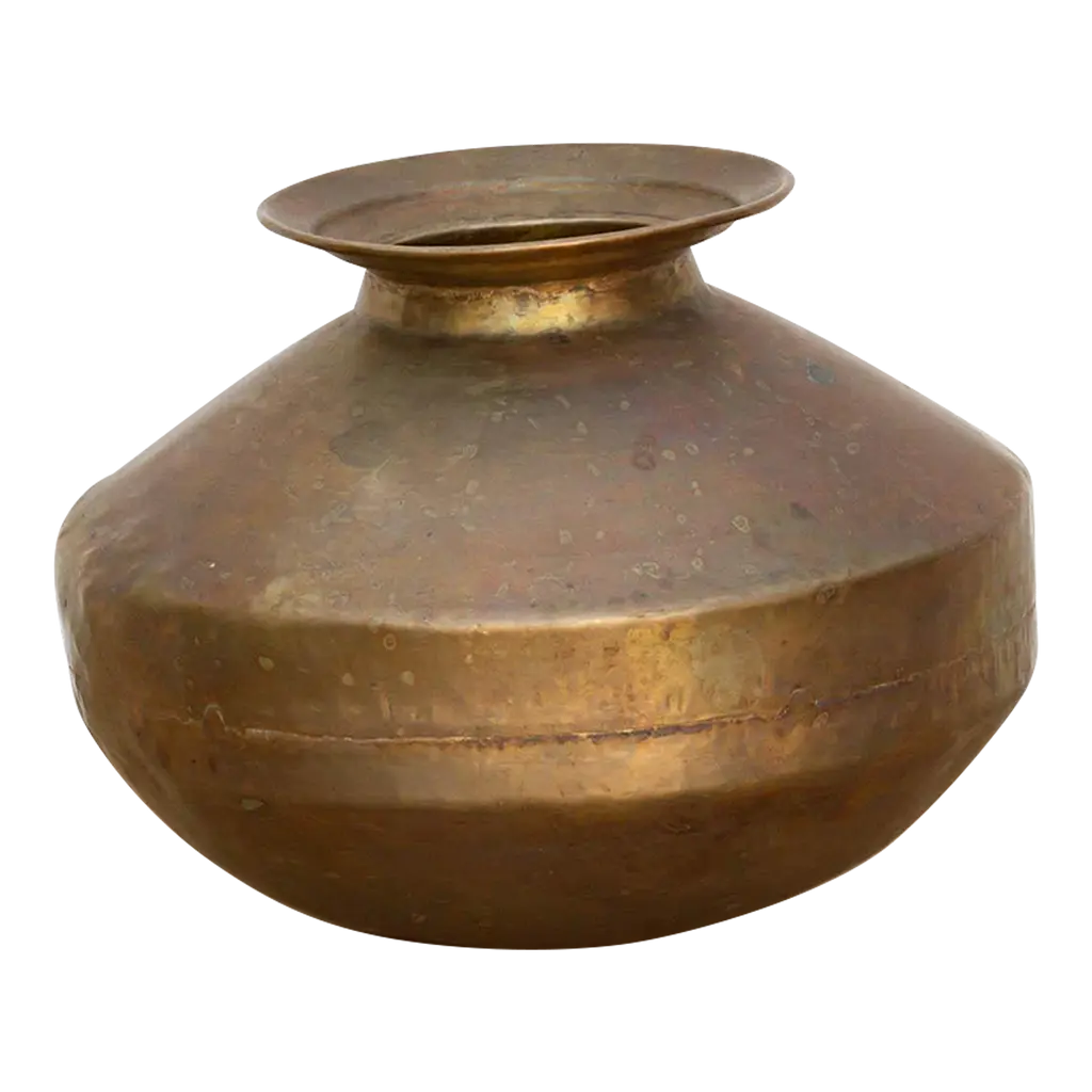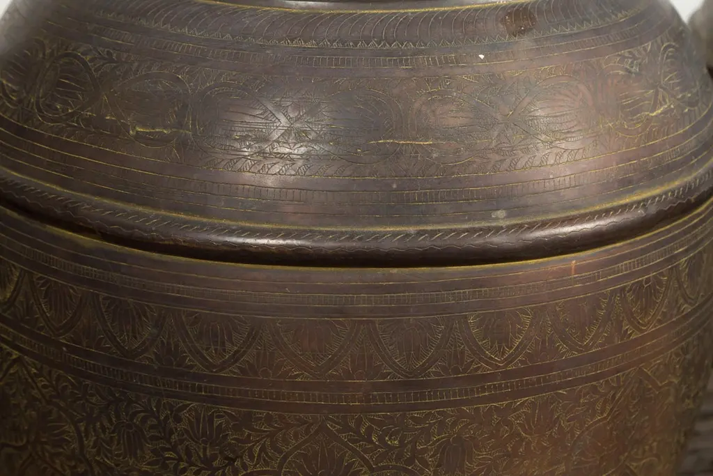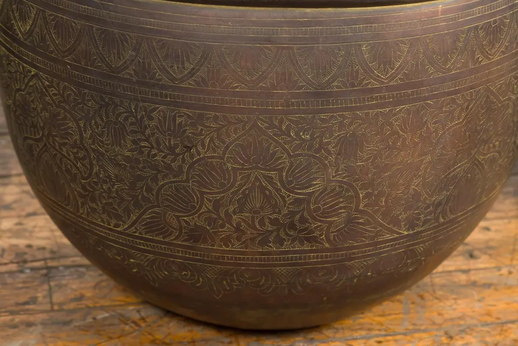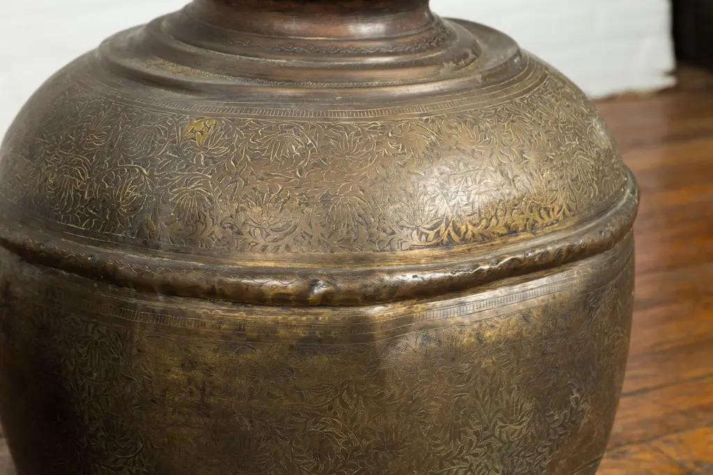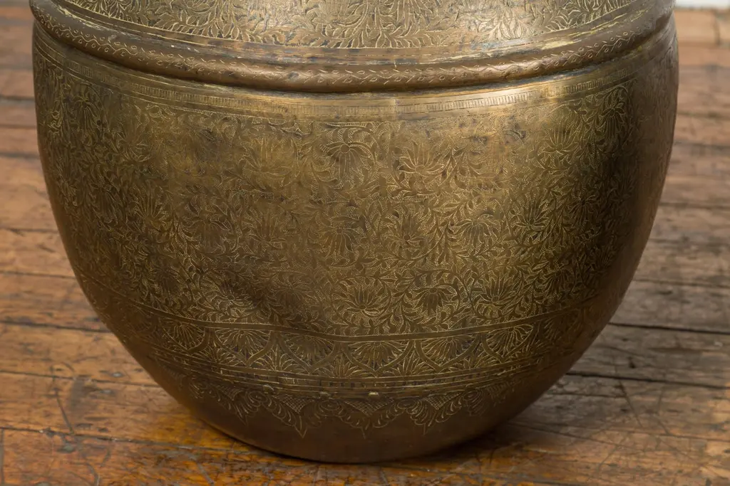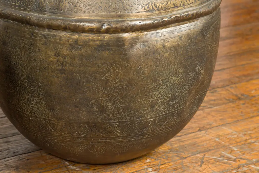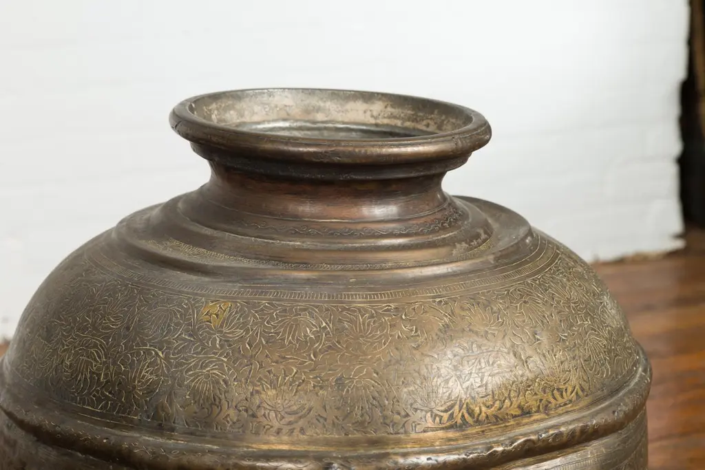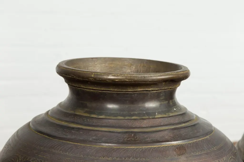 Three antique Indian brass water vessels from the 19th century, with etched floral décor and weathered appearance. We are pricing and selling these individually. Created in India during the 19th century, each of these large brass water vessels would make for an excellent planter or vase. They each feature a circular mouth sitting above a generous body adorned with an abundant etched décor showcasing floral motifs leaving no space empty. Boasting a weathered patina, these antique Indian brass water vessels with etched décor from the 19th century will bring a touch of exotic elegance to any home, perhaps displayed indoors in an entryway or living room, or outdoors under a covered patio!Only One Left In Stock!