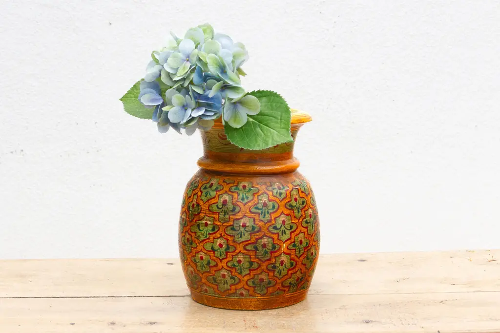 This vintage hand-painted wooden pot, 8" wide and 10" high, showcases vibrant geometric and floral motifs in warm oranges, greens, and reds. Originating from Northern India's desert region, it reflects rich folk art traditions. The aged, worn paint adds to its authentic charm. Ideal as a unique planter, eye-catching shelf décor, or colorful accent, this piece brings rustic character and artisanal beauty to any space.
