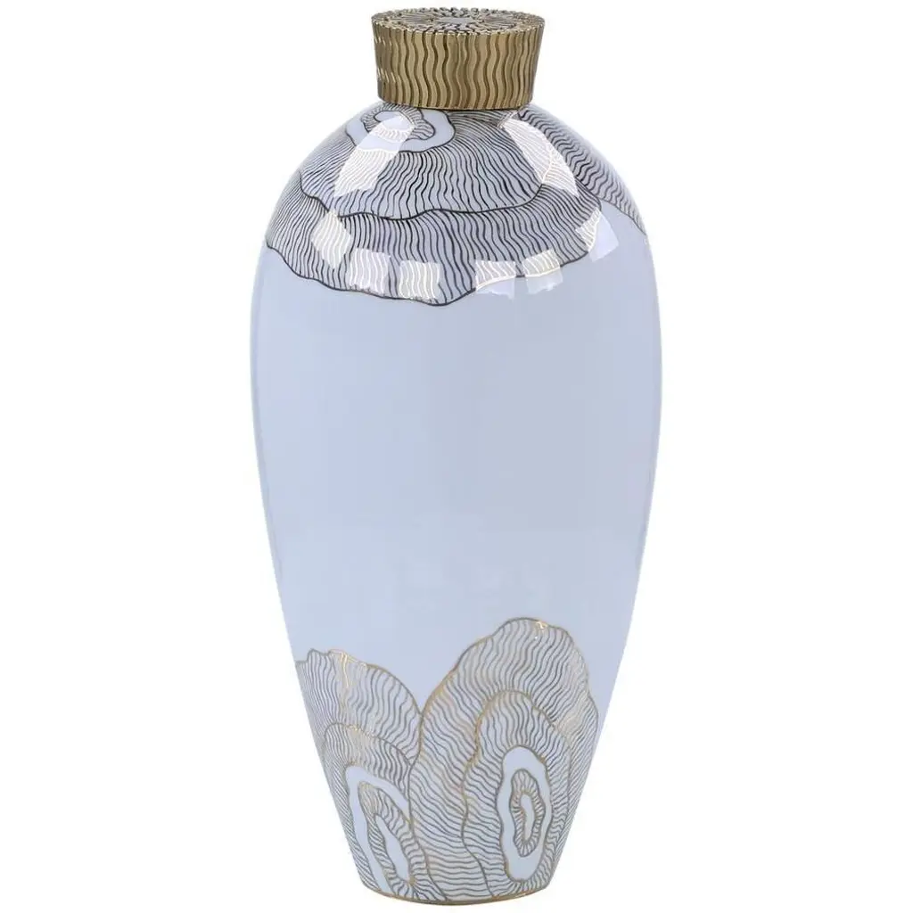 The Anura Vase is a gorgeous decorative vessel with a chic contemporary look that contributes a light, breezy atmosphere to an interior space. Crafted from porcelain, the piece demonstrates a wealth of visual interest through a gorgeous display of blue and white stripes. The piece sits atop a striated brass base in a nickel finish, matched by an intricately detailed frog motif perched atop the rim.