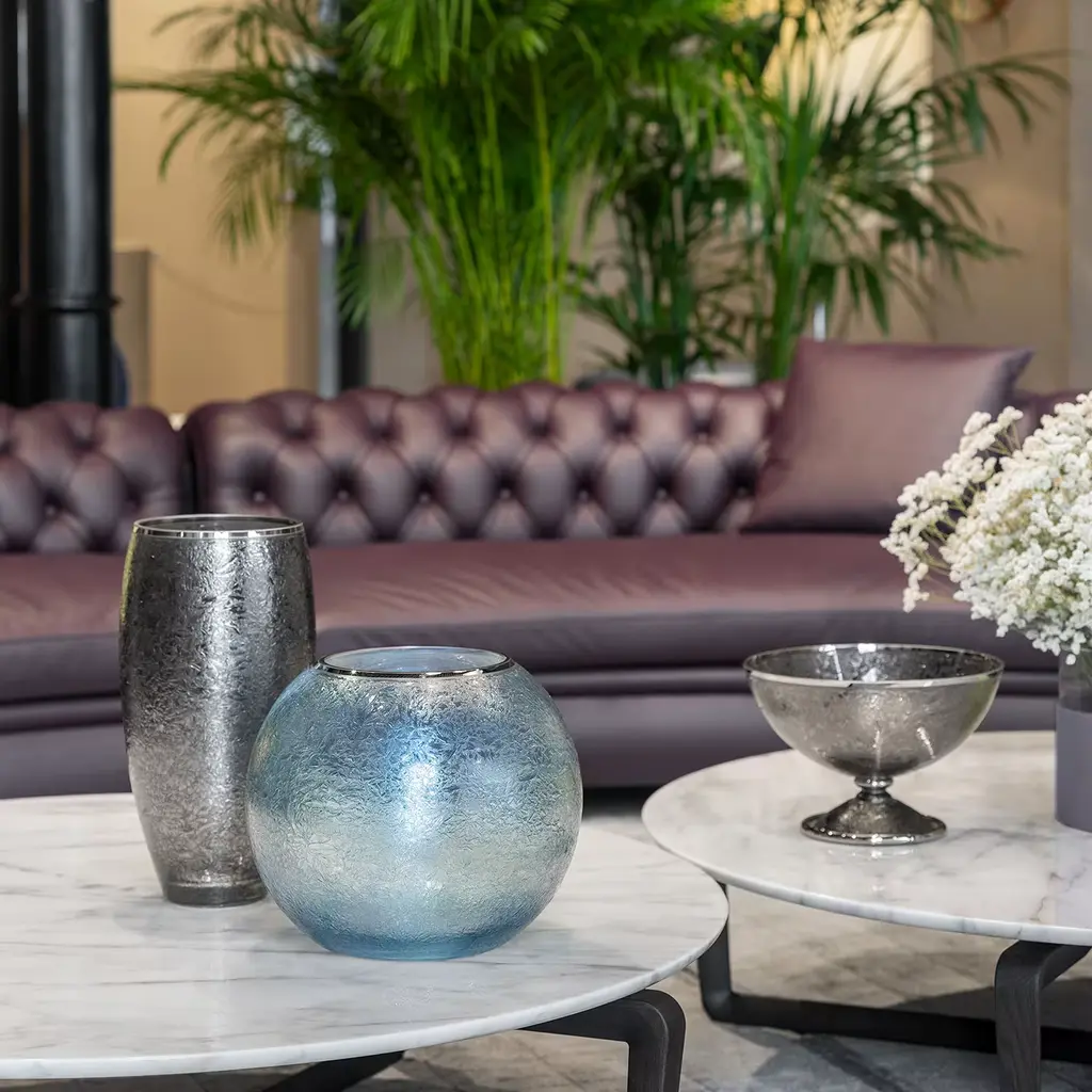 Part of the Aqua Collection, this exquisite mouth-blown glass vase is the epitome of timeless elegance. The serene shade of blue applied by hand is enlivened by the bright platinum rim and complemented by the fine decorations hand-etched into the glass. Stunning on its own or with minimalist flower arrangements, this vase is made to order and is available in multiple colors, please ask the Concierge for options.