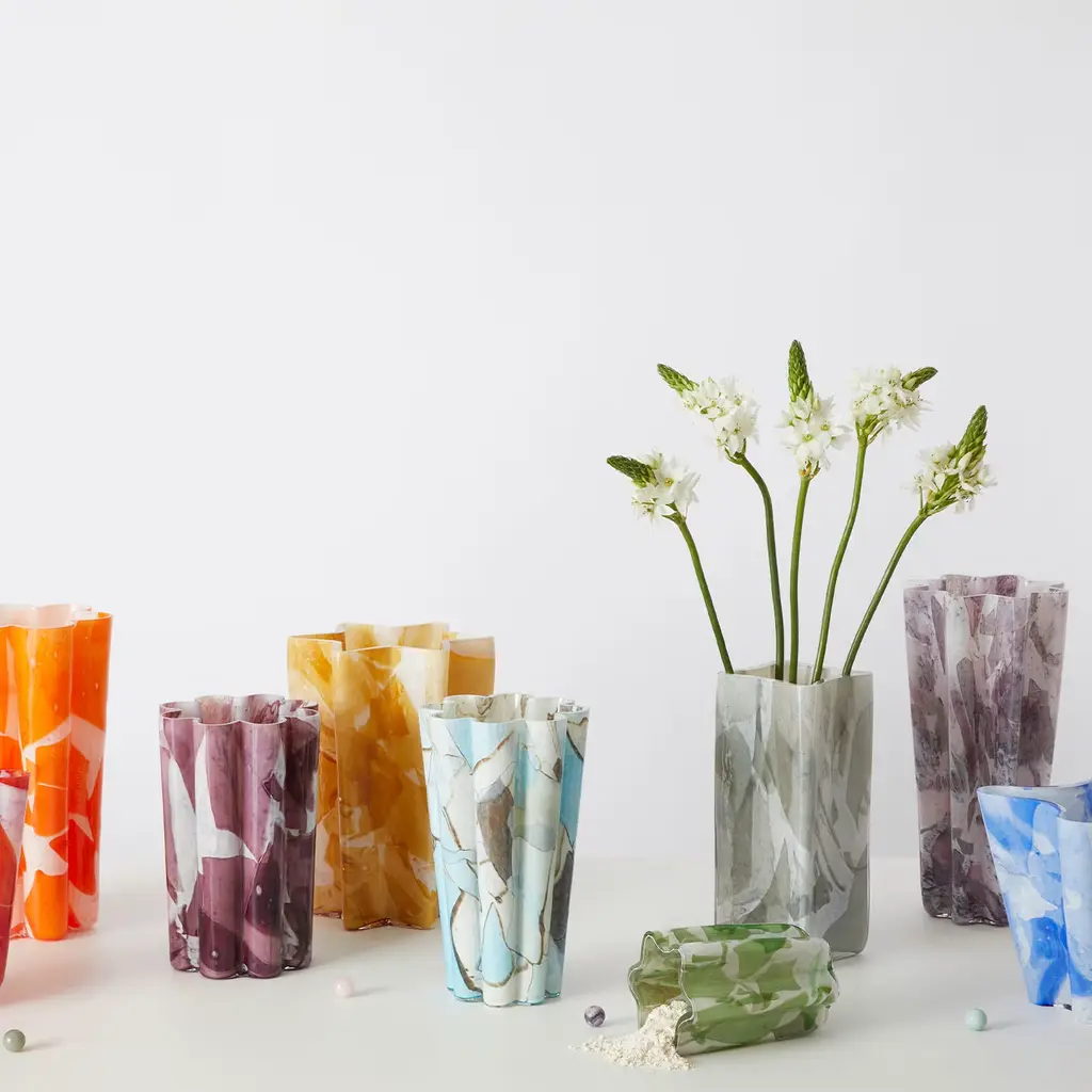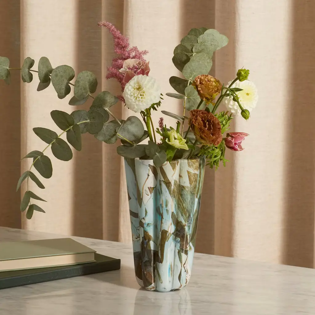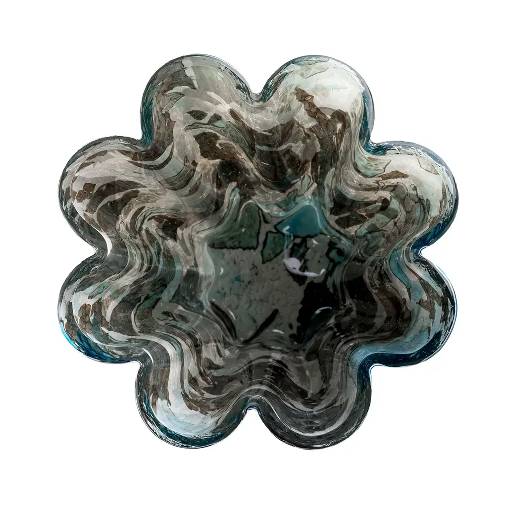 This exquisite piece artfully blends shimmering aquamarine shards of glass melted onto a smooth ivory base, creating a striking visual reminiscent of serene waters and vibrant gardens. Ideal for enhancing interior spaces, this vase infuses elegance and charm into any environment. Meticulously crafted using traditional glassblowing techniques, the vase stands as a testament to refined artistry and craftsmanship. Its unique floral silhouette not only elevates décor but also captures the light, creating a mesmerizing display that draws the eye. Every piece is unique, due to handcrafting slight changes may occur.