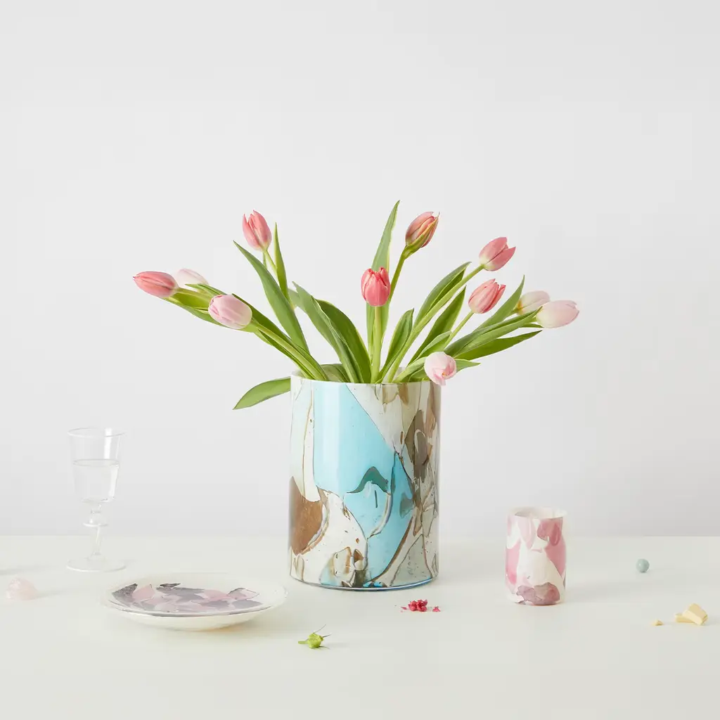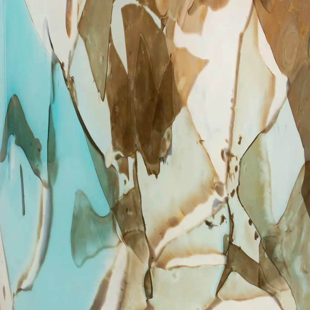 The Large Aquamarine Vase in Murano blown glass is crafted in Venice using the distinctive Nougat technique. This exceptional vase features a fusion of ever-changing hues, with colored glass shards delicately melted onto an ivory base. Its classic proportions make it ideal for large floral arrangements or as a striking centerpiece. Handcrafted with precision, each vase is unique, showcasing timeless Italian craftsmanship.
