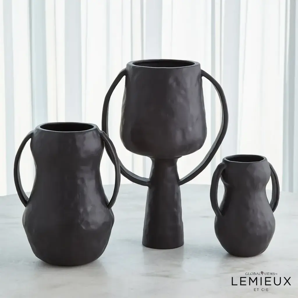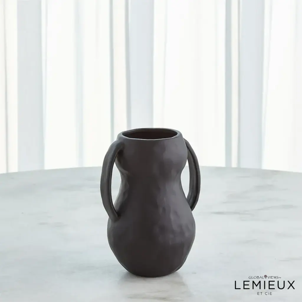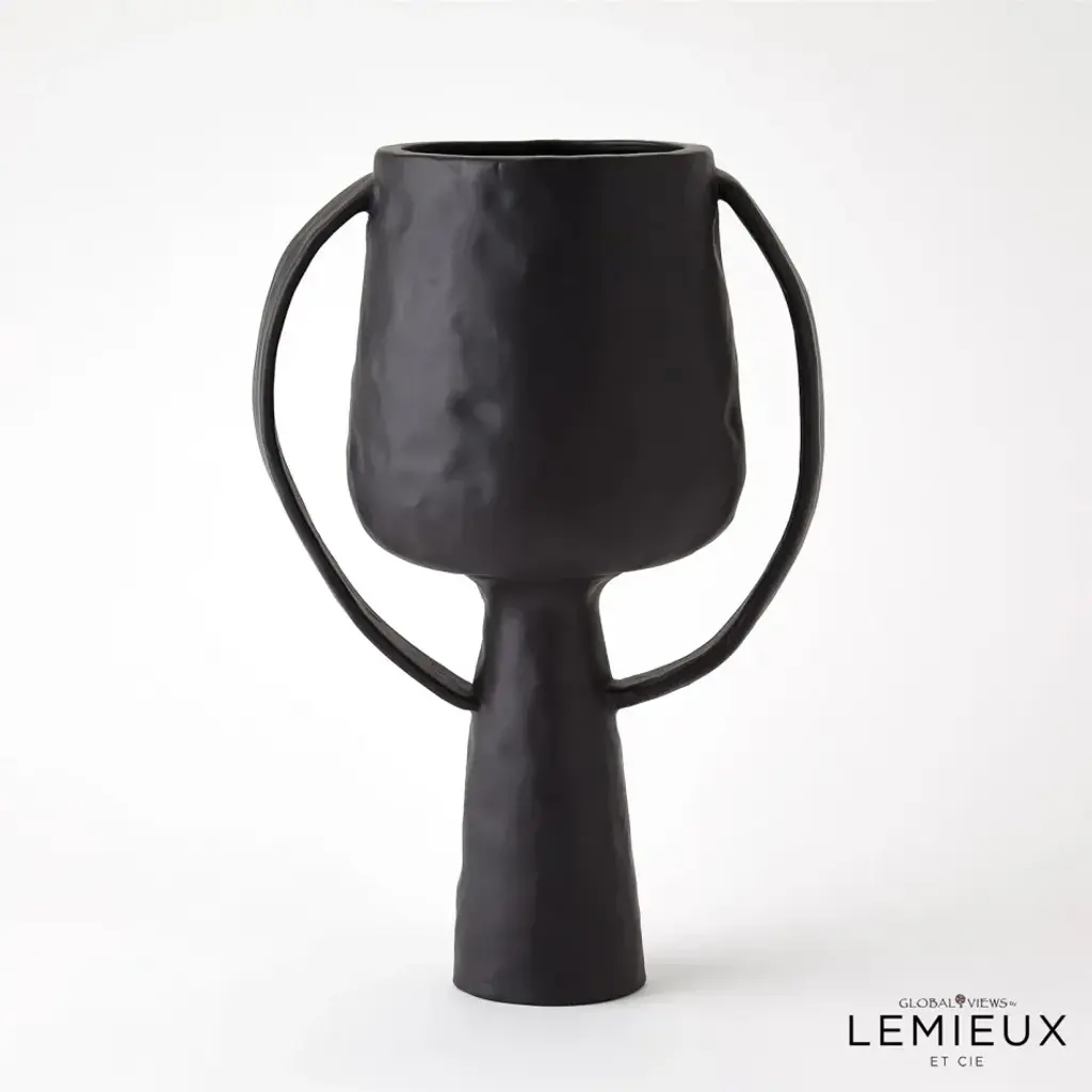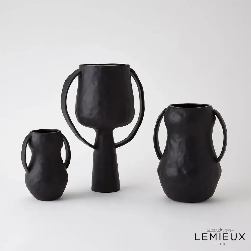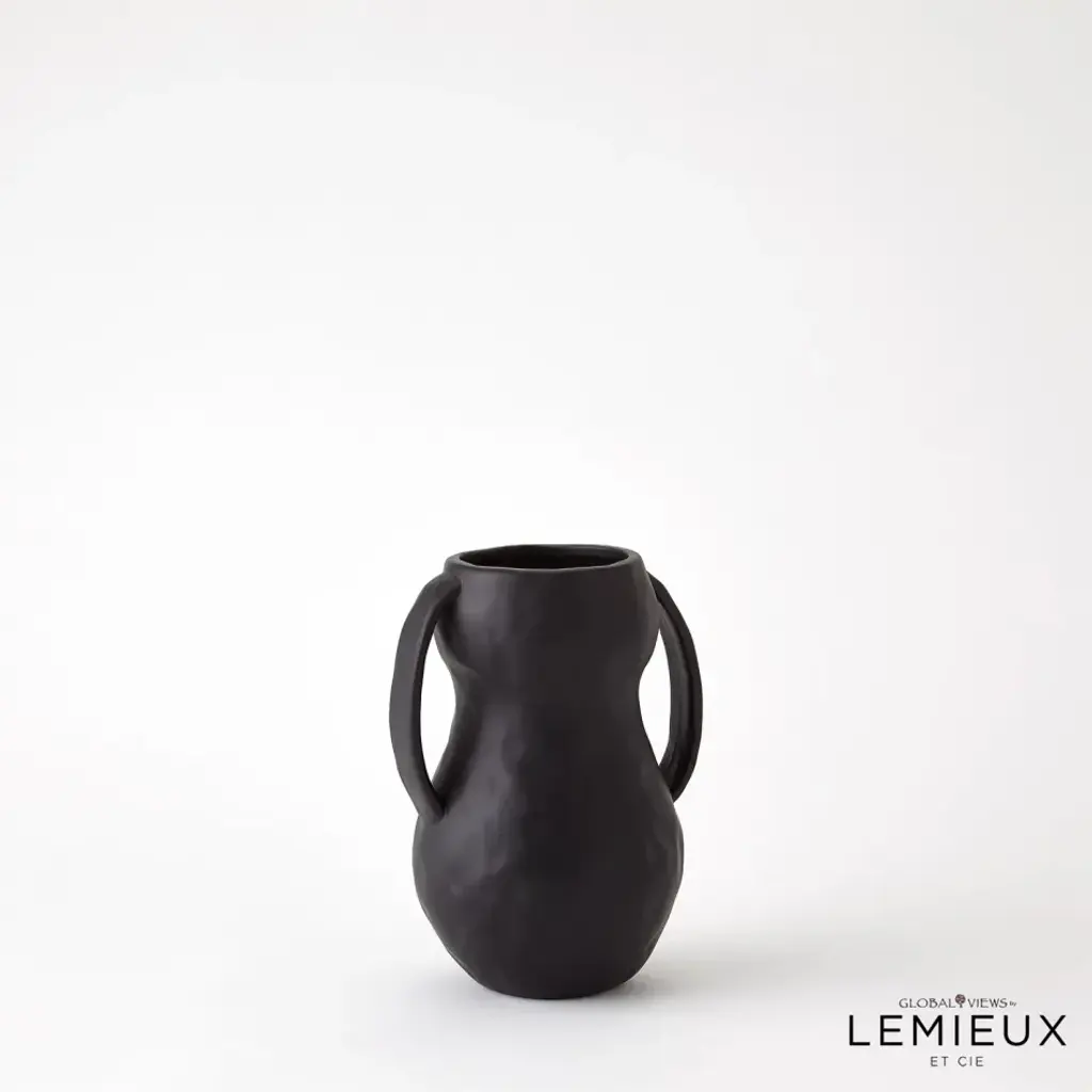 The Aquitaine Vase has modern charm with a touch of the past. The smooth and understated matte finish accentuates its clean lines and graceful curves, creating a refined and modern aesthetic. The ribbon handles, adding a subtle decorative touch, lend a sense of design and allow for easy handling, making it a versatile and beautiful centerpiece. Available in matte white and matte black. From a fashion forward perspective, Global Views offers accessories, furniture, statement lighting, and an assortment of rugs and mirrors to add beauty and joy to your home.