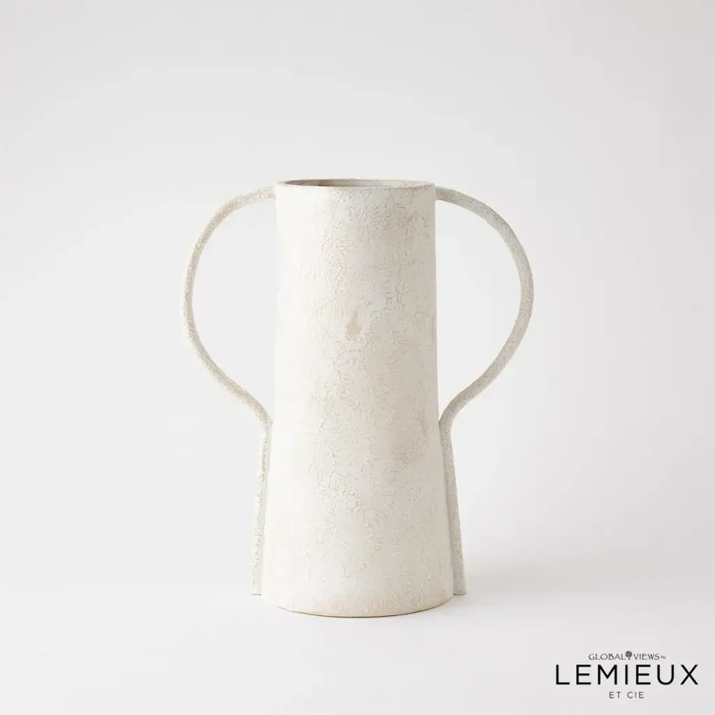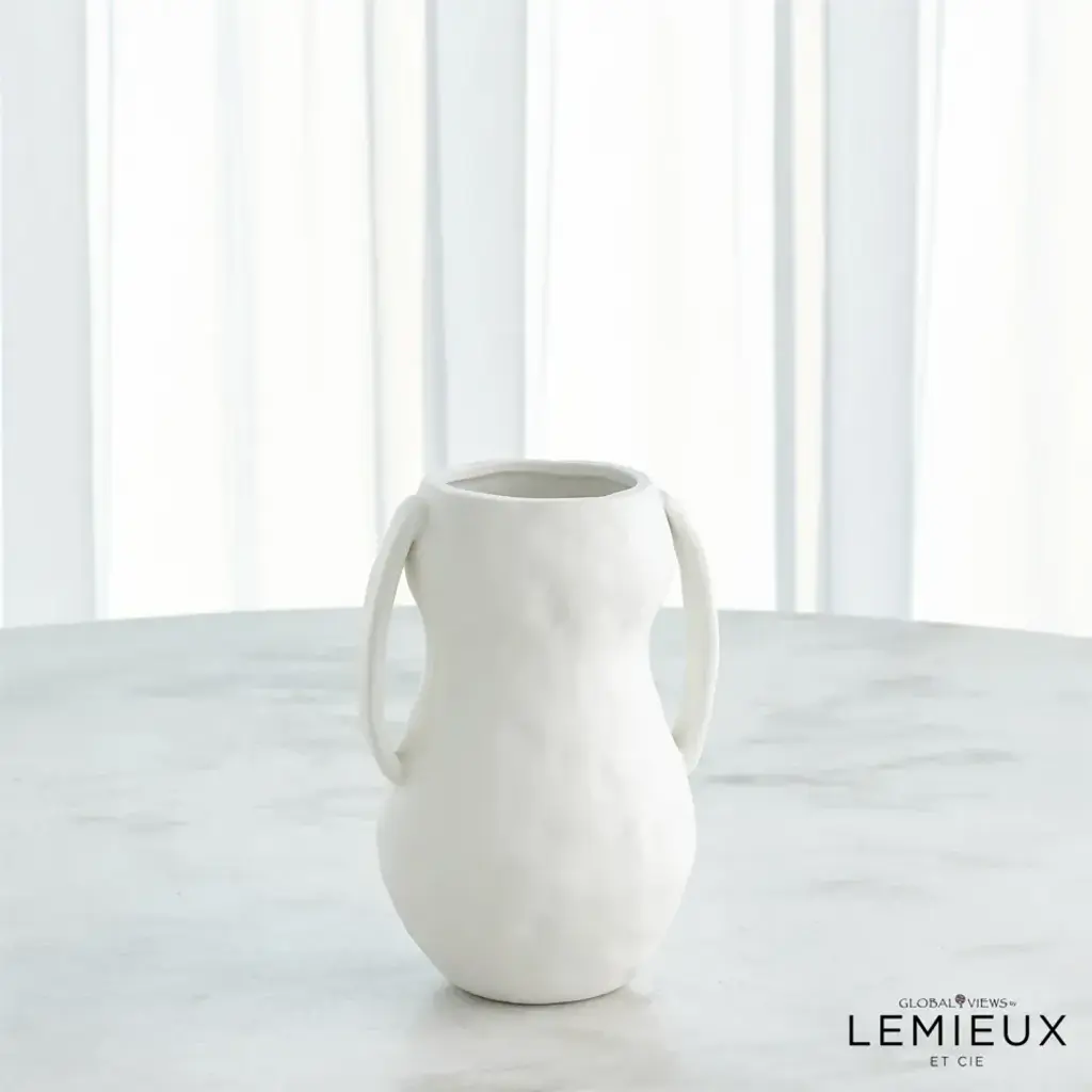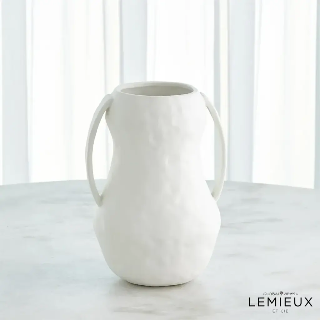 The Aquitaine Vase has modern charm with a touch of the past. The smooth and understated matte finish accentuates its clean lines and graceful curves, creating a refined and modern aesthetic. The ribbon handles, adding a subtle decorative touch, lend a sense of design and allow for easy handling, making it a versatile and beautiful centerpiece. Available in matte white and matte black. From a fashion forward perspective, Global Views offers accessories, furniture, statement lighting, and an assortment of rugs and mirrors to add beauty and joy to your home.