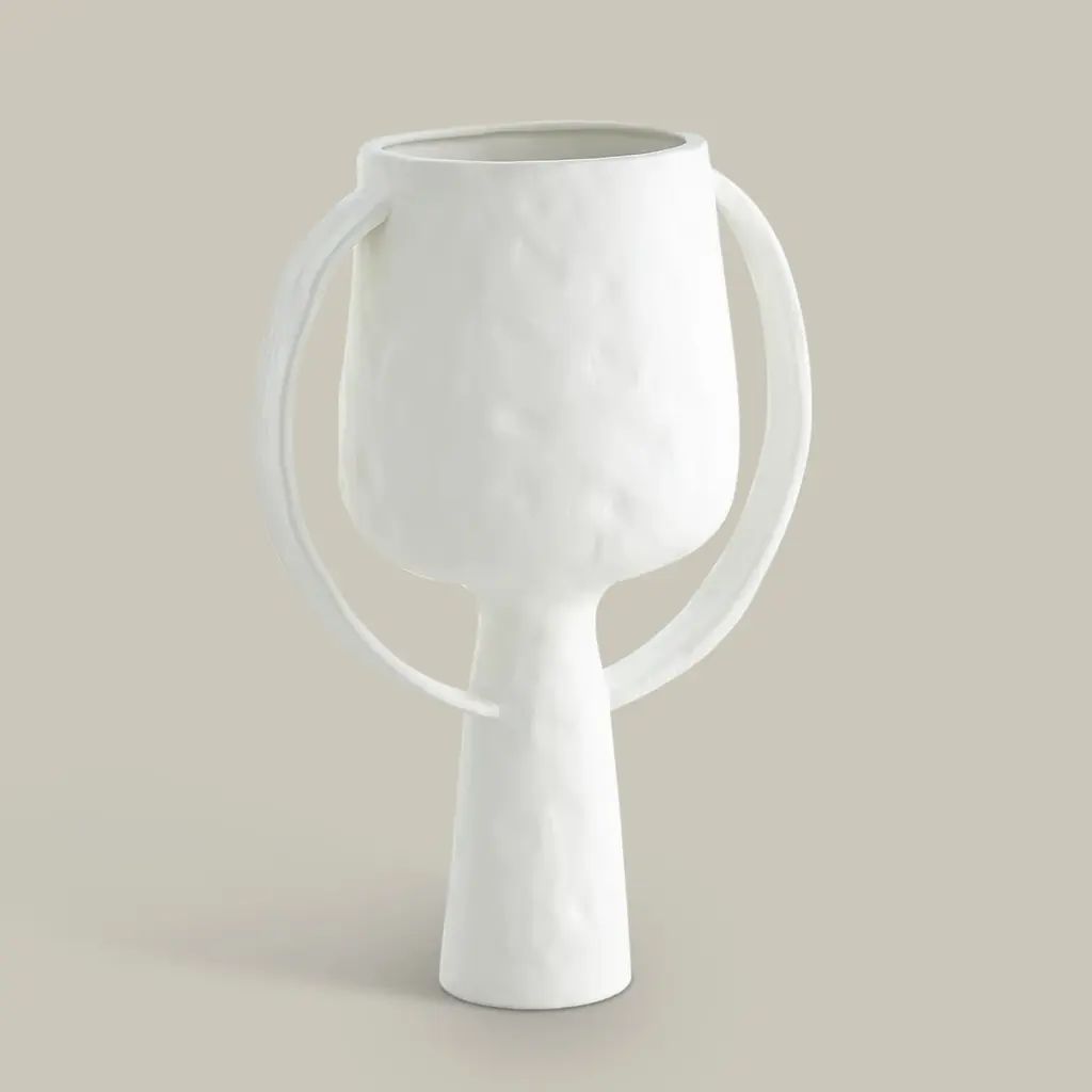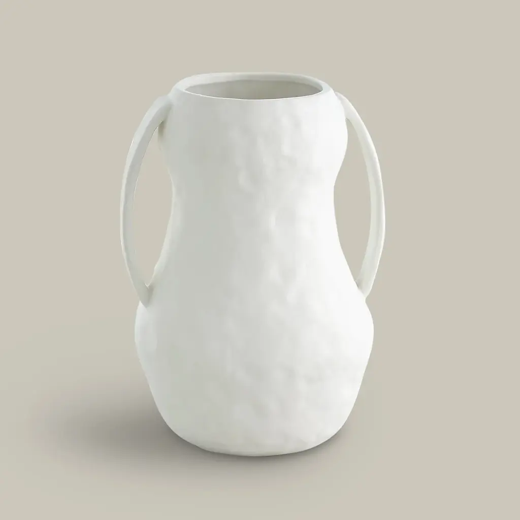 The Aquitaine Vase has modern charm with a touch of the past. The smooth and understated matte finish accentuates its clean lines and graceful curves, creating a refined and modern aesthetic. The ribbon handles, adding a subtle decorative touch, lend a sense of design and allow for easy handling, making it a versatile and beautiful centerpiece. Available in matte white and matte black.