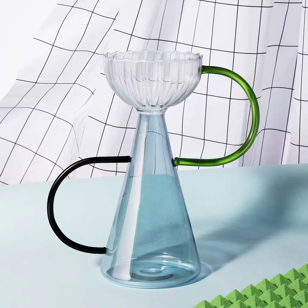 This hand-blown Arabesque borosilicate glass vase by Serena Confalonieri has a sort of transparent glass cup around its top, a transparent, light-blue glass body, and delicate black and green glass handles. The vase takes its name from the ballet move that has clean geometrical lines and gives the dancer's legs and arms an elegant form, like this vase.