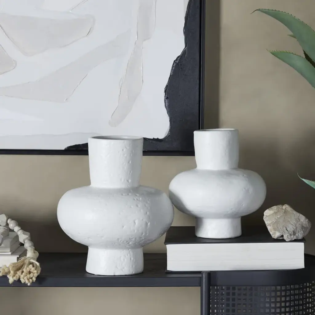 Add an alluring focal point in your space with these modern vases. Designed with felt or rubber stoppers at the base that prevent scratching furniture and table tops, as well as sliding around. This item ships in 1 carton. Suitable for indoor use only. This item ships fully assembled in one piece. This vase comes as a set of 2. Modern style.