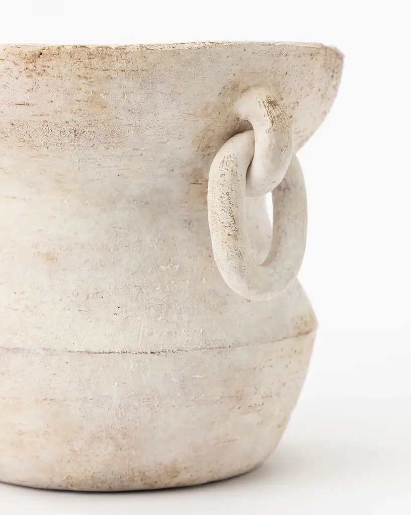 With a unique form, the Arnette Terracotta Vase has a subtle presence that elevates vignettes with its textural detail. Handmade from terracotta clay with an aged white finish, the vase has rustic qualities that complement its bowl-like opening and elegantly looped handles.