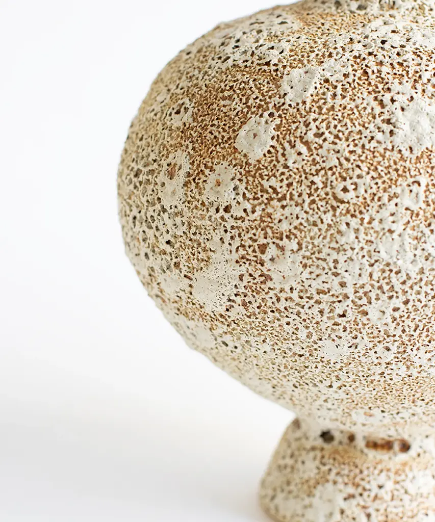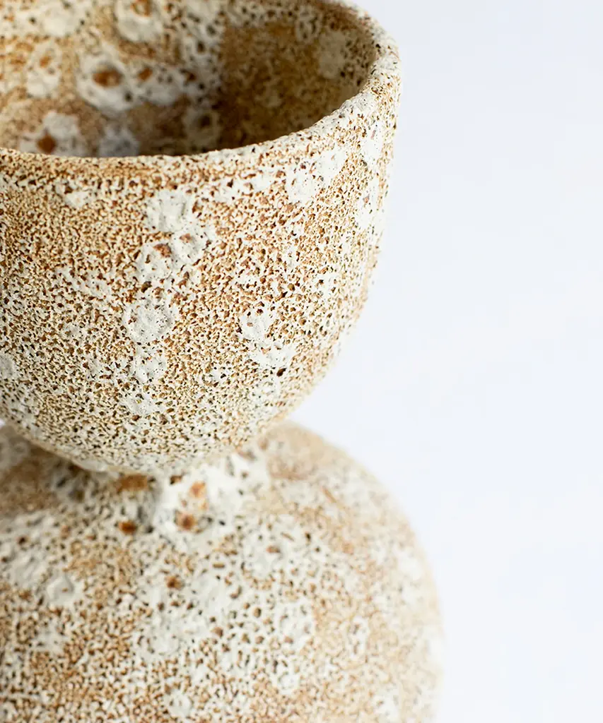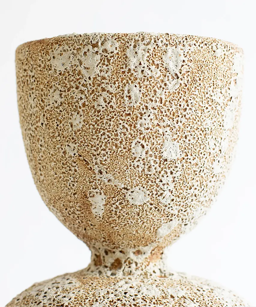 The Arq series emerged from our own past production.Drawing its inspiration from the field of archaeology, it takes certain significant vases from previous collections and modifies them. This reworking is based on the idea of rhizomatic design, that is to say, the idea of a structure whose modifications may arise at any point and in which any element may have an effect on any other. This living atlas has an open body that keeps growing as we continue working on new series and vases.The stoneware vase in handmade to order by the Valencia-based studio, Canoa Lab.
