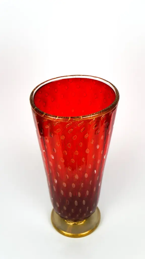 Handmade red Murano glass vase with 24-karat gold decorations and inner bubbles.Work performed by Murano artisan Stefano Mattiello. Vase signed with cold engraving by artist. An original Murano glass vase represents the symbol of an art and a millenarian work, it represents the unique and indistinguishable state of a work of art made especially for you, only for you, because each piece is unique, as handmade by expert Venetian masters, which embody the art of centuries.