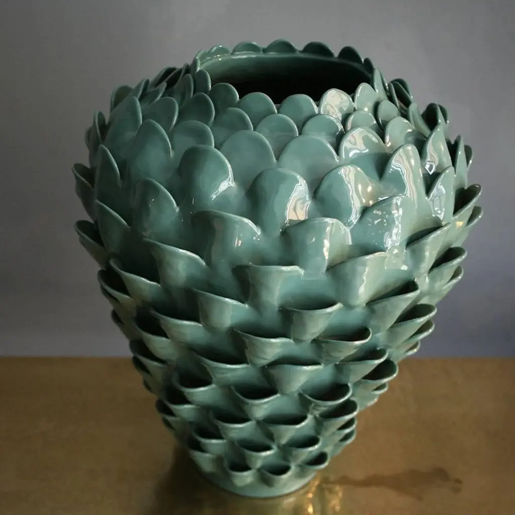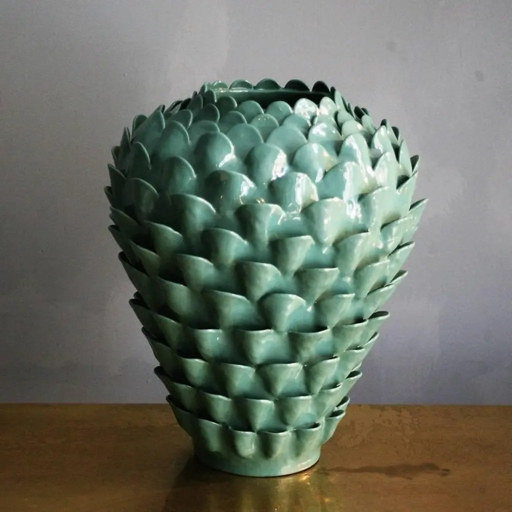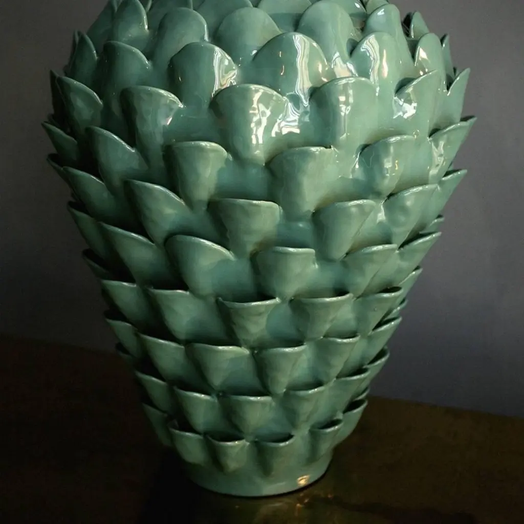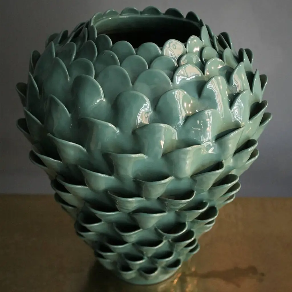 The bright turquoise glaze of this striking terracotta vase brings the large, raised fish scale pattern into focus. Part of the Artemisia collection, this piece is entirely handmade using the ancient colombino technique. Each piece is signed and numbered. Variations in size, shape, and finish are not considered imperfections but rather the mark of a unique handcrafted piece.