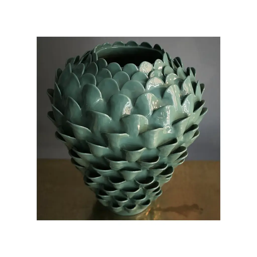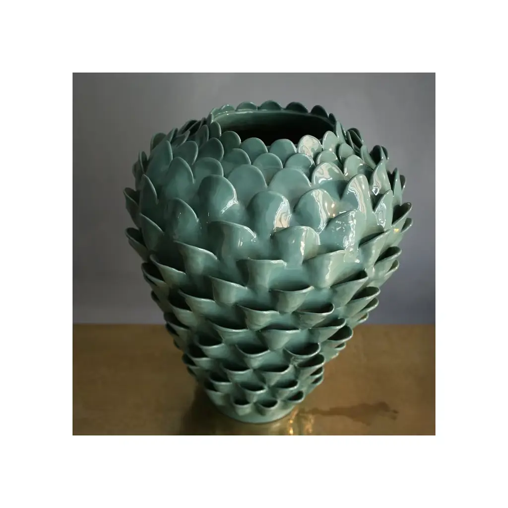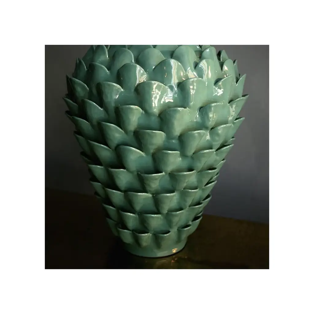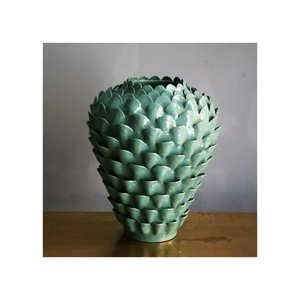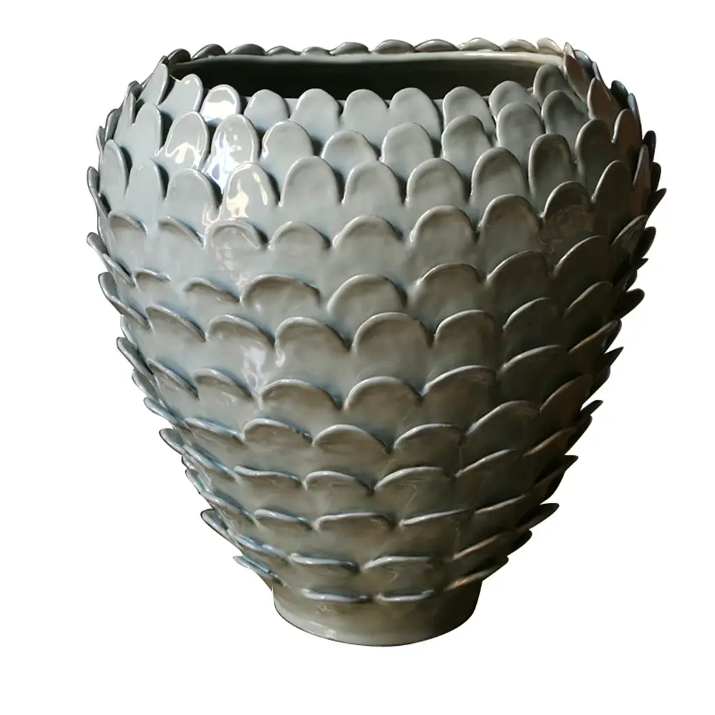 The bright turquoise glaze of this striking terracotta vase brings the large, raised fish scale pattern into focus. Part of the Artemisia collection, this piece is entirely handmade using the ancient colombino technique. Each piece is signed and numbered. Variations in size, shape, and finish are not considered imperfections but rather the mark of a unique handcrafted piece.