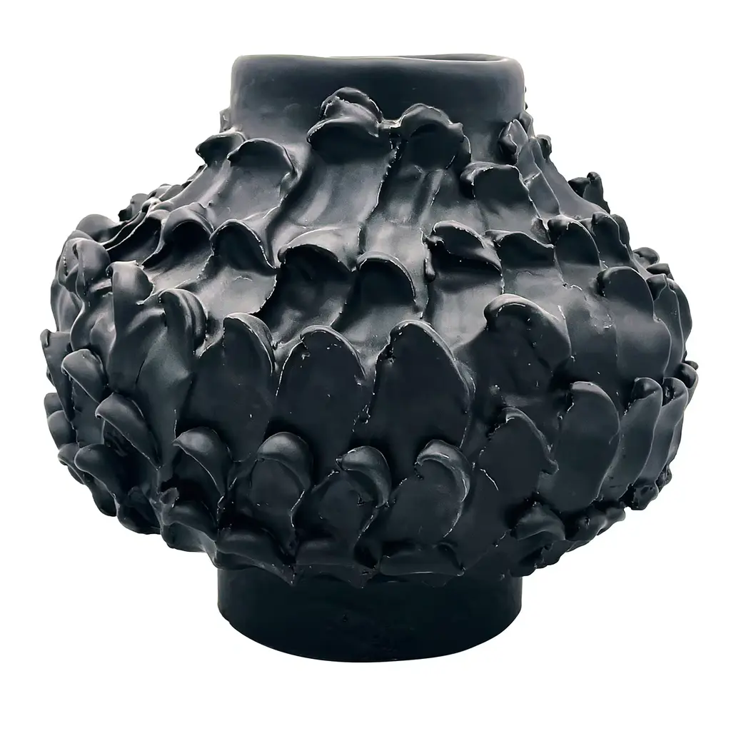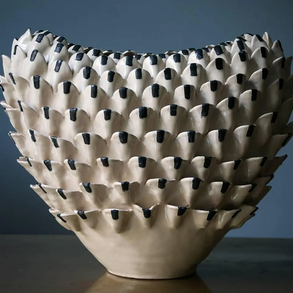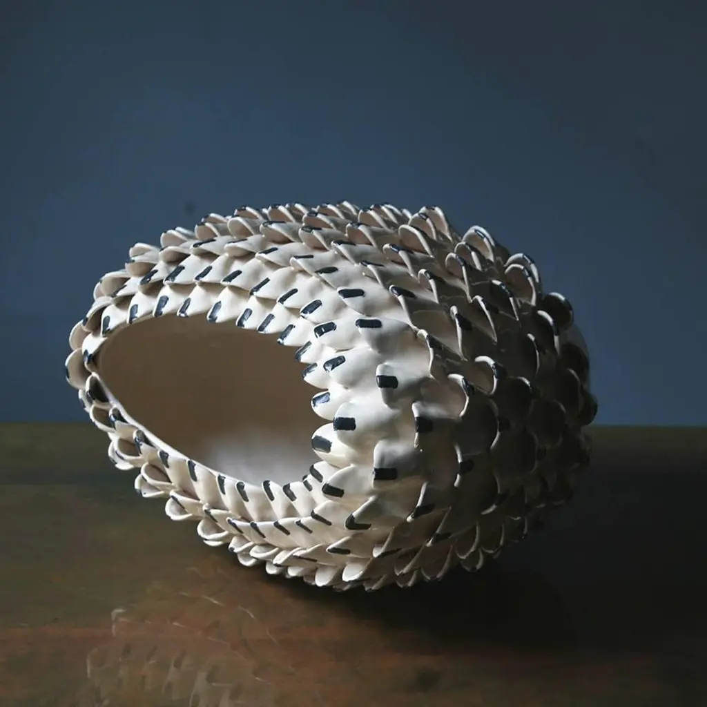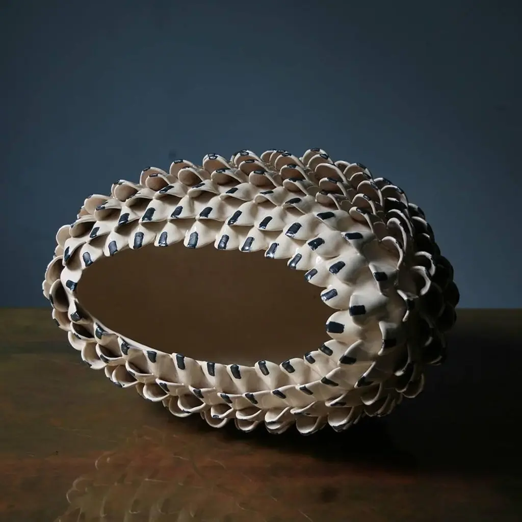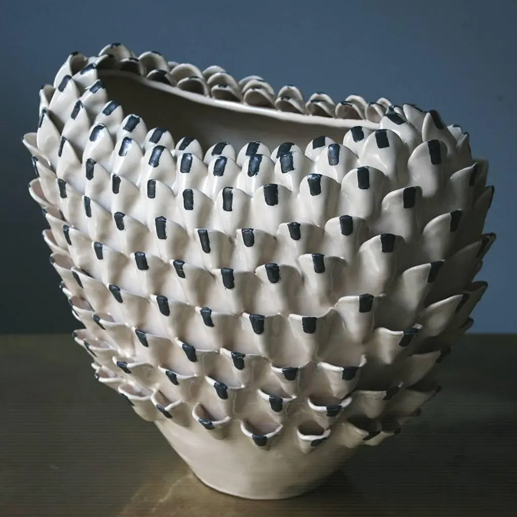 Covered with a pattern made of dense, decorative, raised scales, this unique vase in white glazed terracotta combines a bold pattern with an elegant finish. The scales have a small, sharp black line at the centre that creates an overall captivating effect. Made by hand using the ancient colombino technique, this object is a magnificent piece of functional decor. Part of the Artemisia series, each vase is signed and numbered and features unique characteristics.