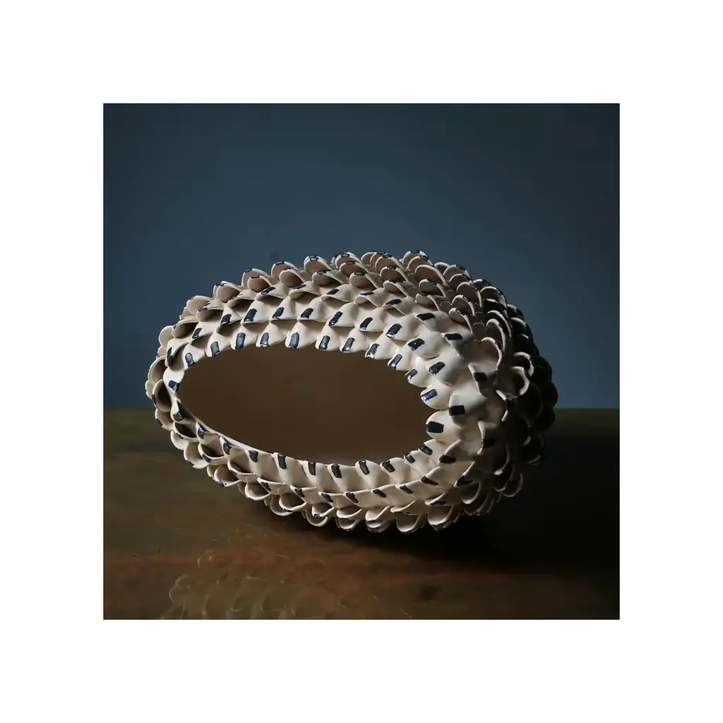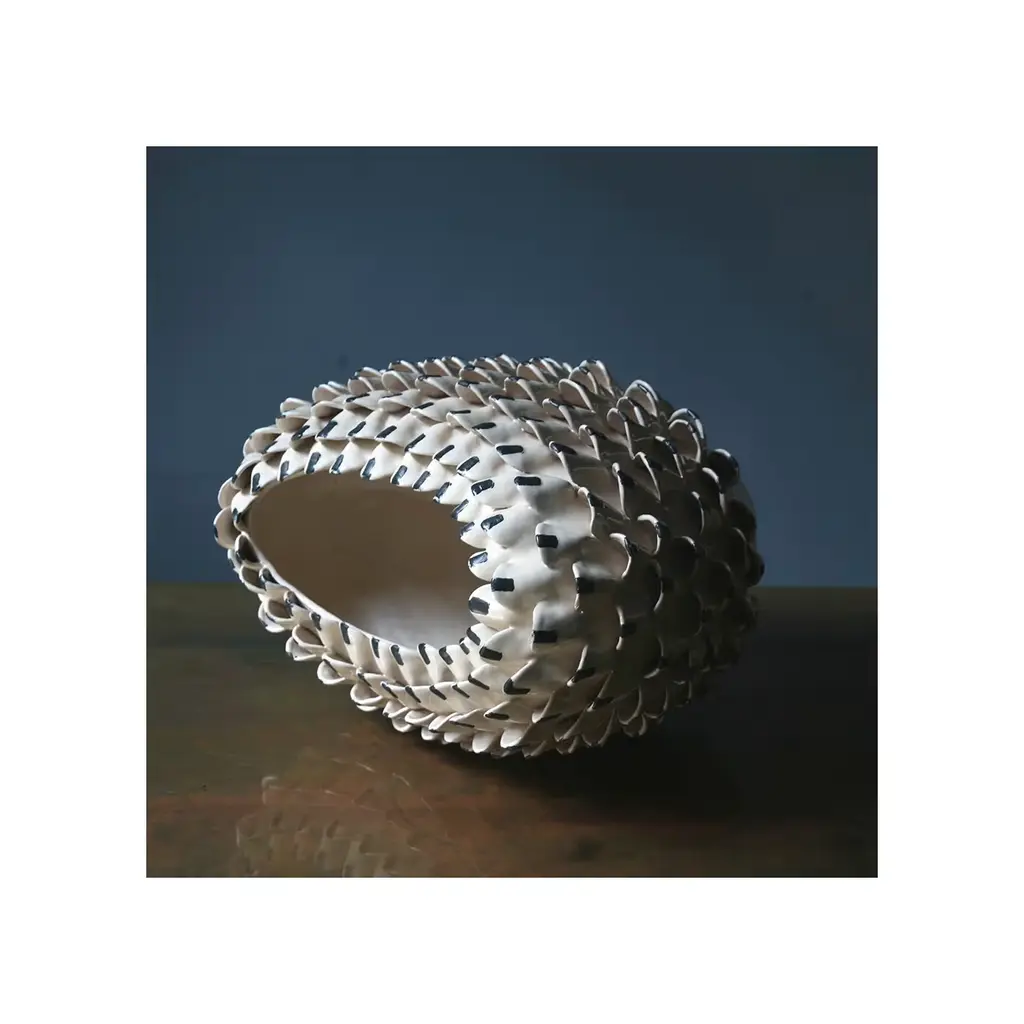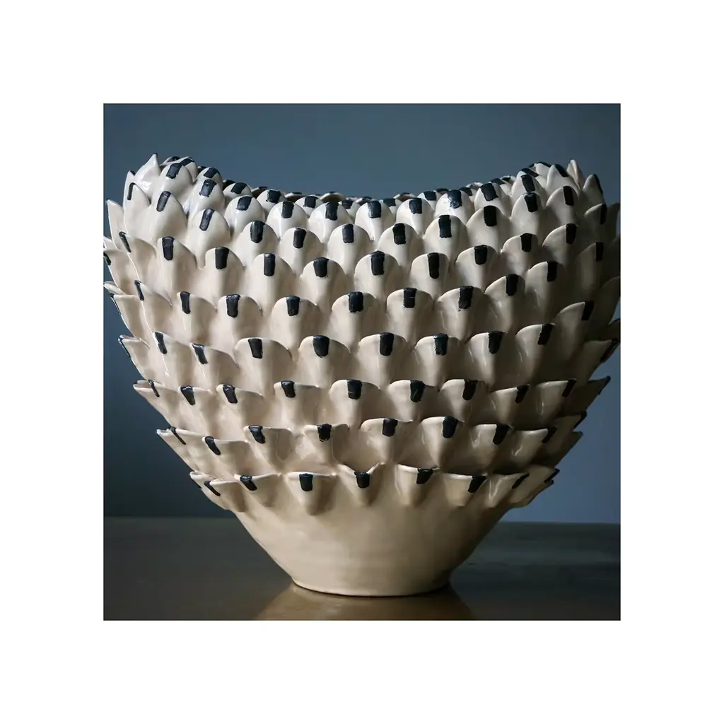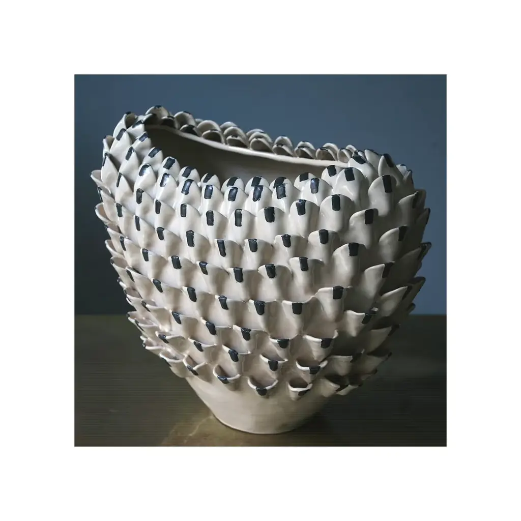 Covered with a pattern made of dense, decorative, raised scales, this unique vase in white glazed terracotta combines a bold pattern with an elegant finish. The scales have a small, sharp black line at the center that creates an overall captivating effect. Made by hand using the ancient colombino technique, this object is a magnificent piece of functional decor. Part of the Artemisia series, each vase is signed and numbered and features unique characteristics.