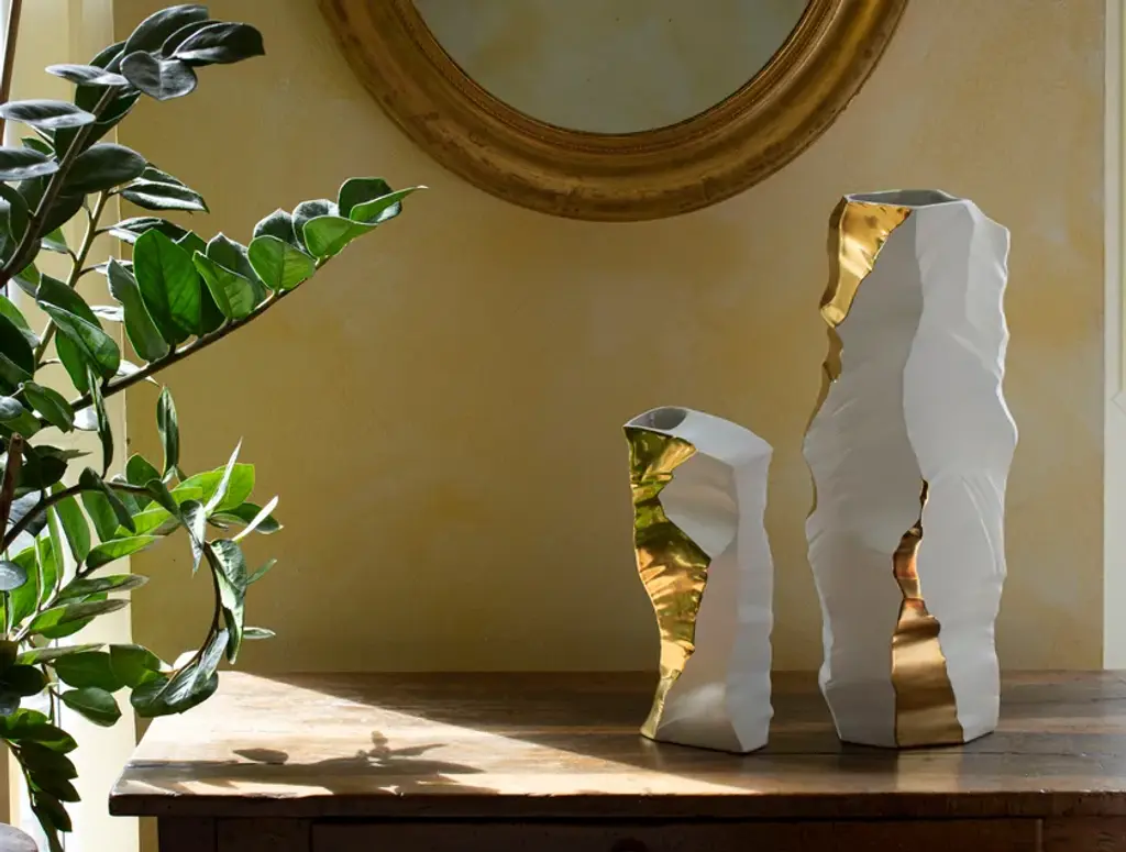 Artika is a collection consisting of a set of three porcelain vases/sculptures with a strong and bold personality, designed by the architect and designer Giovanni Luca Ferreri. Pure white, the signature style of FOS, changes shade every time light hits the glacier-like facets. The purity of icebergs is thus honored by the use of a precious material such as porcelain, bringing the majestic elegance of Nature in the home interiors. ARTIKA SUNSHINE vases are decorated with precious gold 23K, fixed through an additional meticulous firing process.