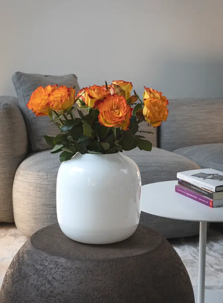 Collection of mouth-blown Murano glass vases offered in three different sizes. The shape recalls the classic oriental vases of great visual impact in a contemporary key; the highly polished white, air force blue and chocolate colours also recall the beautiful shades of ancient Asian porcelain and glass. Arya is a vase that can hold flowers or decorate a space with its strong presence alone.polished white-etched glass available in three colours:- white- chocolate- air force blue