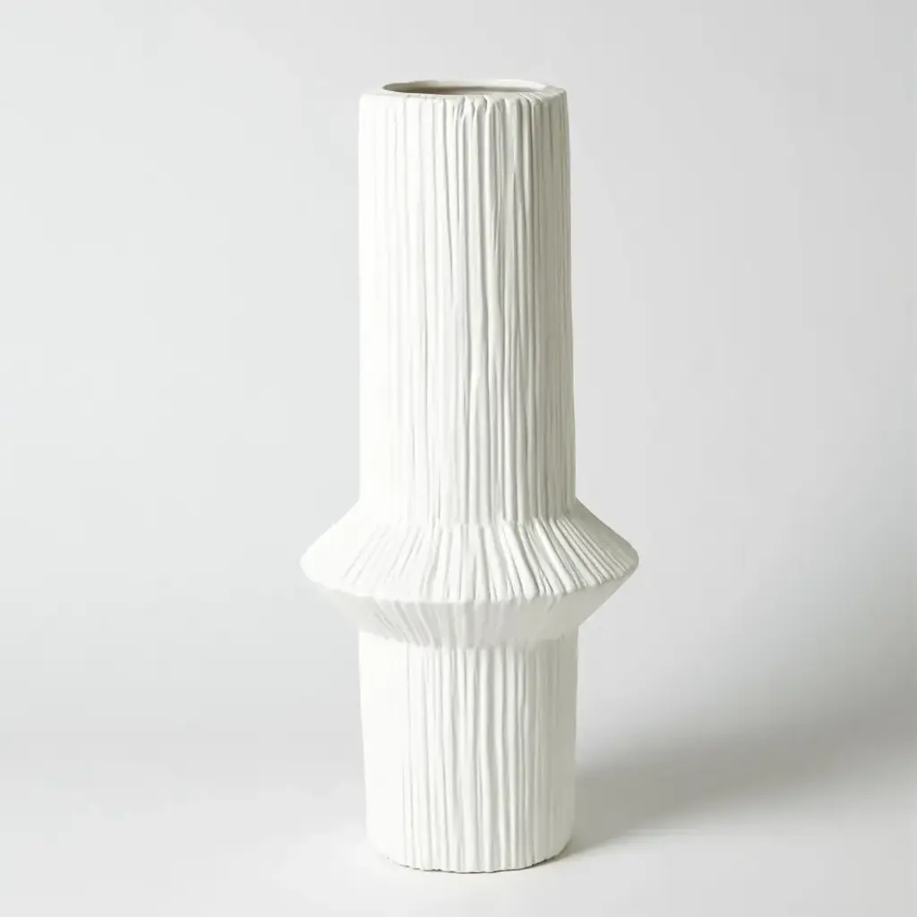 Impressive in size, our Ascending Ring vases each have a pointed collar that coordinates with its respective size. Heavily textured and finished in a matte white glaze. From a fashion forward perspective, Global Views offers accessories, furniture, statement lighting, and an assortment of rugs and mirrors to add beauty and joy to your home.