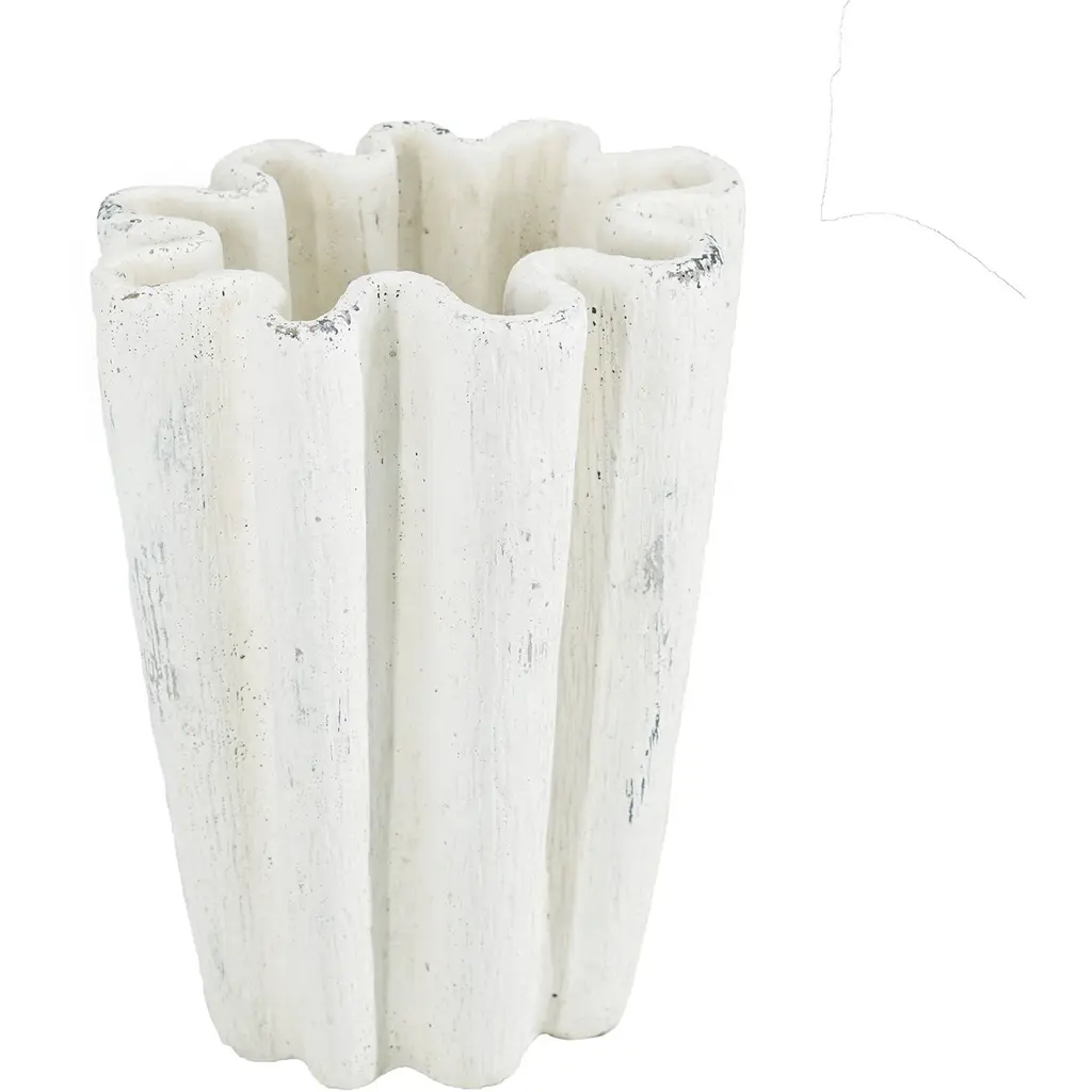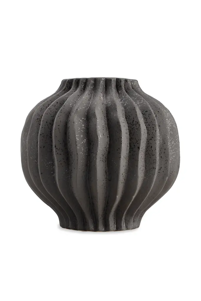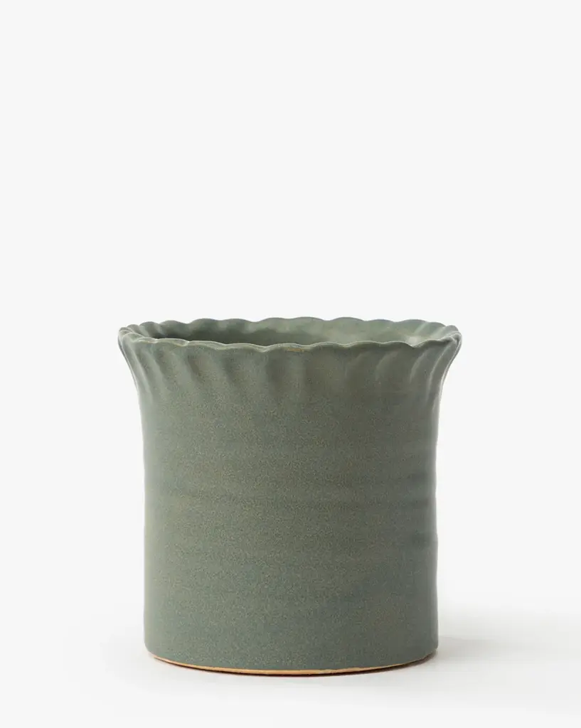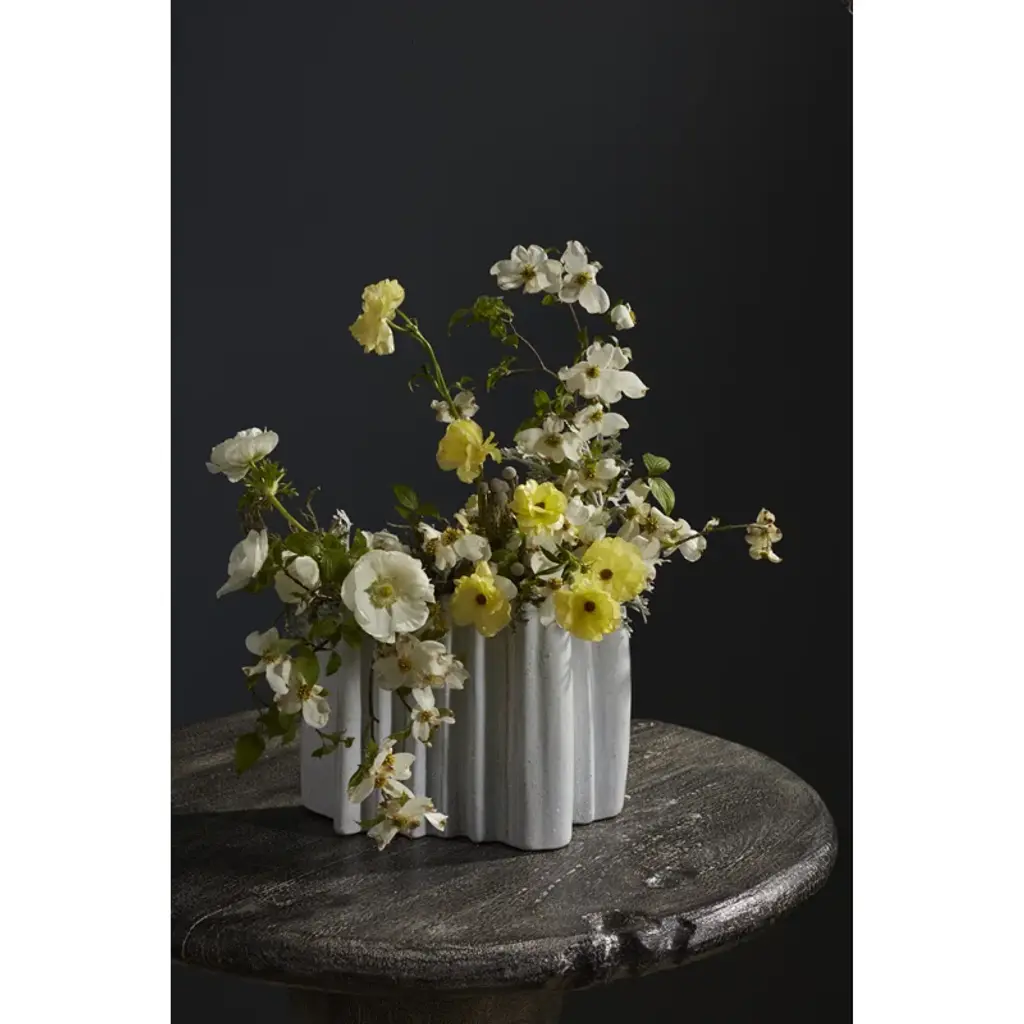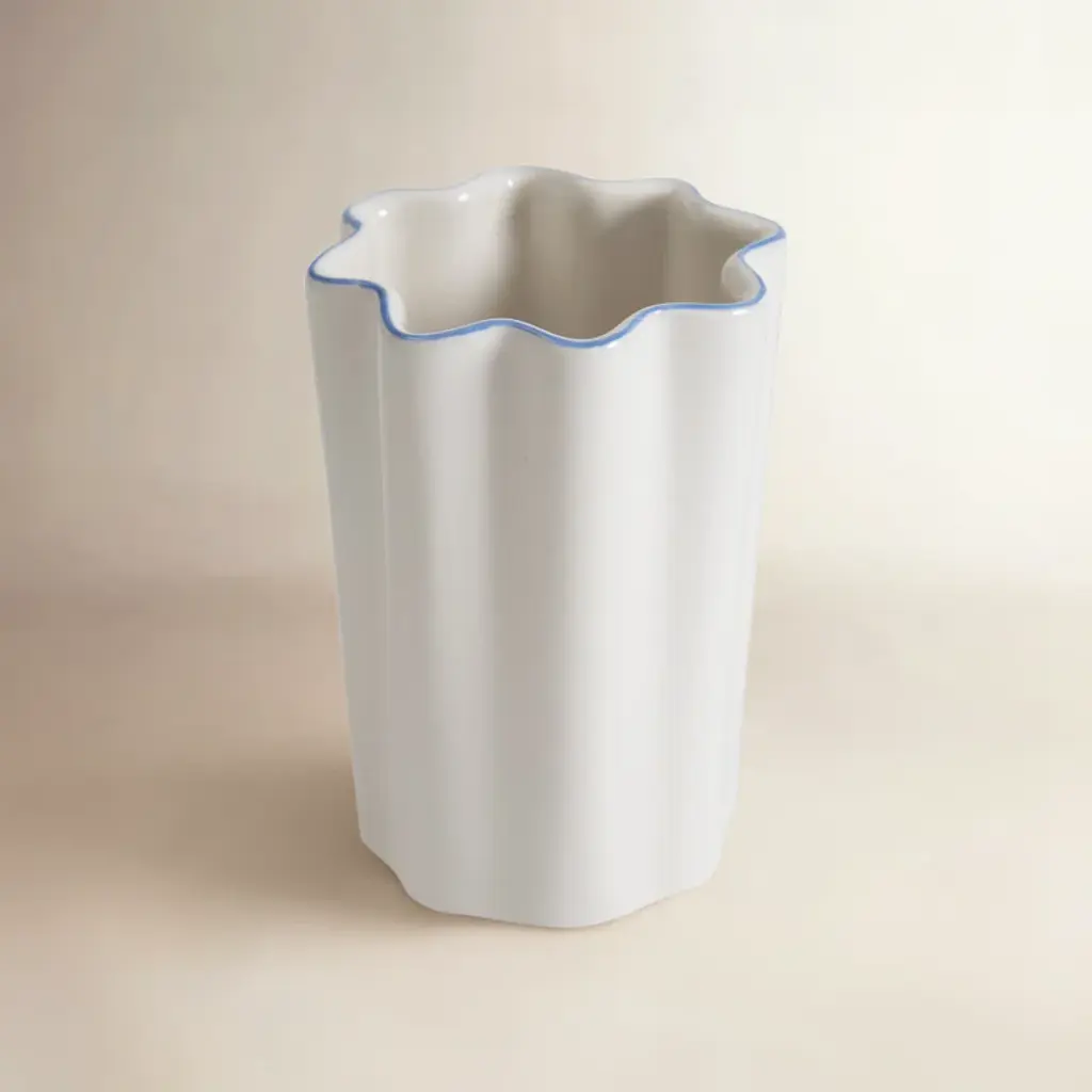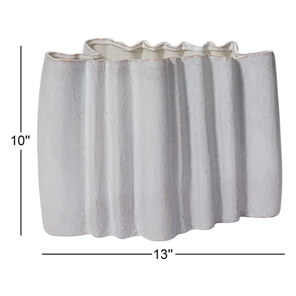Decorative as a vase or a sculptural object, the ridge pot adds a wavy dimension to your shelves. Its unique shape looks like it could blend in with underwater ocean life. The vase is white glazed and fired twice, creating a slight blue effect.
