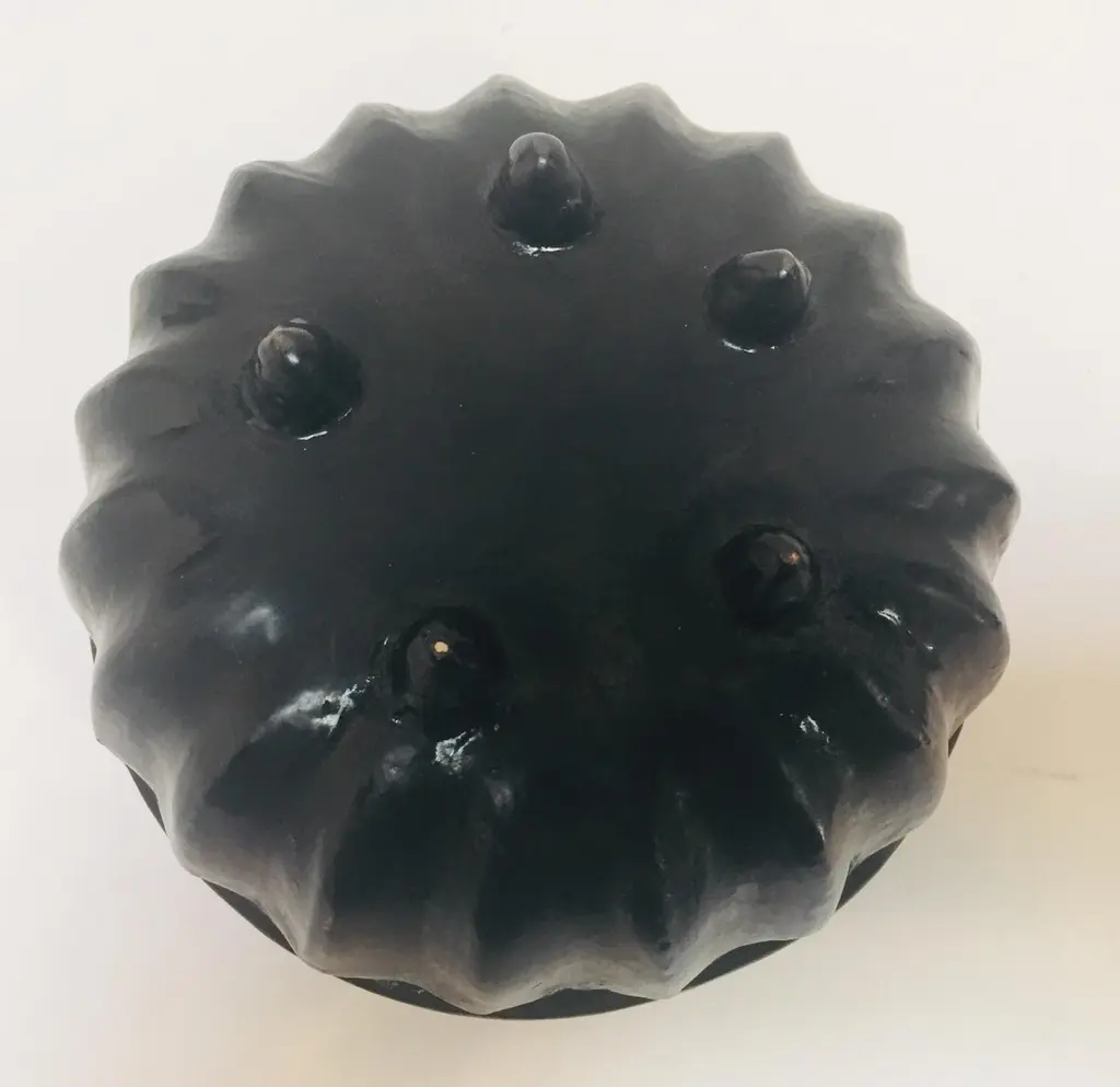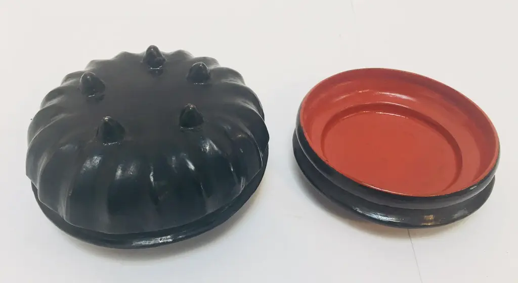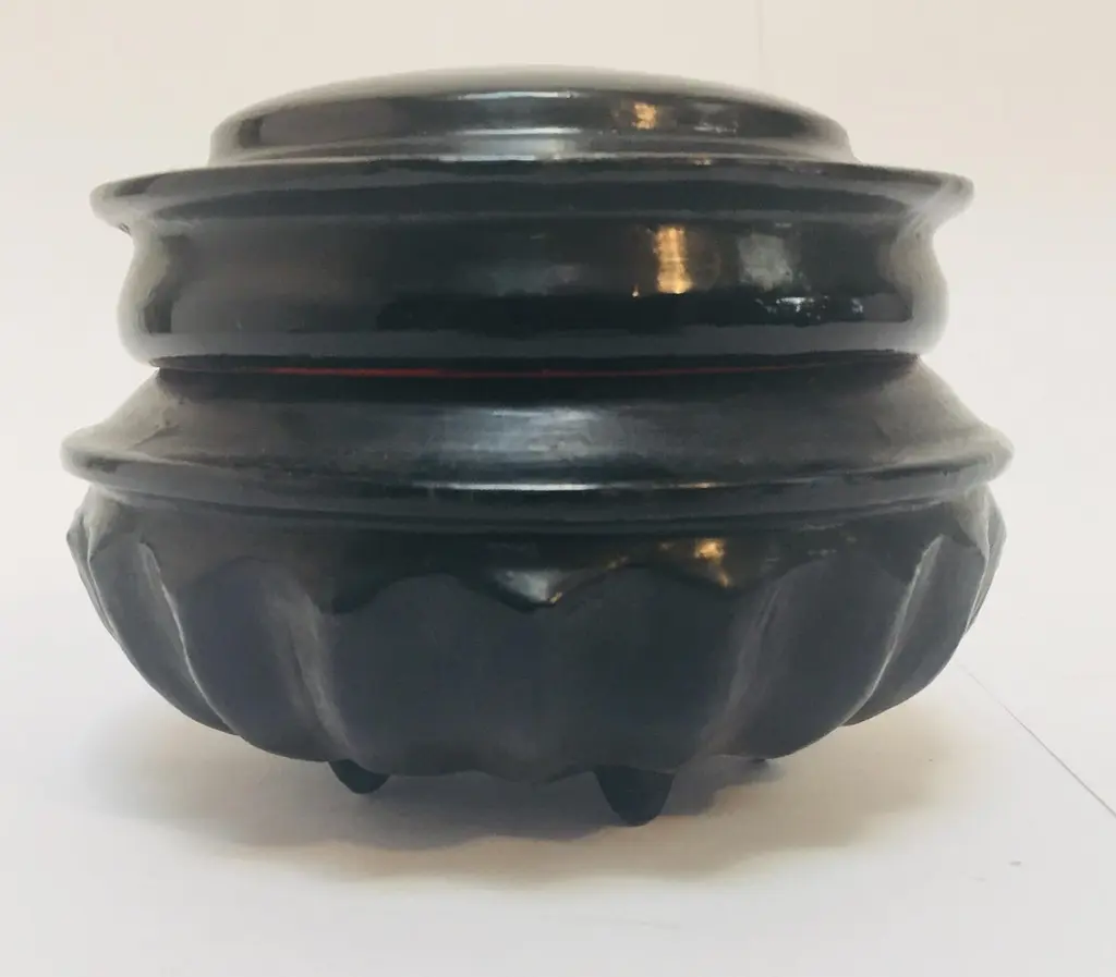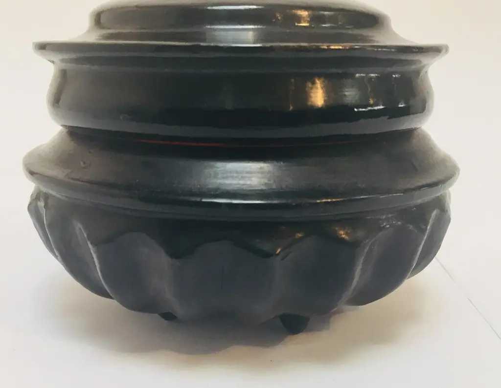 South Asian Burmese black and red lacquer box, offering vessel urn with compartment for storage.This round lacquer ware box from Burma is made from bamboo and lacquer.In Burma (now called Myanmar), lacquer receptacles called hsun-ok were used for centuries to carry gifts of food to the Buddhist monasteries.The tapered top of this hsun-ok, which is of the particular shape called ok-kwet, is created by a tray that fit on top of the wide bottom footed bowl. The top is crowned by a small inverted bowl. The interior surfaces of the pieces are cinnabar-colored lacquer, the color used by the artisan for the first series of lacquer coatings, and the reddish hue of the base lacquer shows subtly through in places on the black lacquer exterior.This is an elegant black exterior and red interior lacquer tribal offering vessel used to carry offerings to temple ceremonies.Great decorative Asian box.