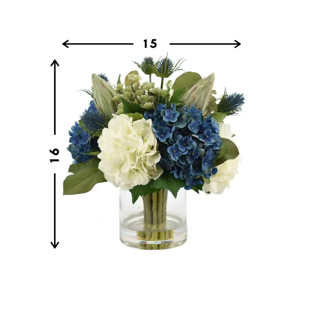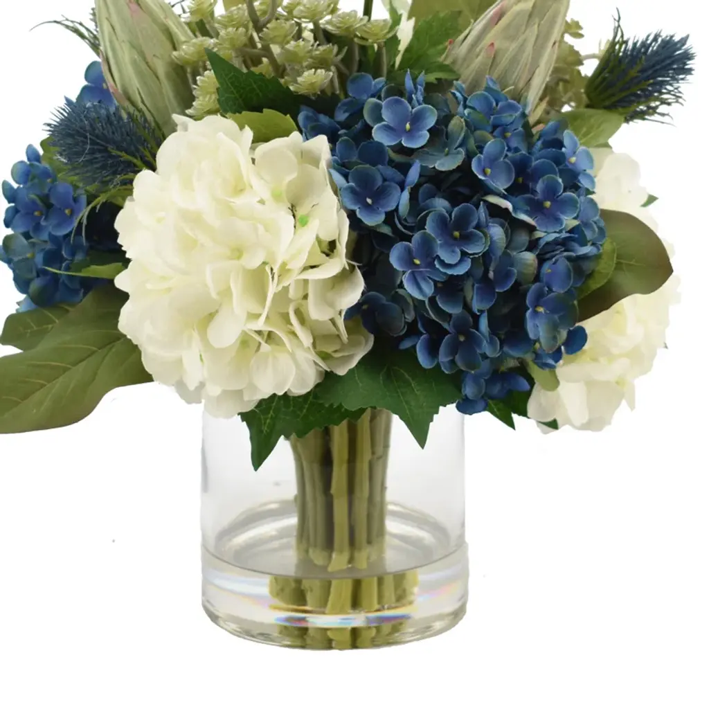 Assorted Hydrangeas With Thistle, Cactus And Protea In Glass Vase