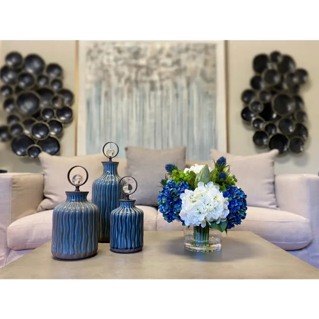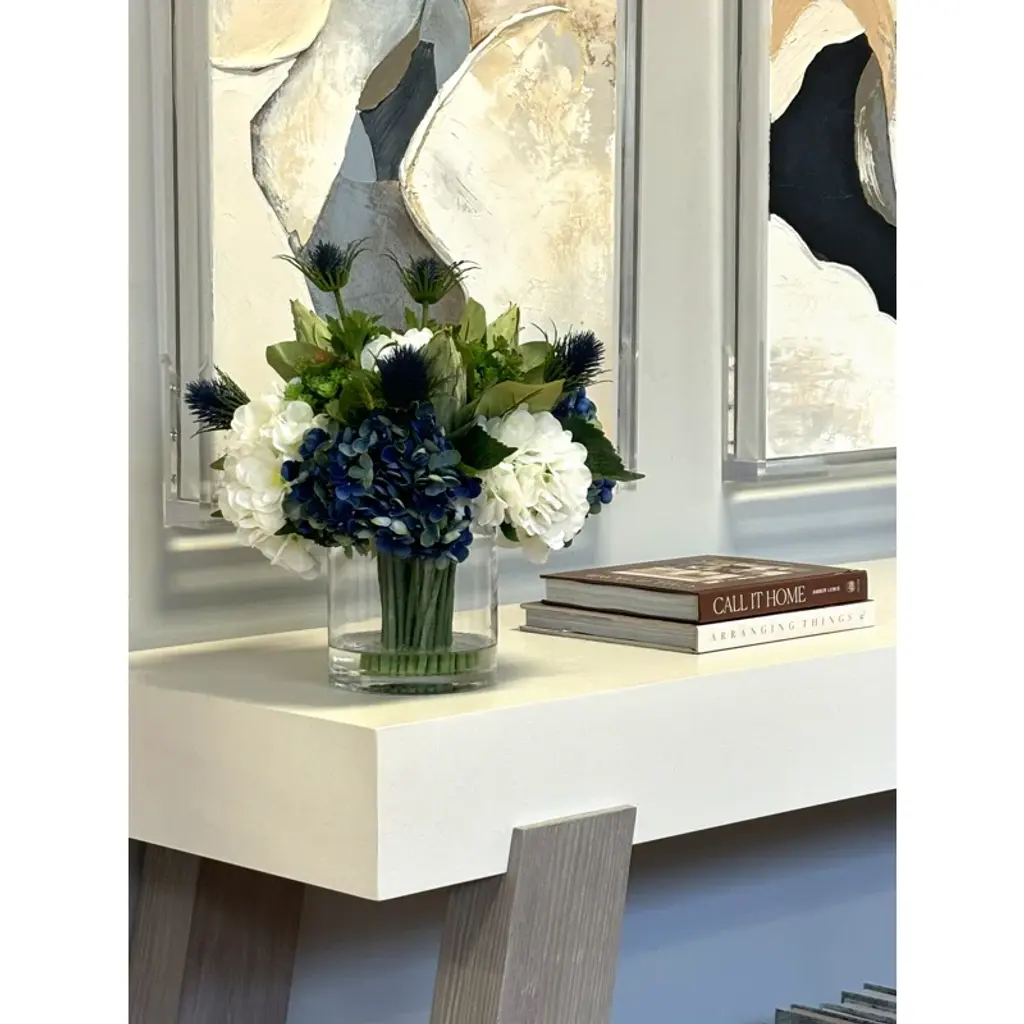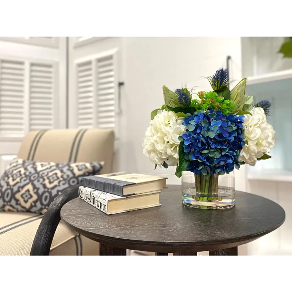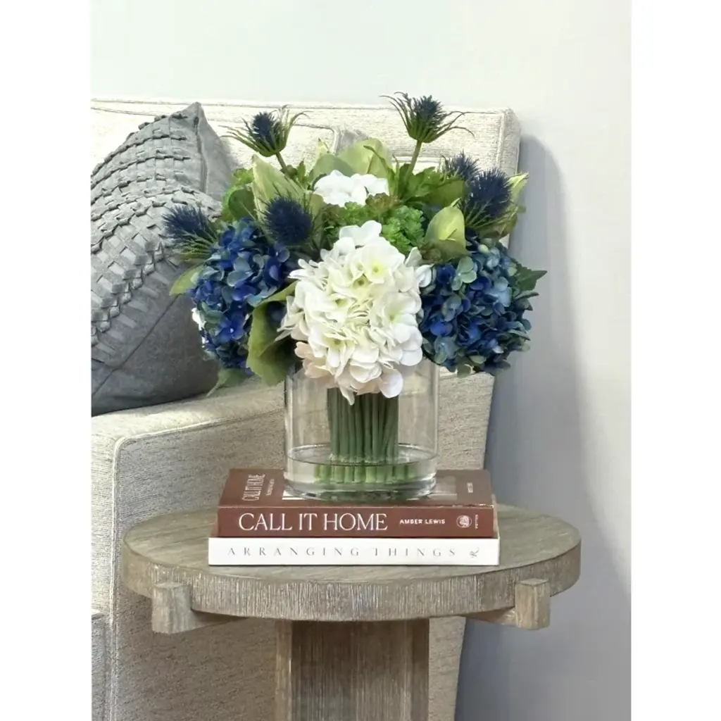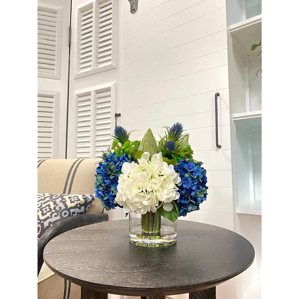 This hydrangea floral arrangement in vase will make a lovely addition to your home or office. This hydrangea floral arrangement in the vase will complement any décor or occasion.