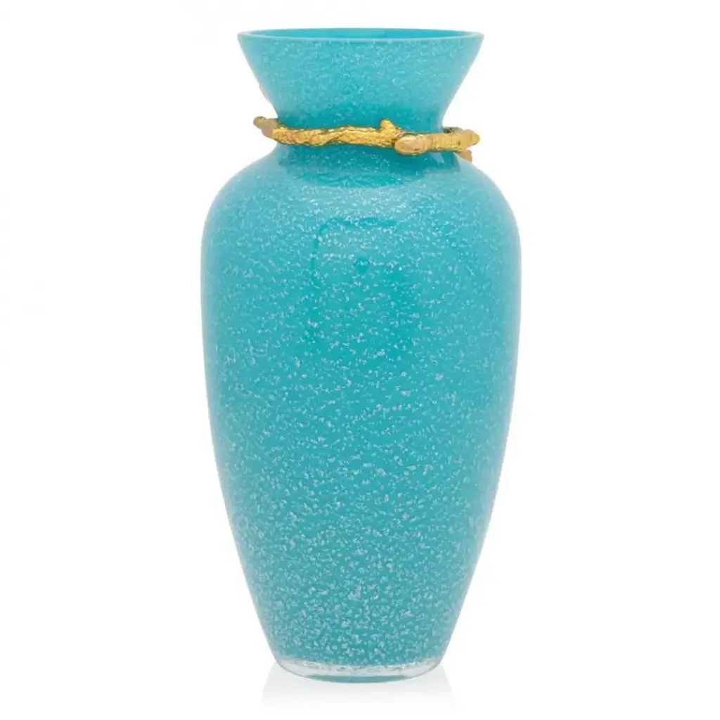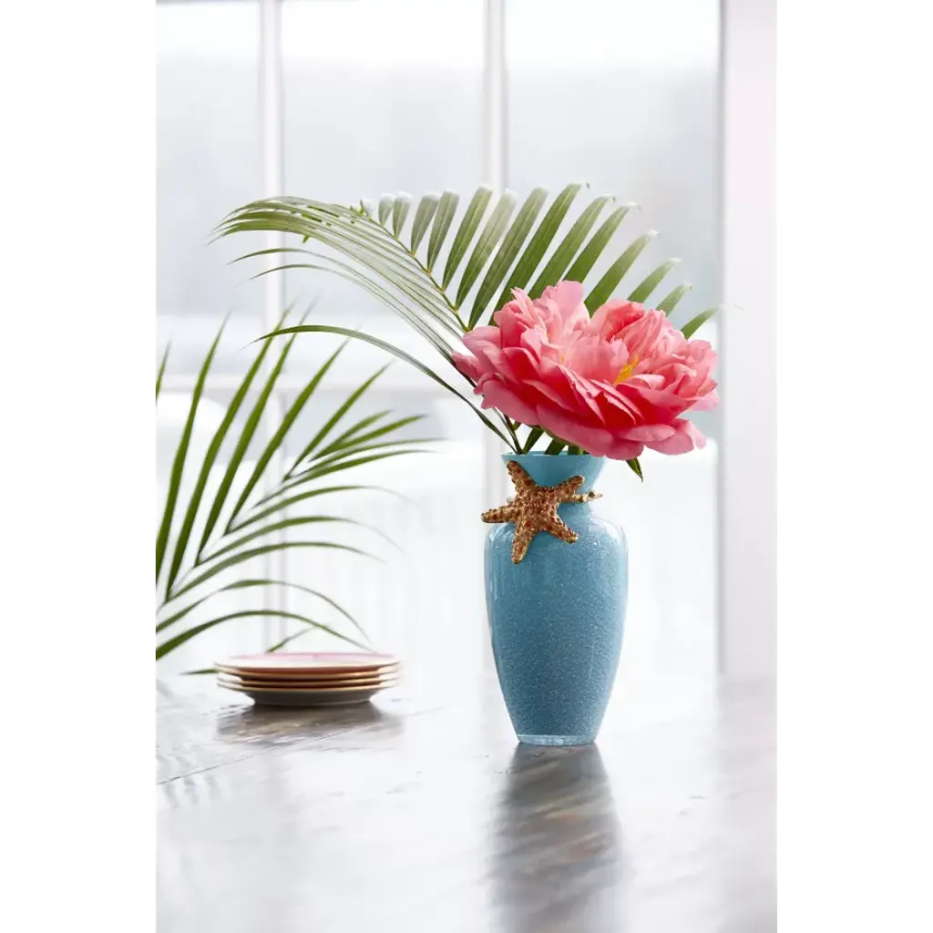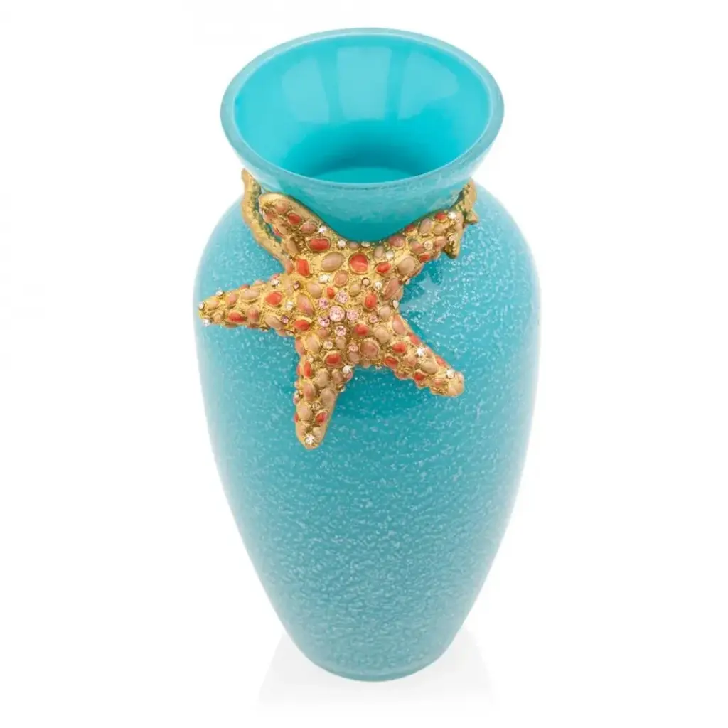 A whimsical jeweled starfish rests at the neck of this beautiful turquoise glass vase. Each Asteria Starfish vase begins with the mouth-blown glass vase - speckled in silver – wrapped in a 14K Gold finished metal collar. Individually painted in coral shades of enamel and hand-set with sparkling crystals. A great pop of color on its own and equally pretty filled with flowers!