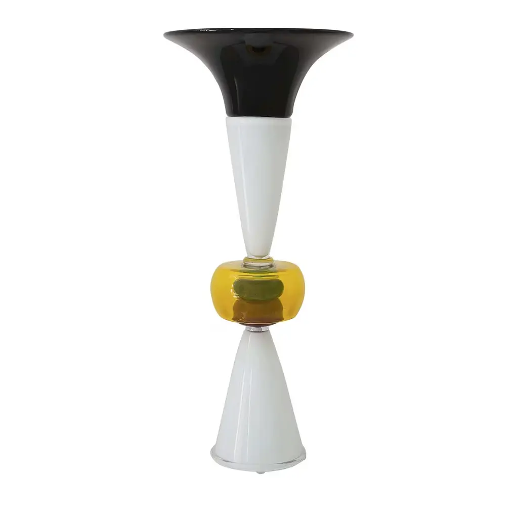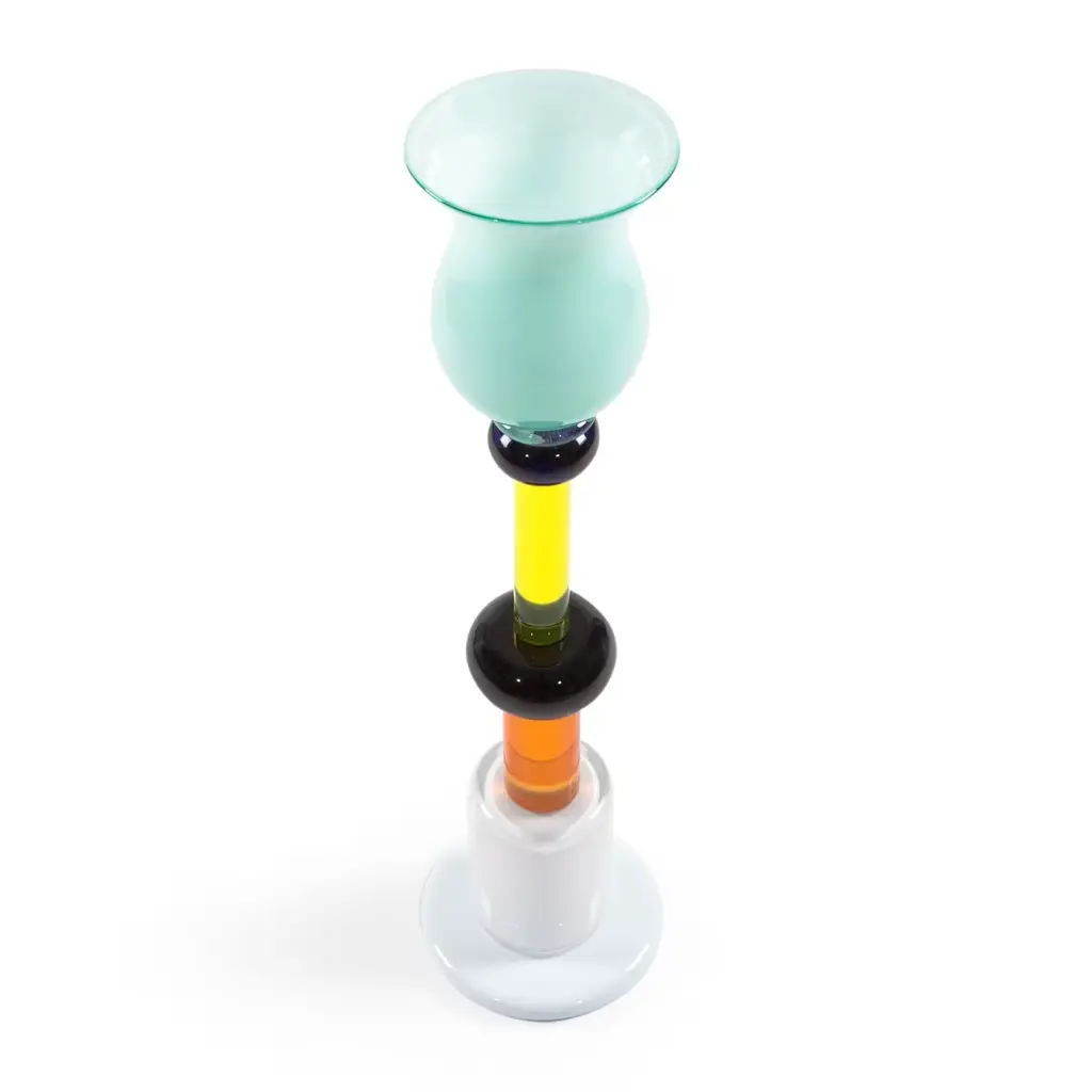 A superb piece of decor designed by Ettore Sottsass in 1986, this vase of mouth-blown Murano glass is part of the Vetri Glass Collection. Its eclectic combination of shapes and colors is distinctive of the postmodernist aesthetic of Memphis and will stand out in a contemporary interior, either as a sculptural decoration or vessel for a flower arrangement. It is signed "E.Sottsass per Memphis." Due to the hand-crafting production process, sizes, and colors might slightly change from the ones in the photo.