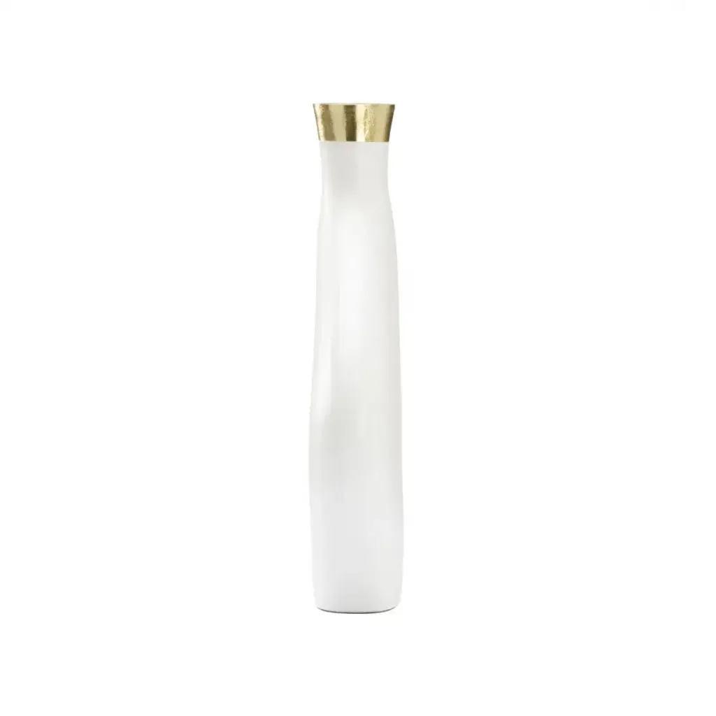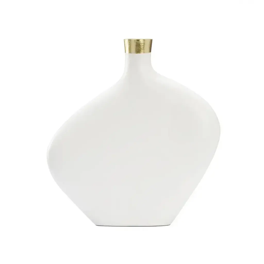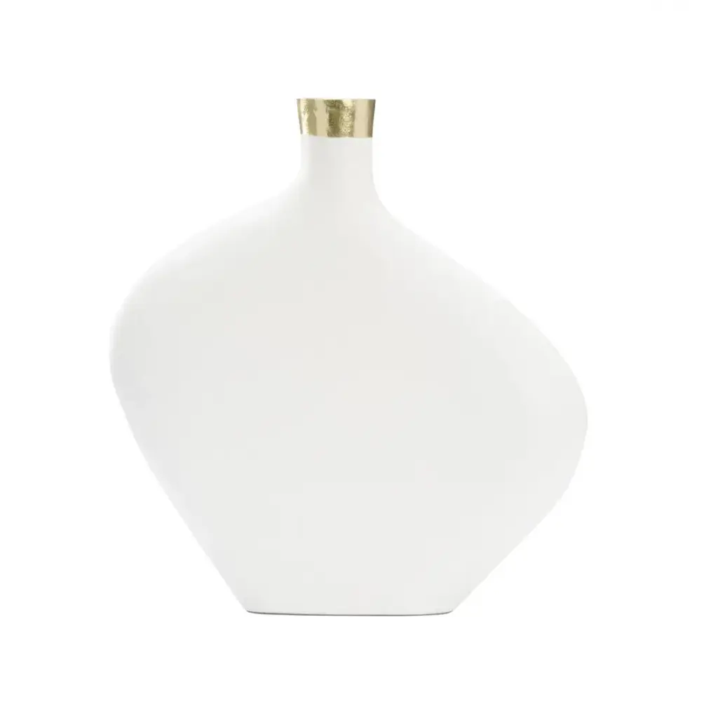 UNIQUE AND SOPHISTICATED, ASYMMETRIC VASE WITH A CHALKY WHITE FINISH AND GOLD BANDED ACCENT.
