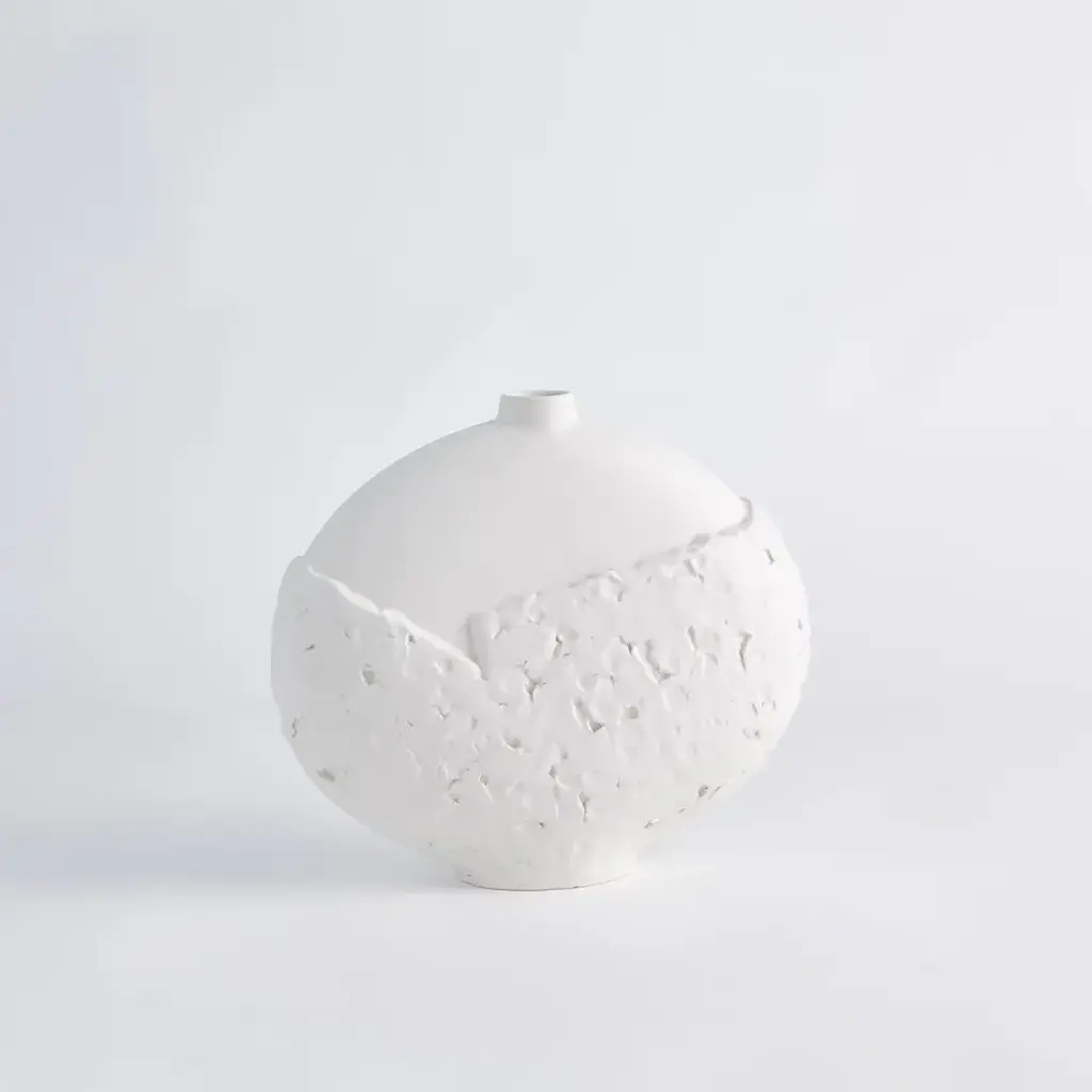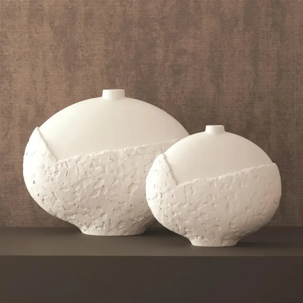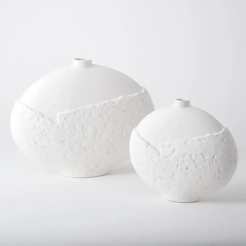 Made from Portuguese ceramic, our Asymmetrical Stipple Vases feature a surface that mimics the artistic technique of Stippling. The flat, round body of these vases is smooth on the upper half, while the bottom is seemingly wrapped in a rough texture. From a fashion forward perspective, Global Views offers accessories, furniture, statement lighting, and an assortment of rugs and mirrors to add beauty and joy to your home.