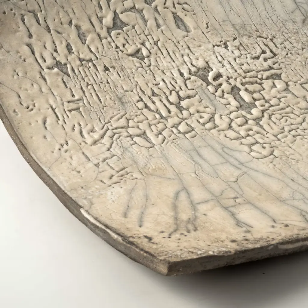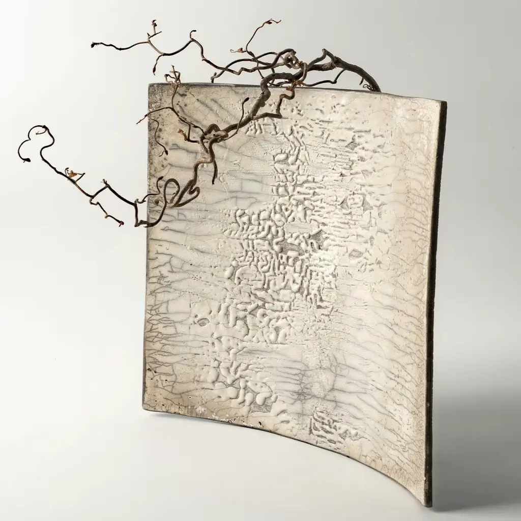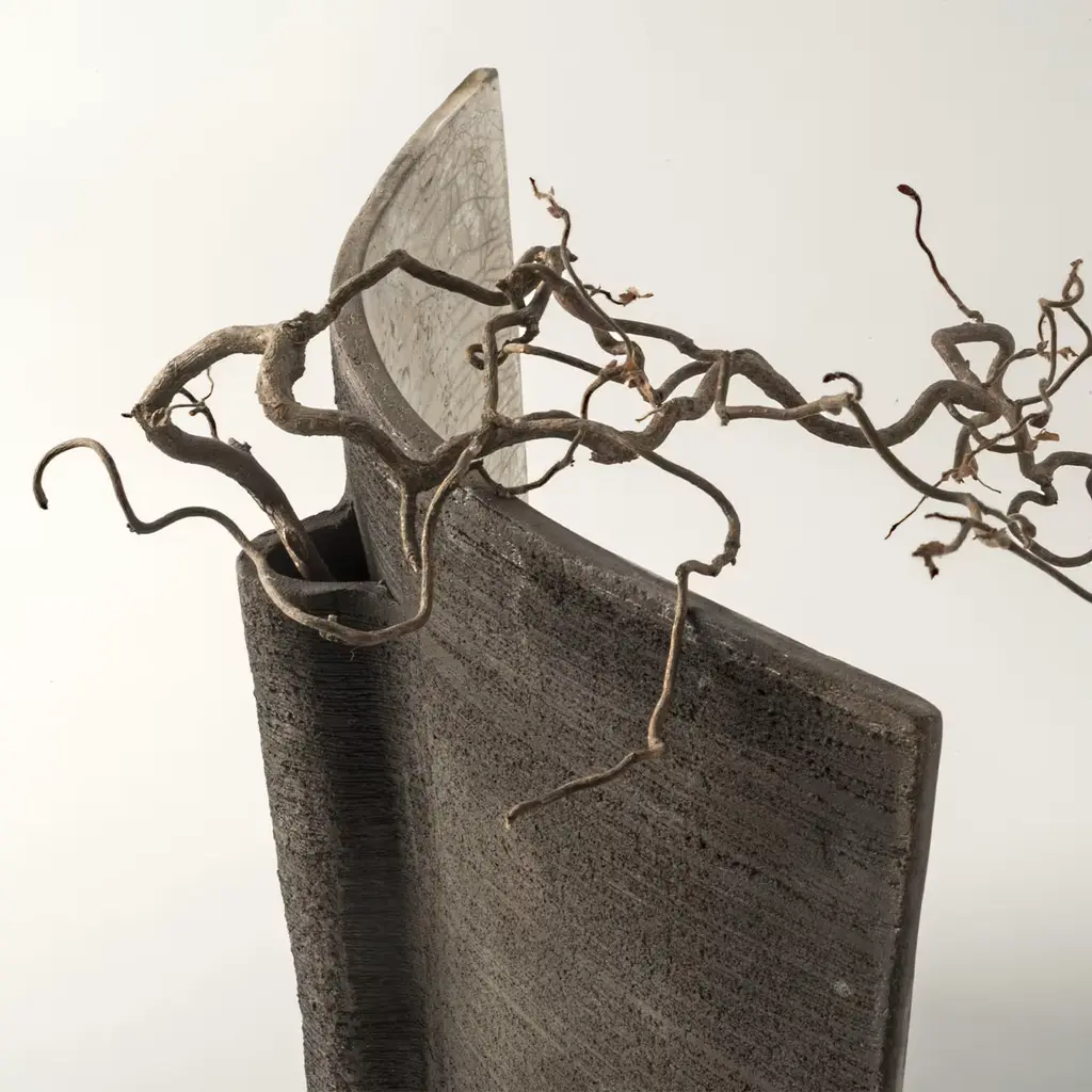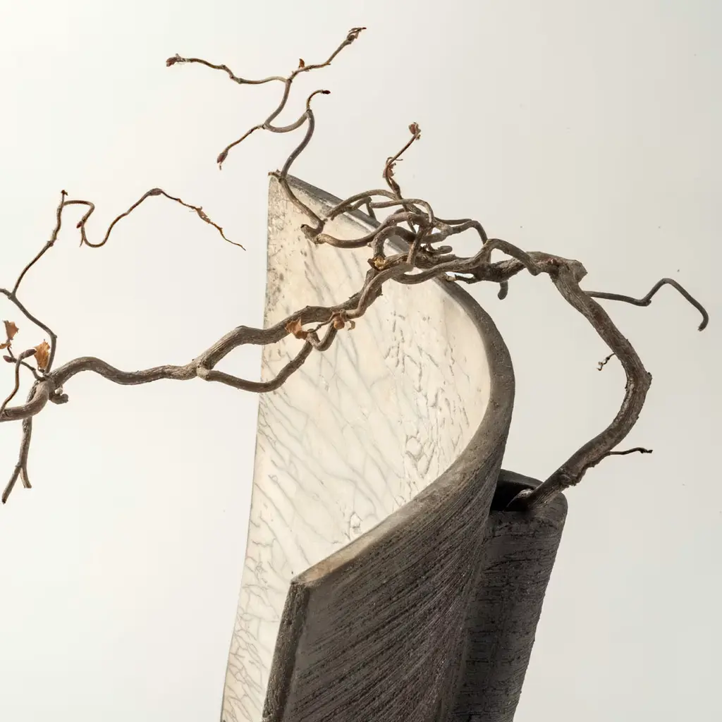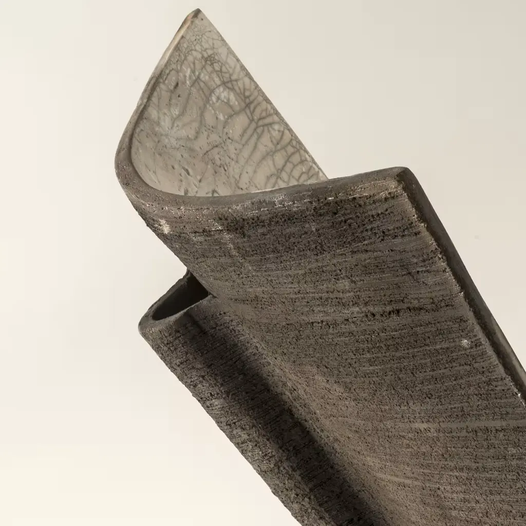 Refined synthesis of harmony and dynamism, this one-of-a-kind ceramic vase by Nino Basso results from the careful following of the ancient Japanese "Raku" technique. A curved ceramic panel boasting a fascinating irregular glazed texture on the beige-glazed front marks its sculptural design, completed by the unglazed back where a long fissure invites Ikebana - the Japanese art of flower arrangement. An authenticity certificate is included.