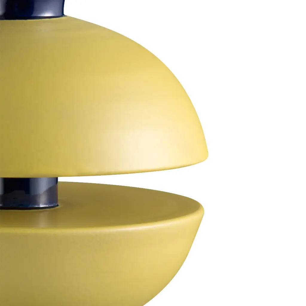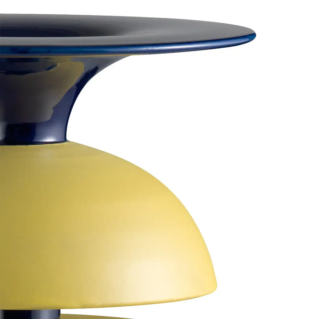 A collection of vases and decorative objects that celebrate the power of imagination and the technique of a great master. Small hand thrown clay vase. Finished in glossy blue glaze for the base and the upper part and matte yellow glaze for the two semispheres. Designed by Roberto Capucci