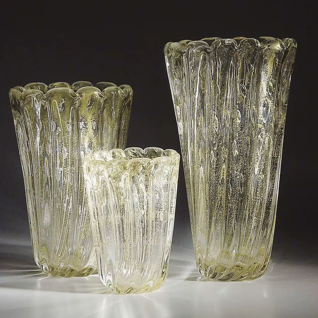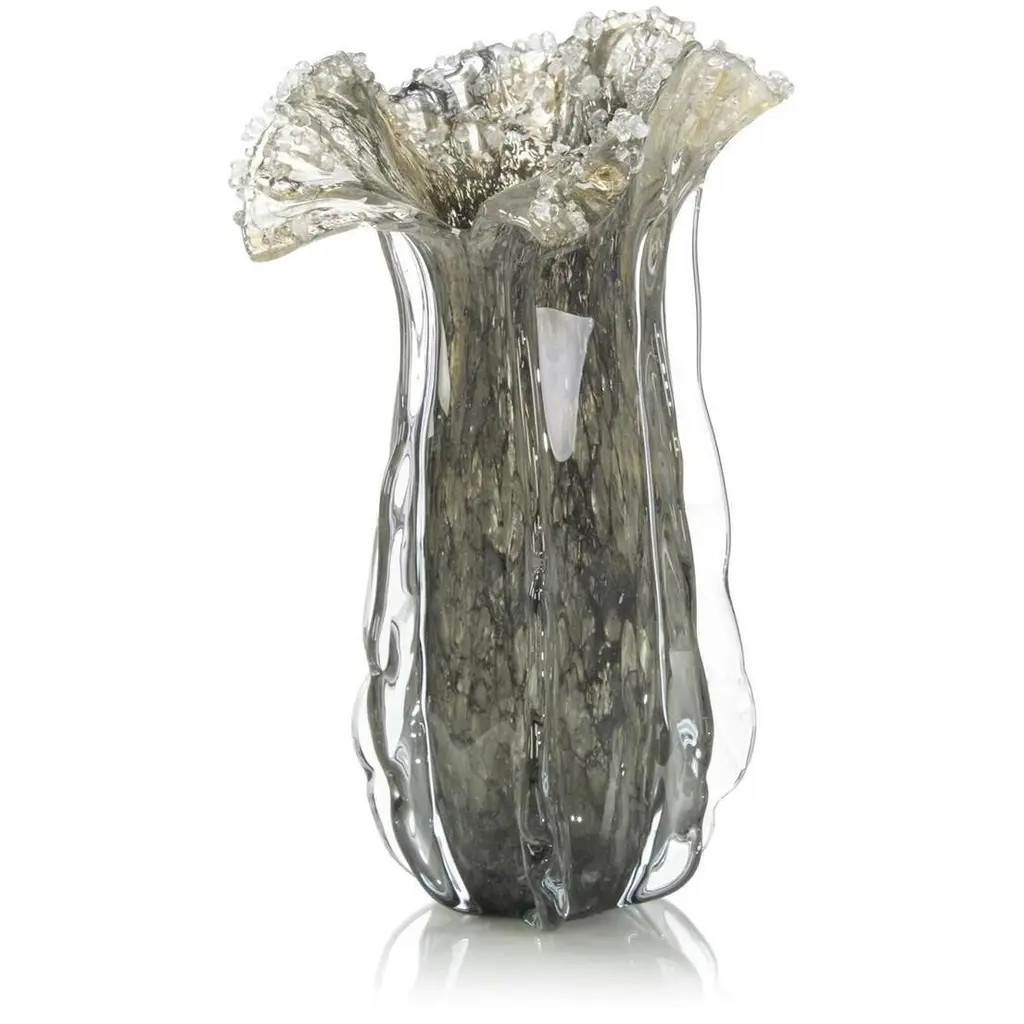 From the Atena Collection, this tall vase showcases the purity and brightness of Murano glass. This vase boasts a tall, slightly flared shape with vertical grooves accented by gold leaf that twist and run along the length of the body to create a dynamic pattern that elongates the silhouette. Displayed with tall-stemmed flowers or on its own, this masterpiece will bring luxury and class into any decor. Available in a variety of color combinations: tobacco brown/gold, white/gold, black/gold, red/gold, and clear/gold, please contact the Concierge.