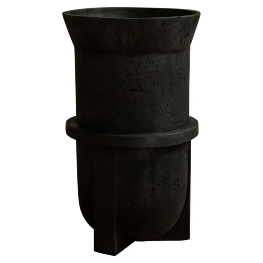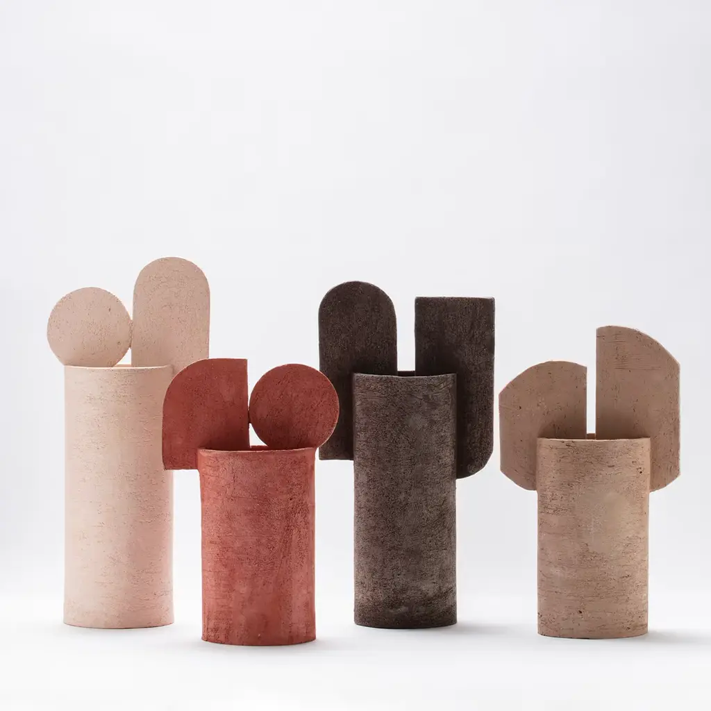 Brimming with ancestral references both its totemic look and primitive name, this vase is part of the Australe Collection of pieces inspired by faraway lands. The silhouette reveals its contemporary flair with the intersection of two geometric elements fixed on the cylindrical base. Fashioned of a mixture of terracotta, the abstract composition distills raw flair in part thanks to the scratchy texture on the hazel-finished silhouette.