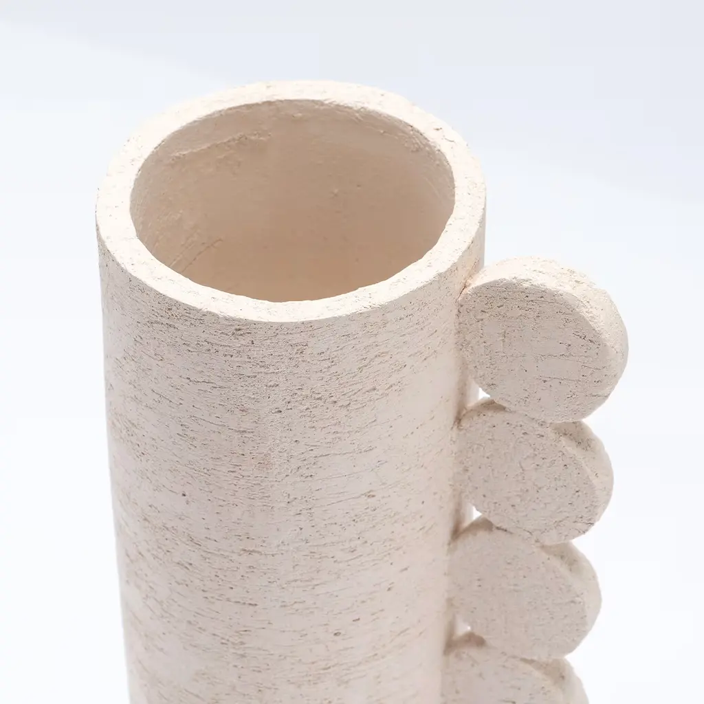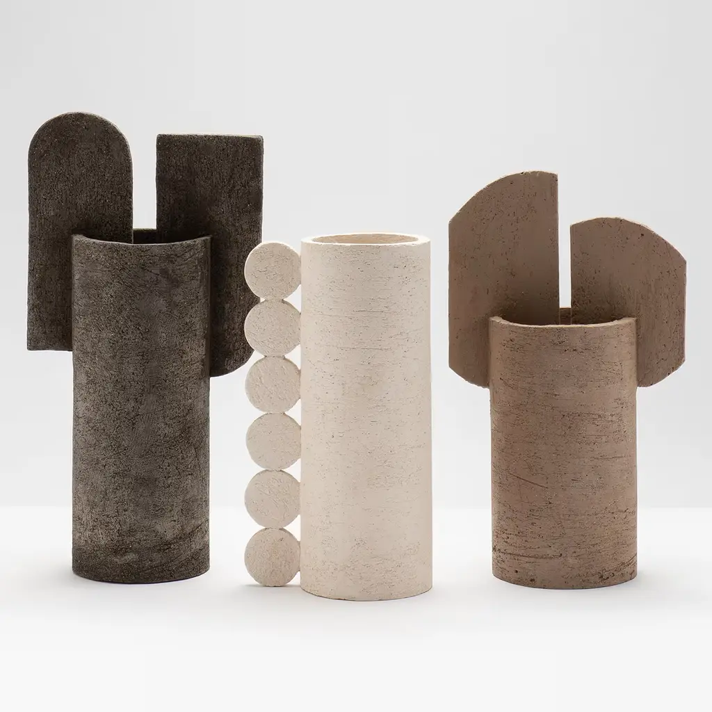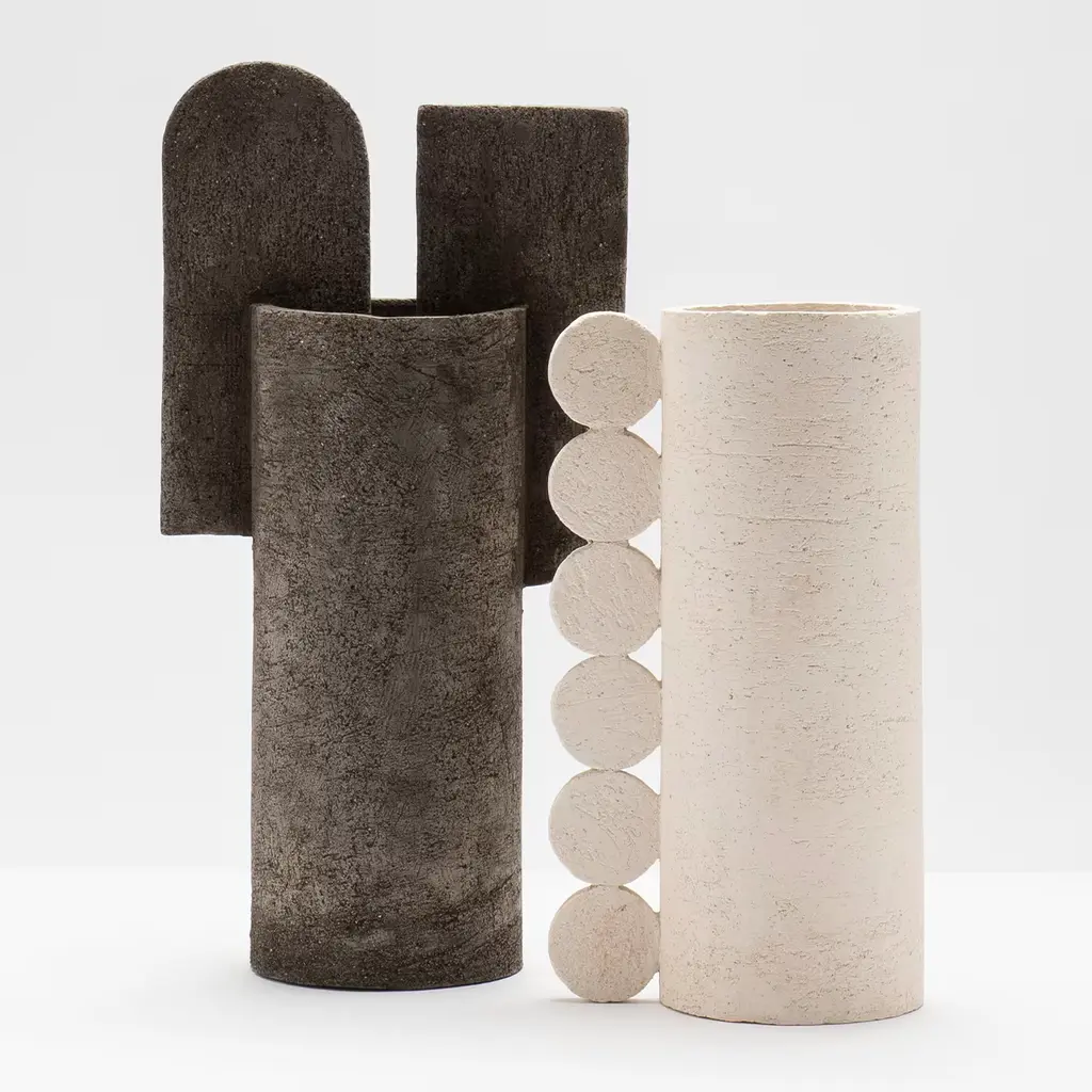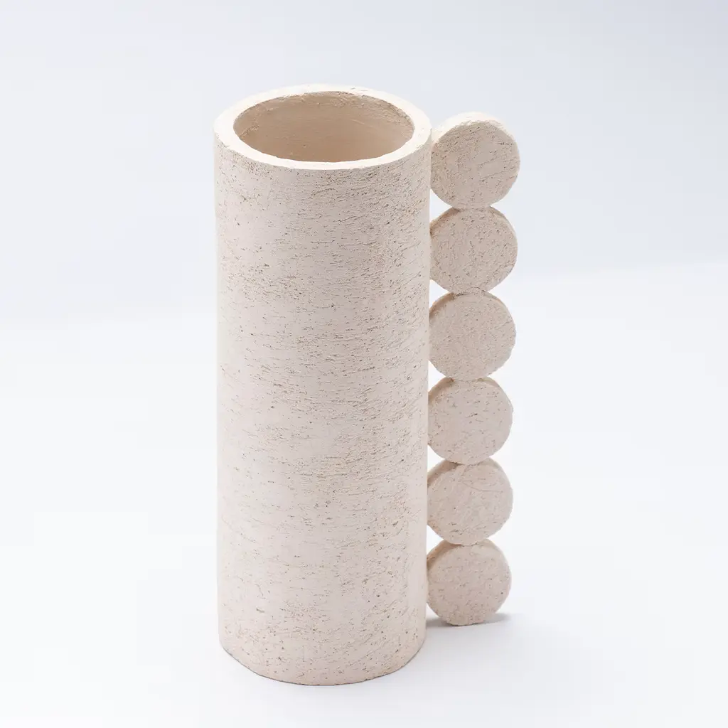 A sculptural design evoking totemic volumes from wild, faraway lands, this bright vase belongs to the Australe series of one-off pieces pooled together by an ancestral feel. The deliberately unfinished, scratchy texture reinforces this bond with the Earth, obtained by working with a mixture of light terracottas. a sequence of six piled circles is fitted to the cylindrical body and together reveal the design's contemporary soul.