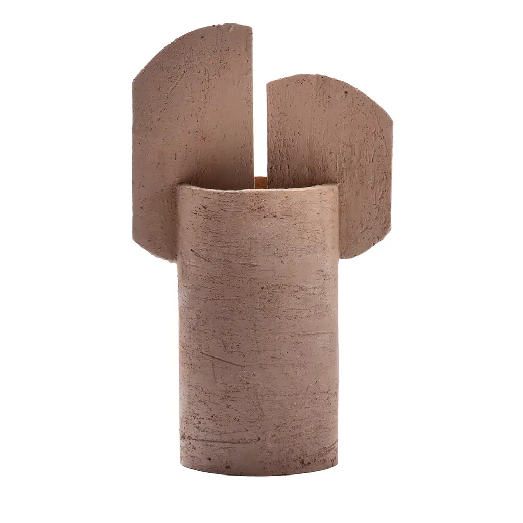 Inspired by the warm earthy tones of wild, faraway lands, this vase is a captivating design from the Australe Collection of pieces also named after primitive sounds to heighten their evocative effect. A cylindrical volume is embellished with a circle and another geometric insert at the top distinguished with a scratchy texture and intense brick-red color of the terracotta.